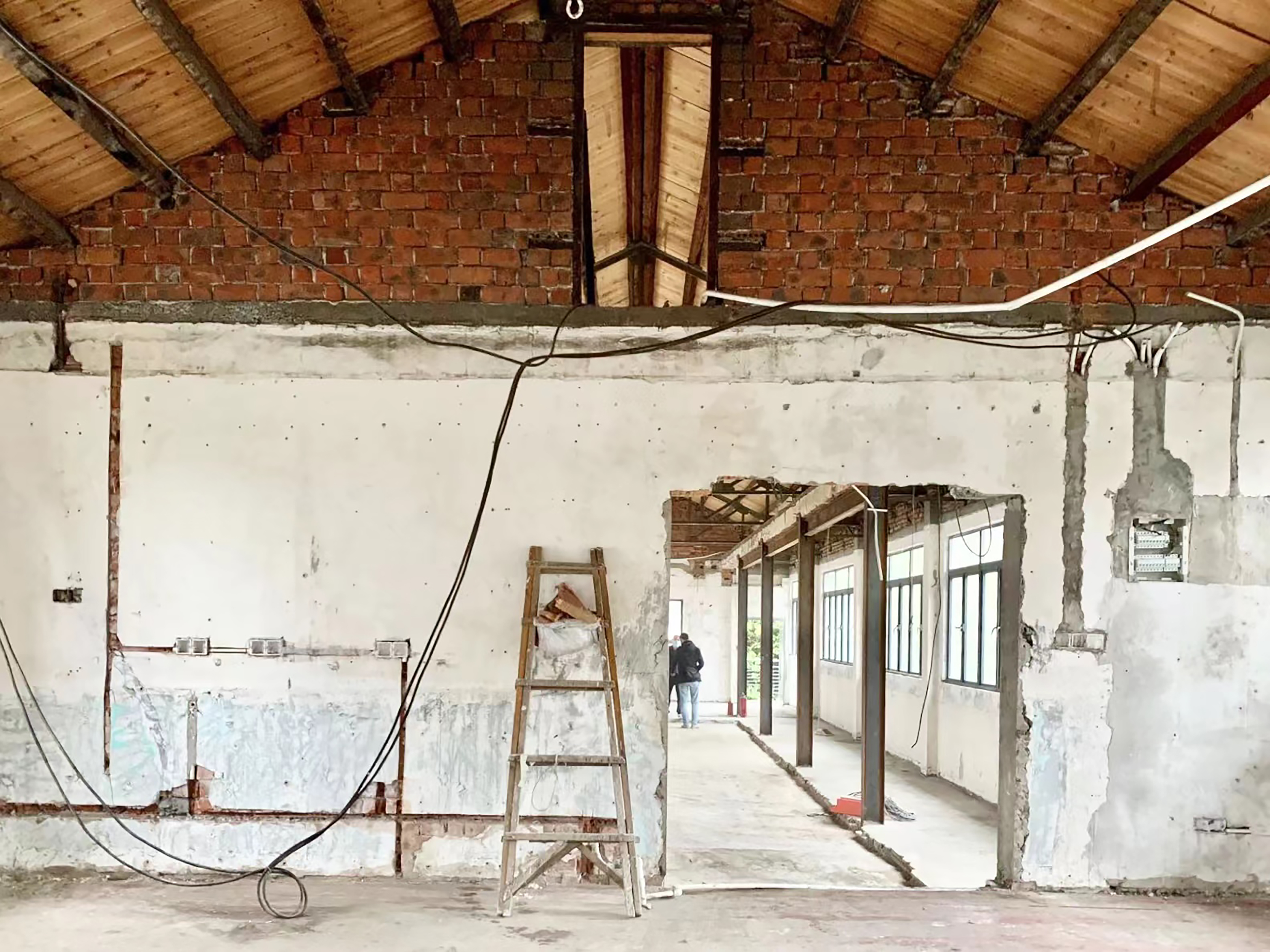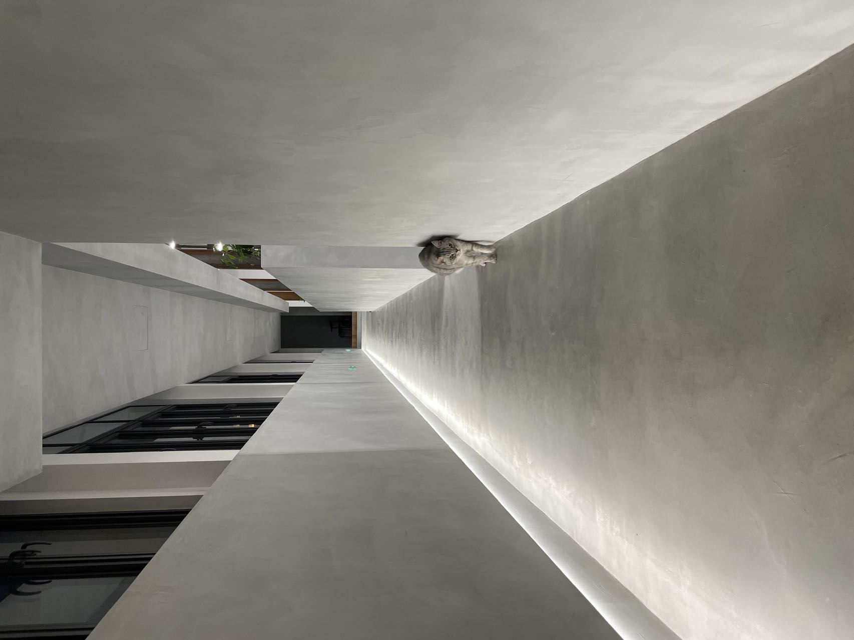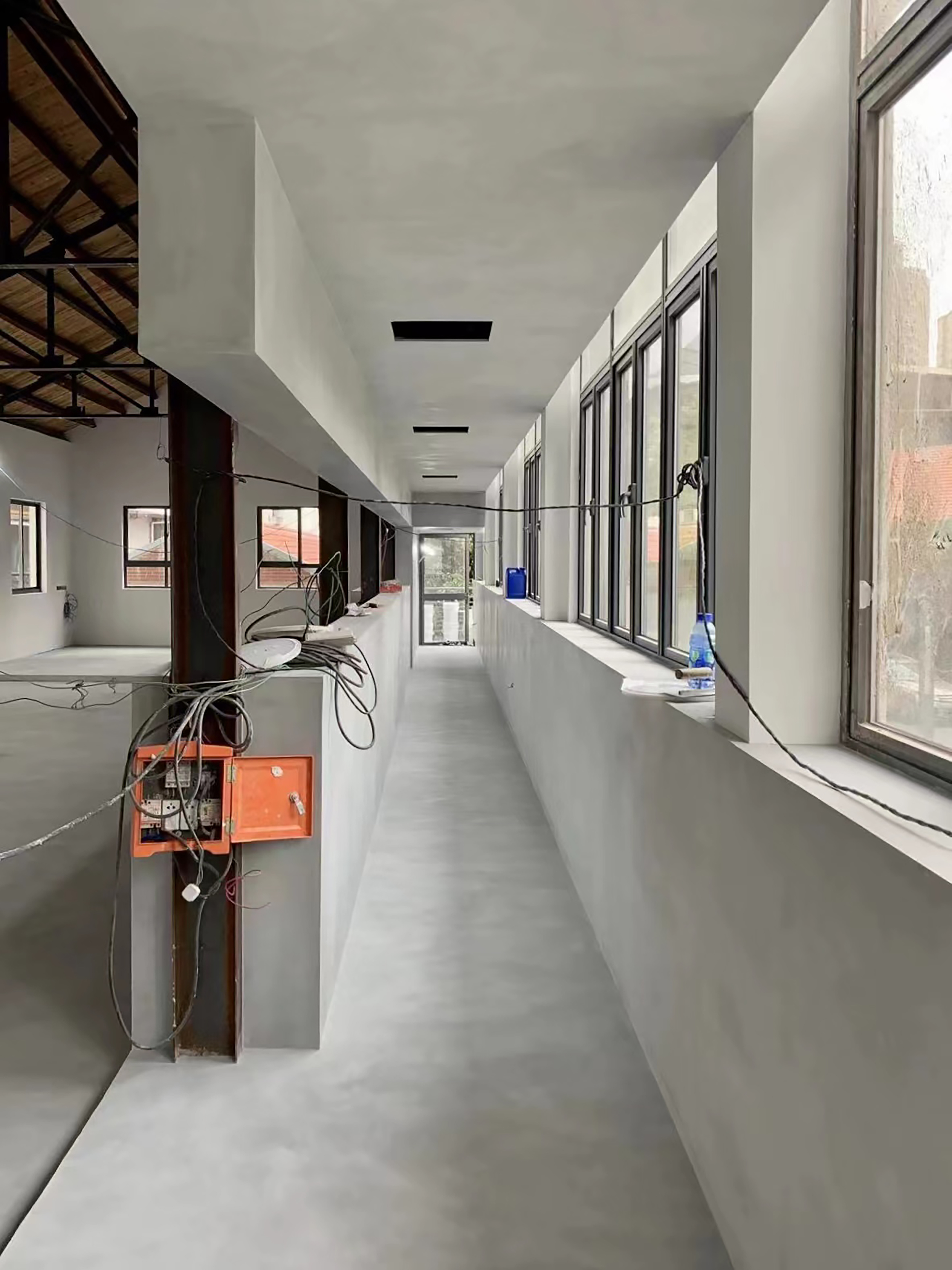 We renovated the interior of the original building, red I-steel and roof trusses are preserved, while a semi-open micro-concrete walkway runs north and south from the entrance to the terrace.