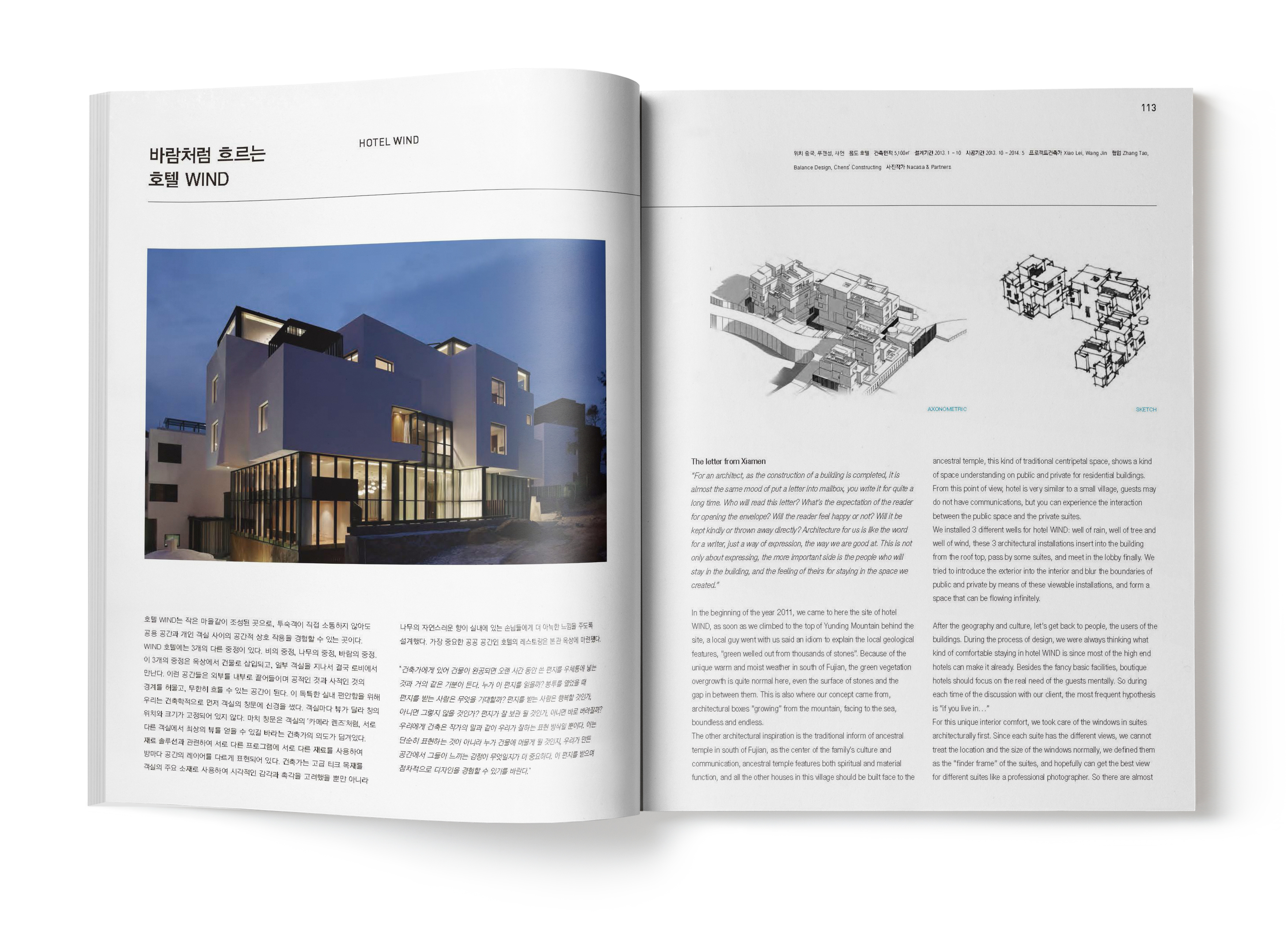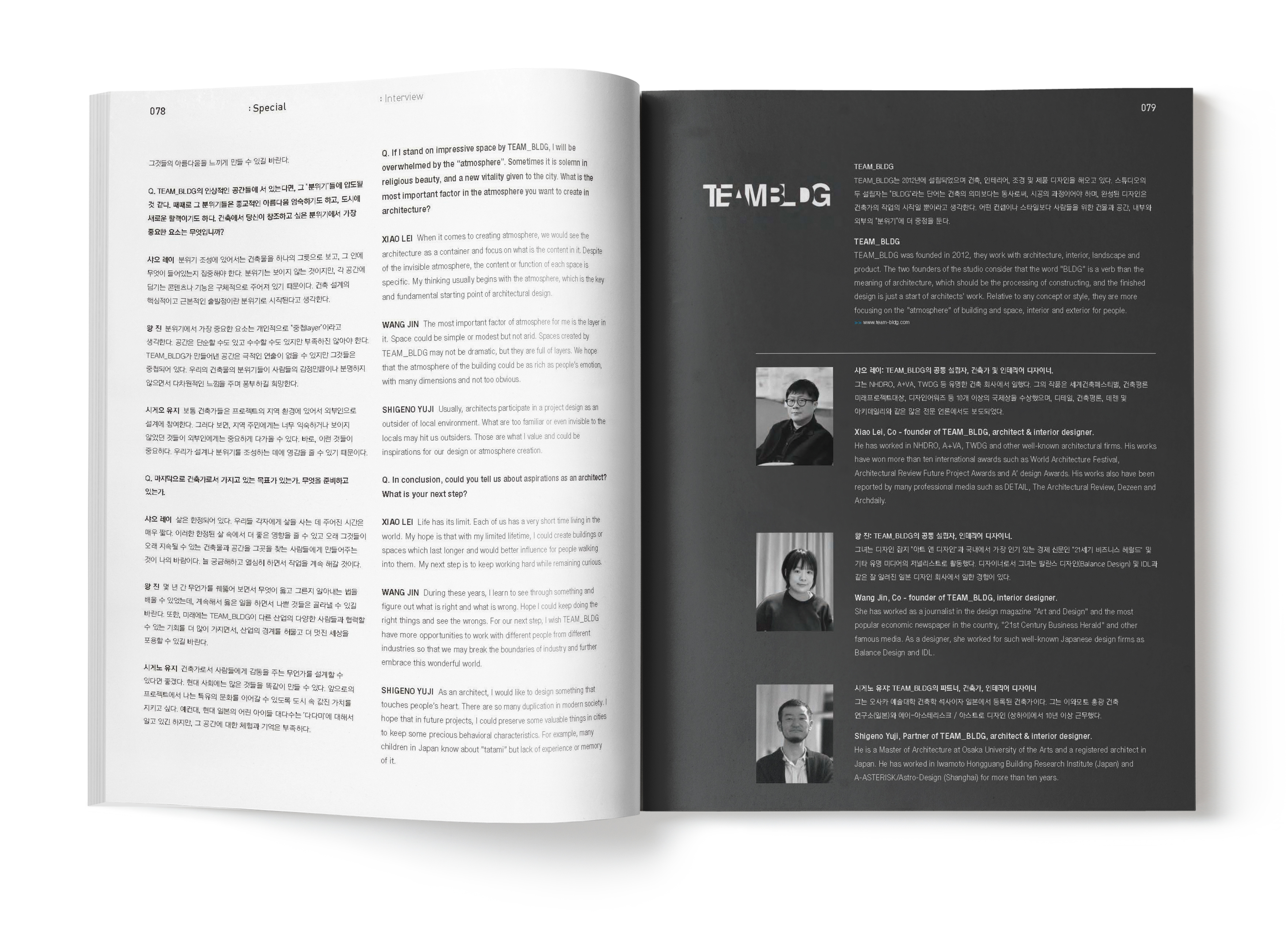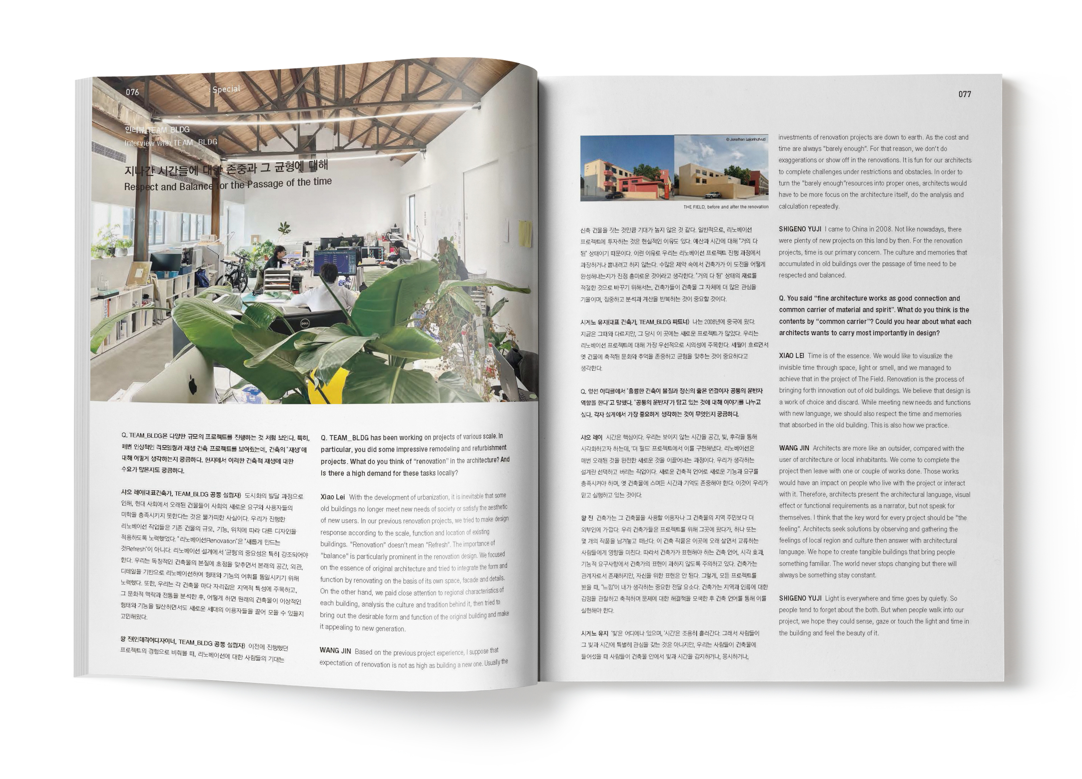 Invited by ARCHITECTURE&CULTURE, Architect Special consists of two parts: The first part shows a detailed introduction of the design idea, recent development and three core members of firm: Xiao Lei, Wang Jin, Shigeno Yuji. The second part shows seven completed works of TEAM_BLDG in recent years, including「VOID」、「THE FIELD」、「THE VILLAGE」、「THE HAKKA TRIANGLE HOUSE」、「NEW ARCADE」,「INSIDE THE CLOUD」and「HOTEL WIND」.