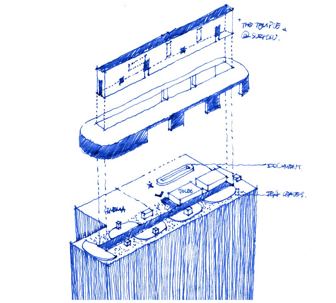 在走道外部的空间里,我们加入了弧形的平台呼应场地本身的弧形空间,一些平台用白色半透的窗帘包裹,形成私密的佛像展示空间,另一些弧形平台则完全敞开。人们通过门洞走进私密的用帘子包裹的佛像空间时,可以感受到与佛像独处片刻的宁静,而走到开敞的平台上时,又可以从外部欣赏佛像与空间形成的视觉层次。