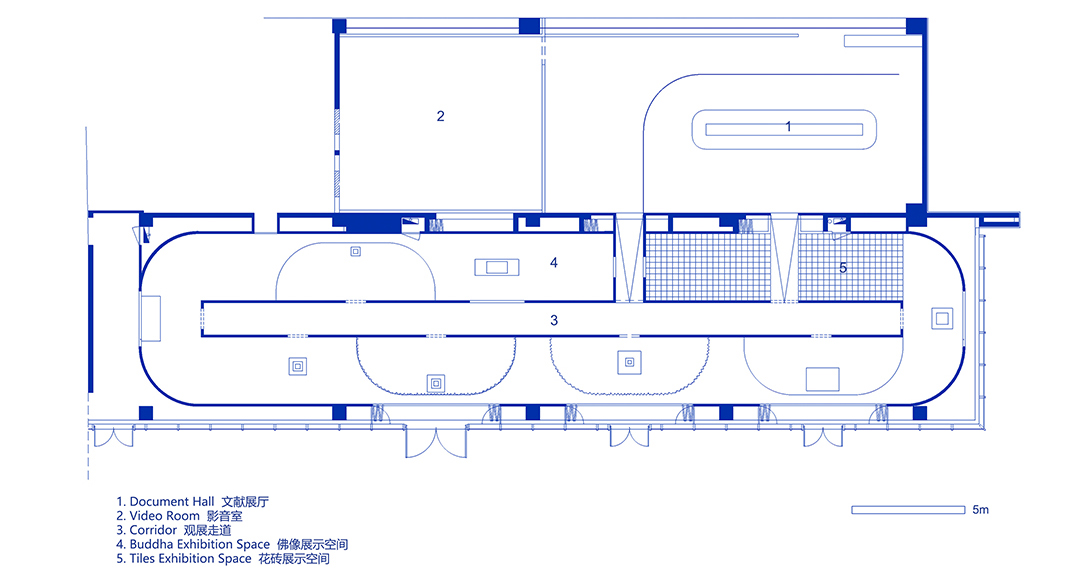So we thought of adding a dark, narrow volume in the middle of the exhibition hall as the main streamline space for the exhibition, embedded in the middle of the opening of the ceiling. The long, dark corridor is actually a space for depriving people of their senses. The human vision is locked at the two Buddha statues at the end of the corridor. And in this case, people's spirit can also be relatively concentrated. This 1.4-meter-wide corridor is just enough for two people walking side by side. Inside the corridor, the wall are dark blue painted, and the blue velvet-like texture is slightly exposed without lighting inside.