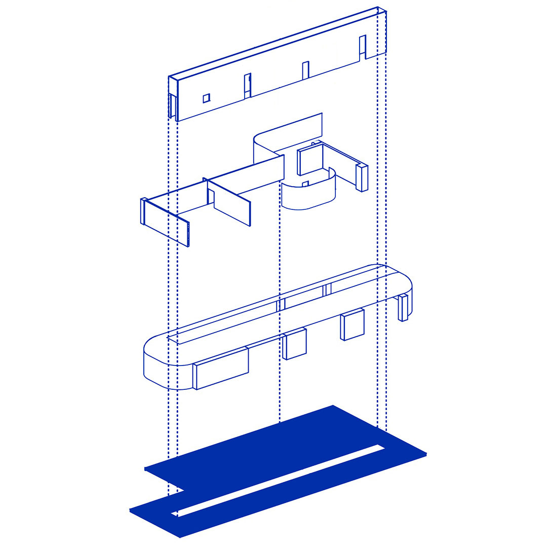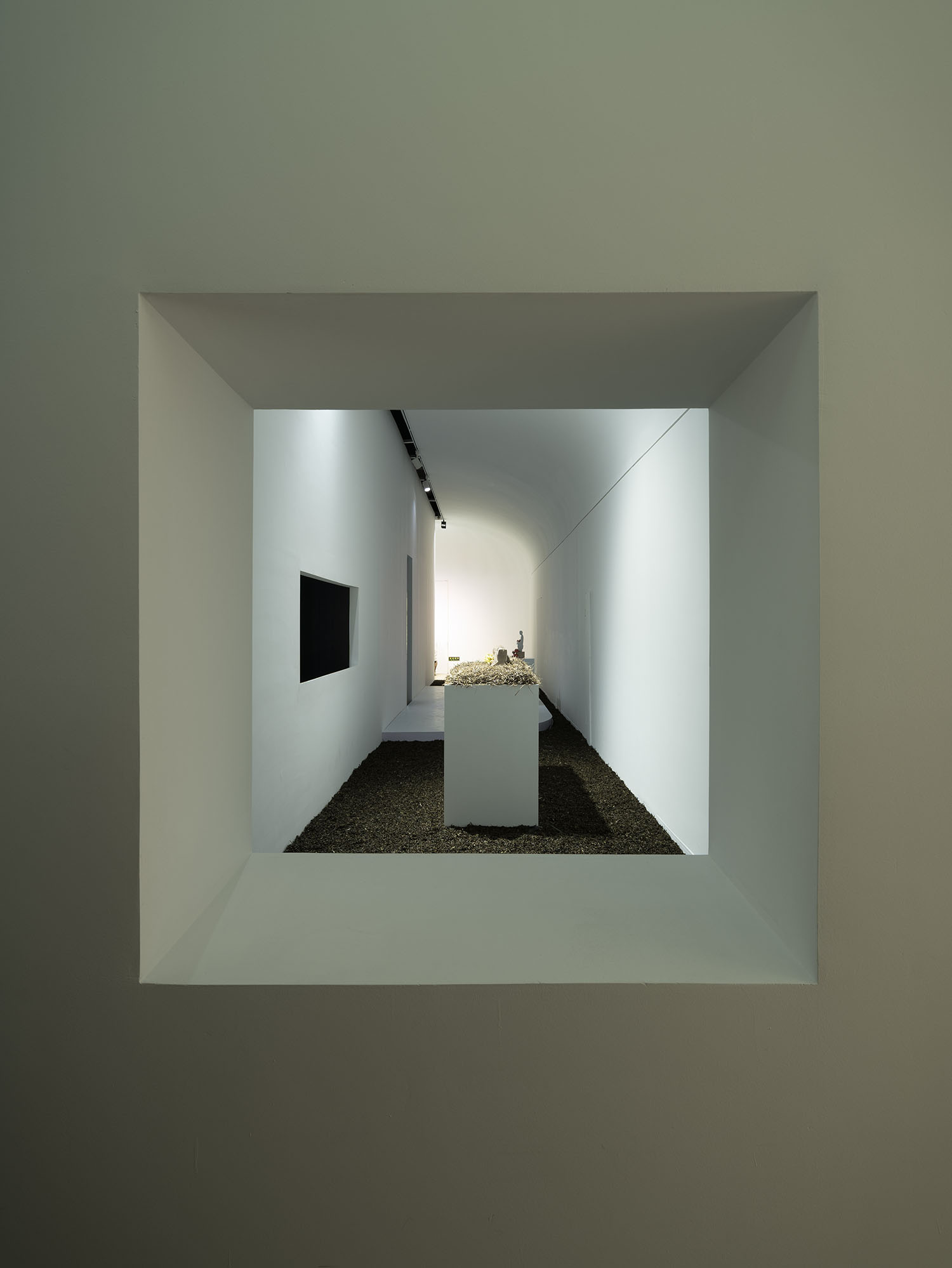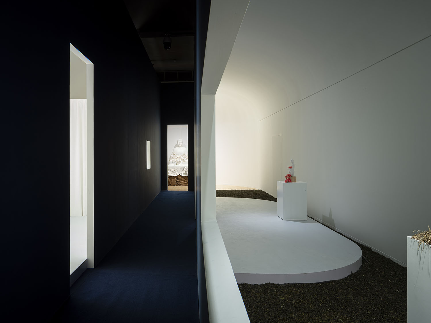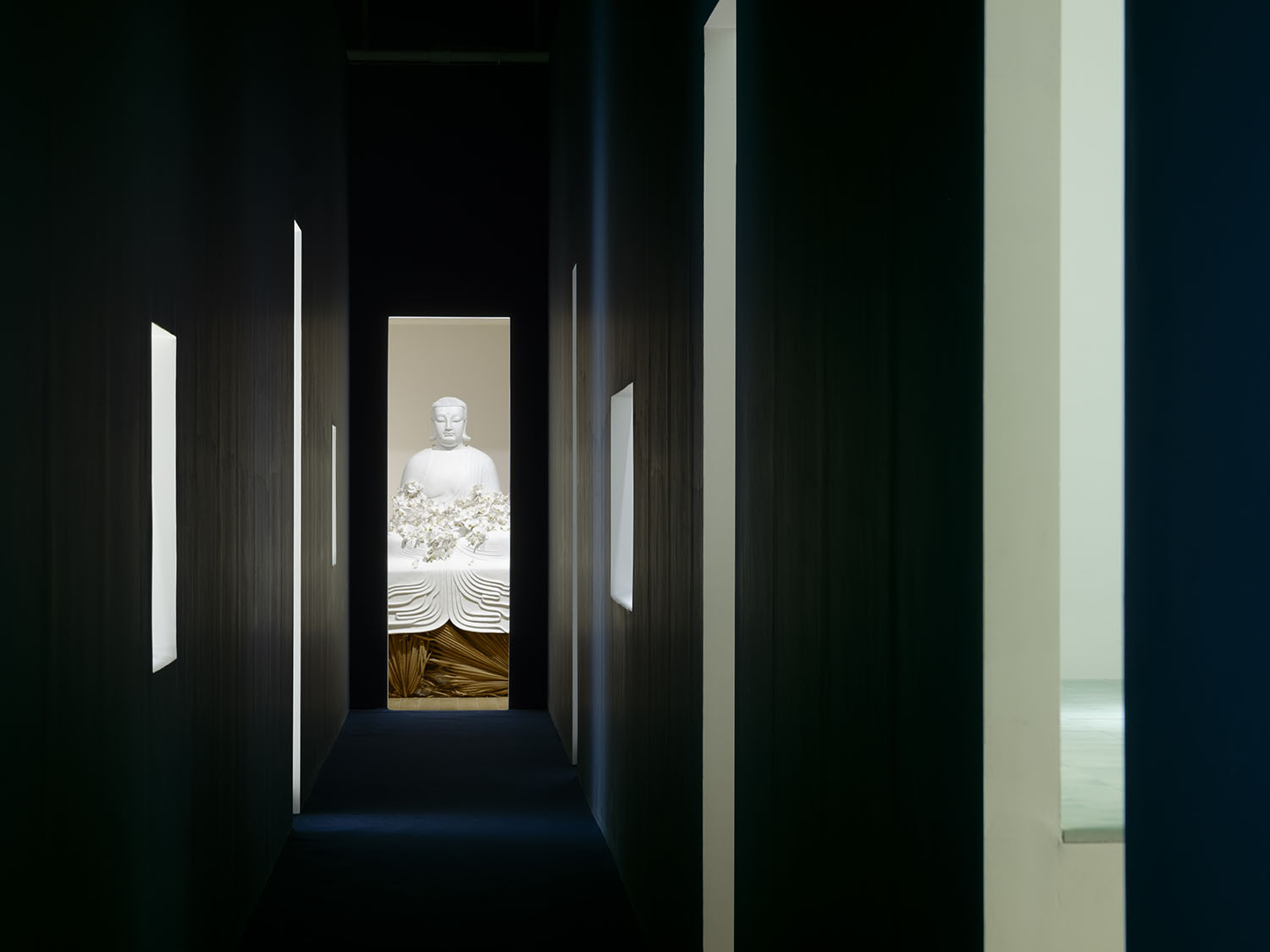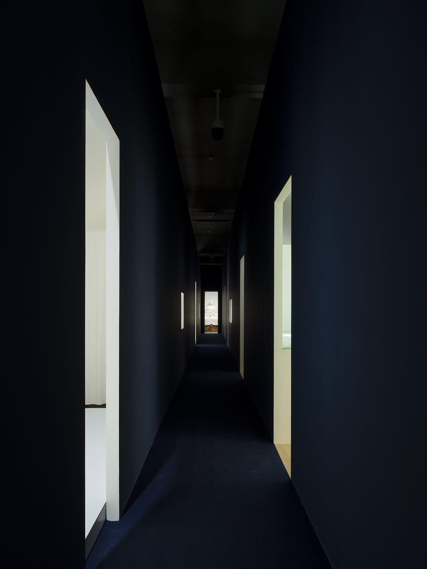 于是我们想到在展厅中间加入一个黑暗的、狭长的体量,作为观展的主要流线空间,嵌入吊顶的开口中间。长长的、黑暗的走道其实是剥夺人感官的一个空间,人的视觉被锁定在走道尽端的两尊佛像上,在这种情况下,人们的精神也可以相对集中。这个只有1.4米宽的走道刚好能容纳两个人并肩而行,在走道中,走道内侧的墙壁上是深蓝色的涂料,在内部没有灯光照明的情况下微微泛出蓝丝绒一样的质感。
