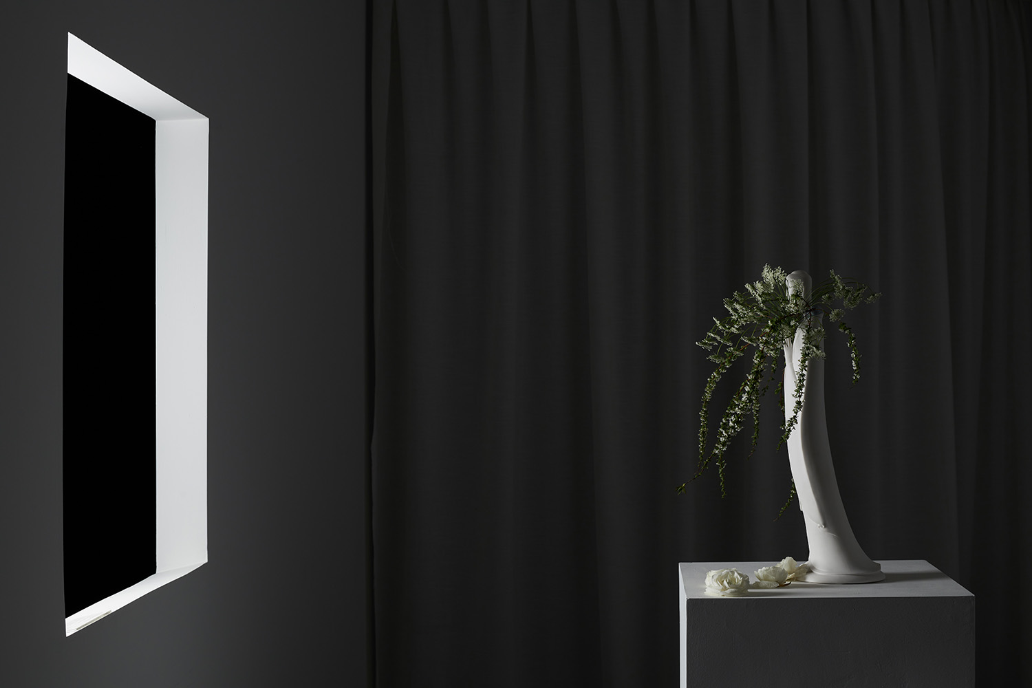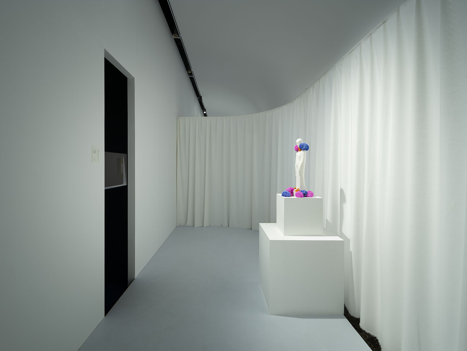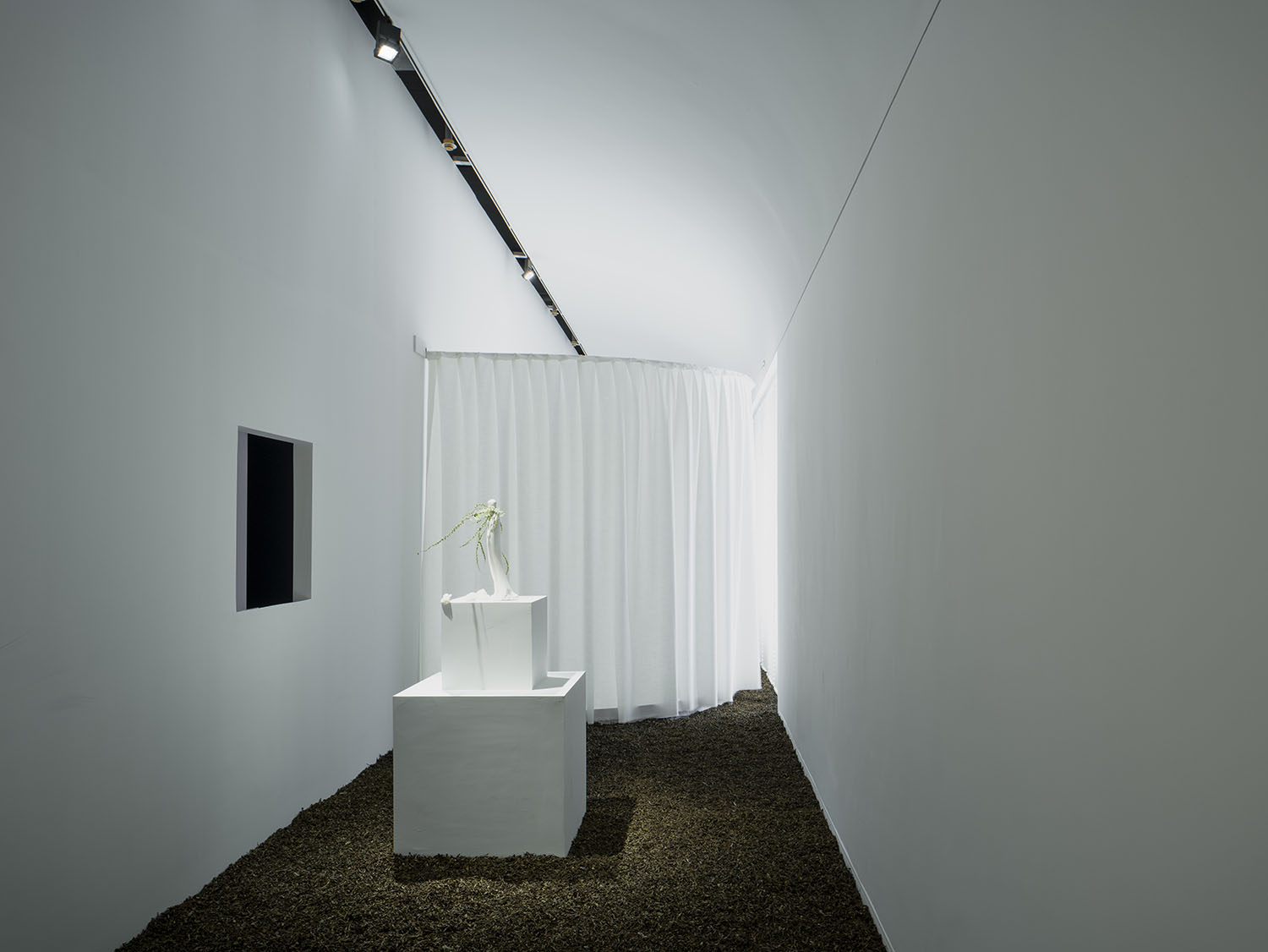 A new olfactory sensory experience is also added to the whole space, that is, the tea leaves of Wuyi Mountain covering the ground, which after baked whose fragrant throughout the space. Dark tea leaves form a withered form on the ground like soil, in sharp contrast to the original fresh flowers surrounding on the Buddha statue, symbolizing a fatal cycle from life to death. The white curtains fall directly on the tea leaves, forming a ambiguous boundary between indoor and outdoor.
