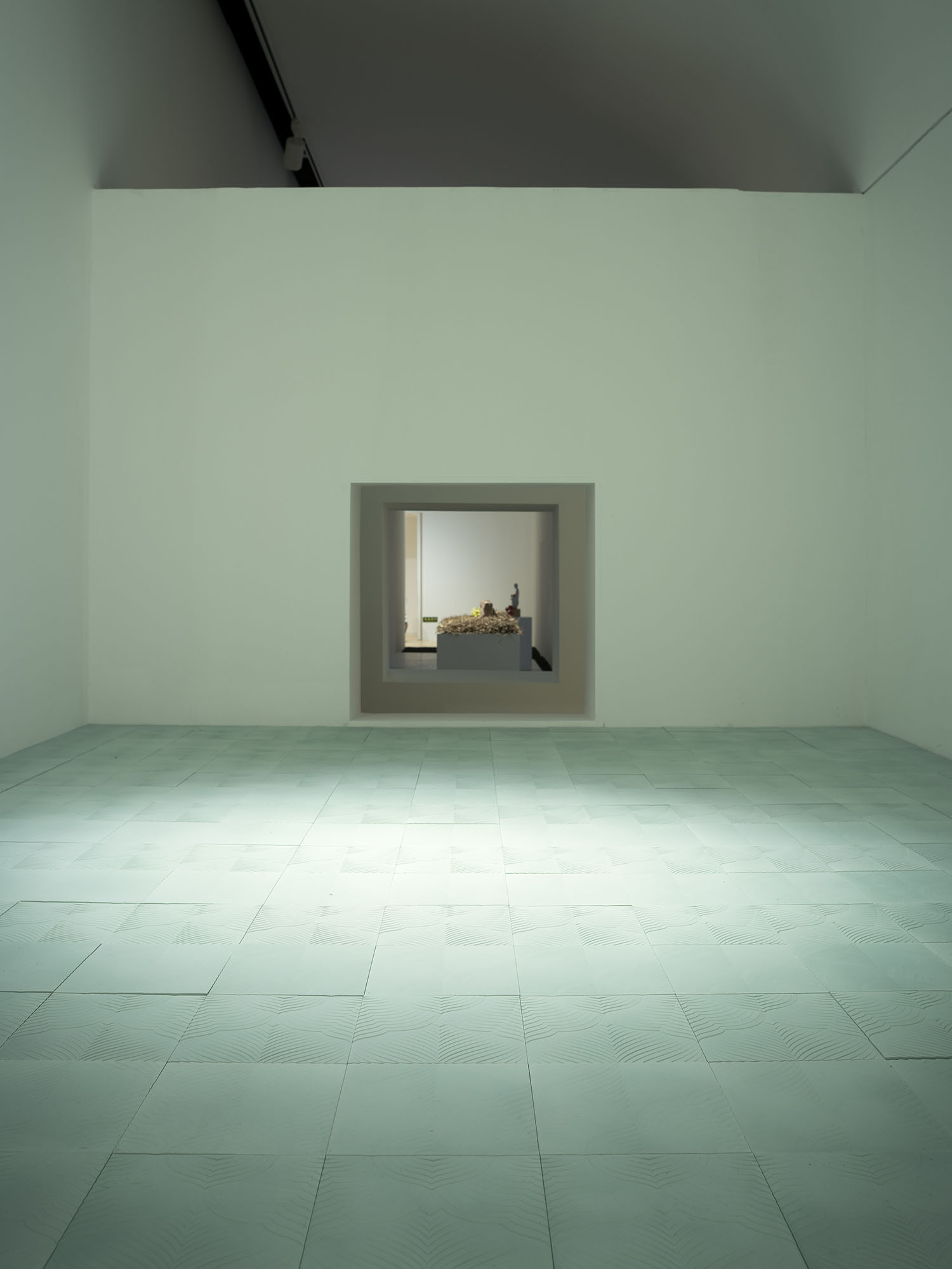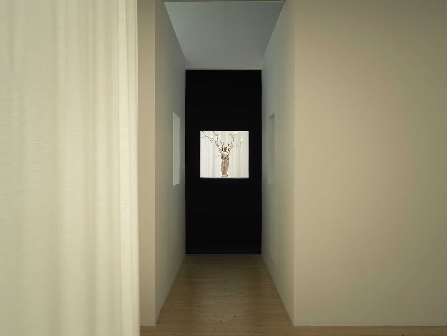 在整个空间里还加入了一个新的嗅觉感官体验,即是满铺在地面上的武夷山黄叶,这些黄叶经过烘焙,香味在整个空间中弥漫开来。深色的黄叶在地面上形成一种像泥土一样的枯萎形态,与最初佛像上的鲜花形成鲜明的对比,象征从生命到死亡的一个命定的轮回。而白色窗帘直接落在黄叶上,形成了一种室内与室外一般的模糊界限。
