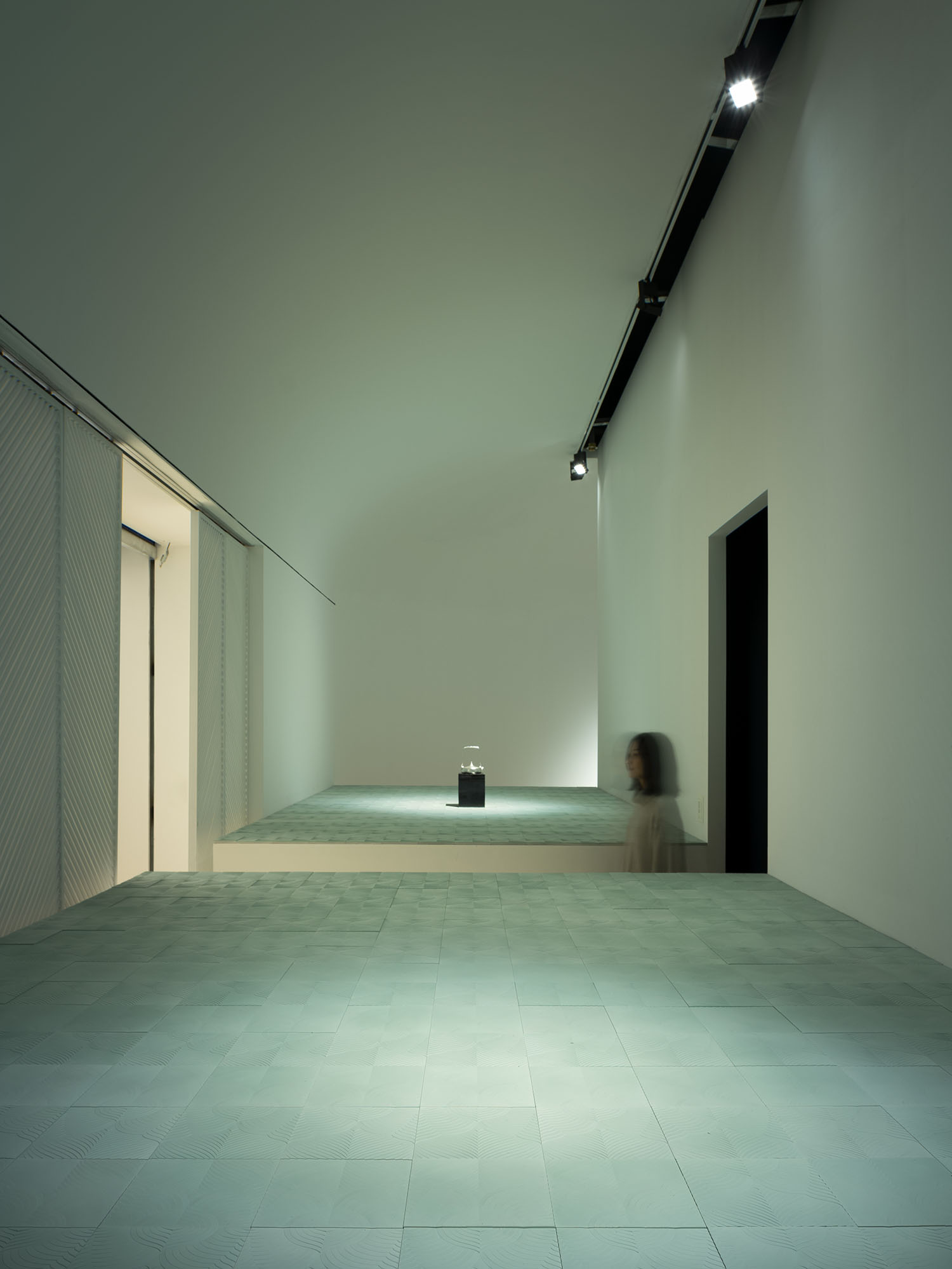 花砖空间是展览空间中触觉设计的主要部分,通过将满铺的花砖抬高到人手可以触及的高度上,使人们可以近距离的观看和触摸花砖上的美妙纹理。这些纹理灵感来自于佛像飘逸的衣摆,与淡绿色的花砖结合在一起,就像水面泛起的涟漪,使人感到内心的平和与宁静。