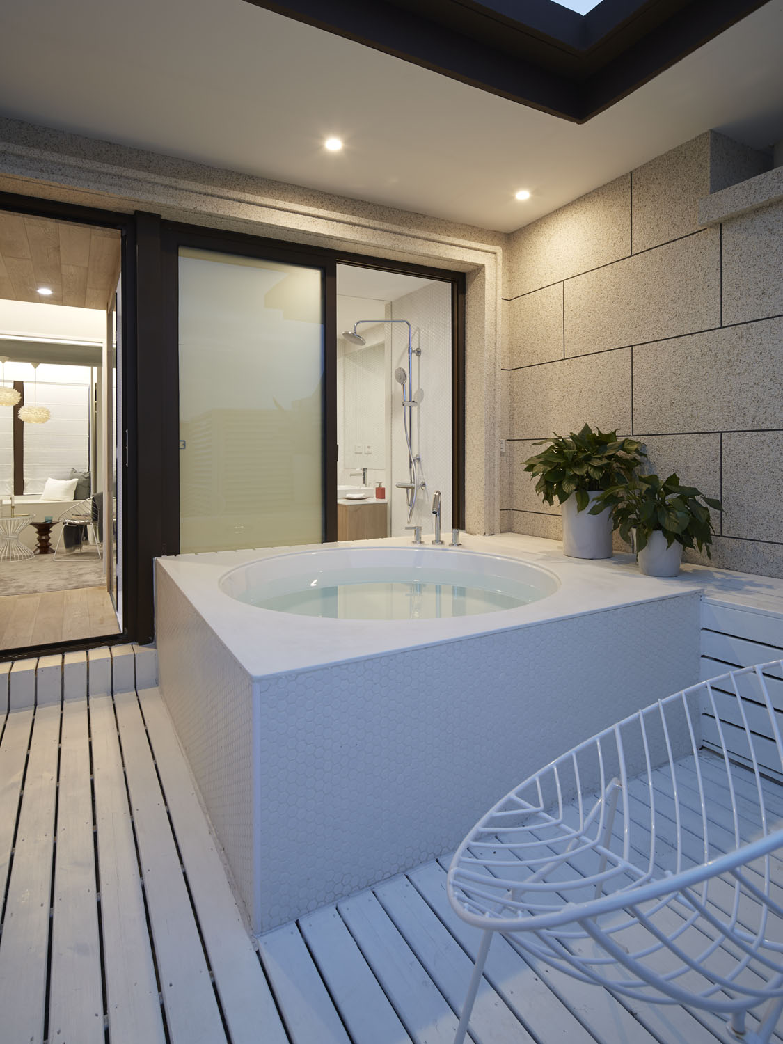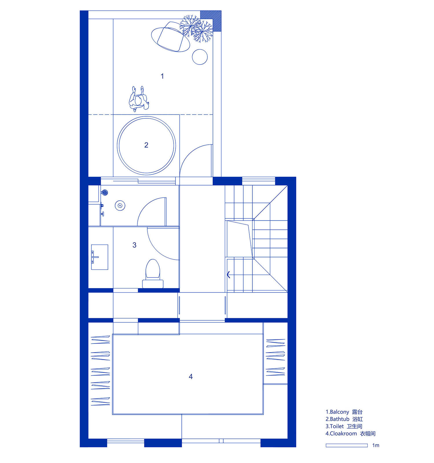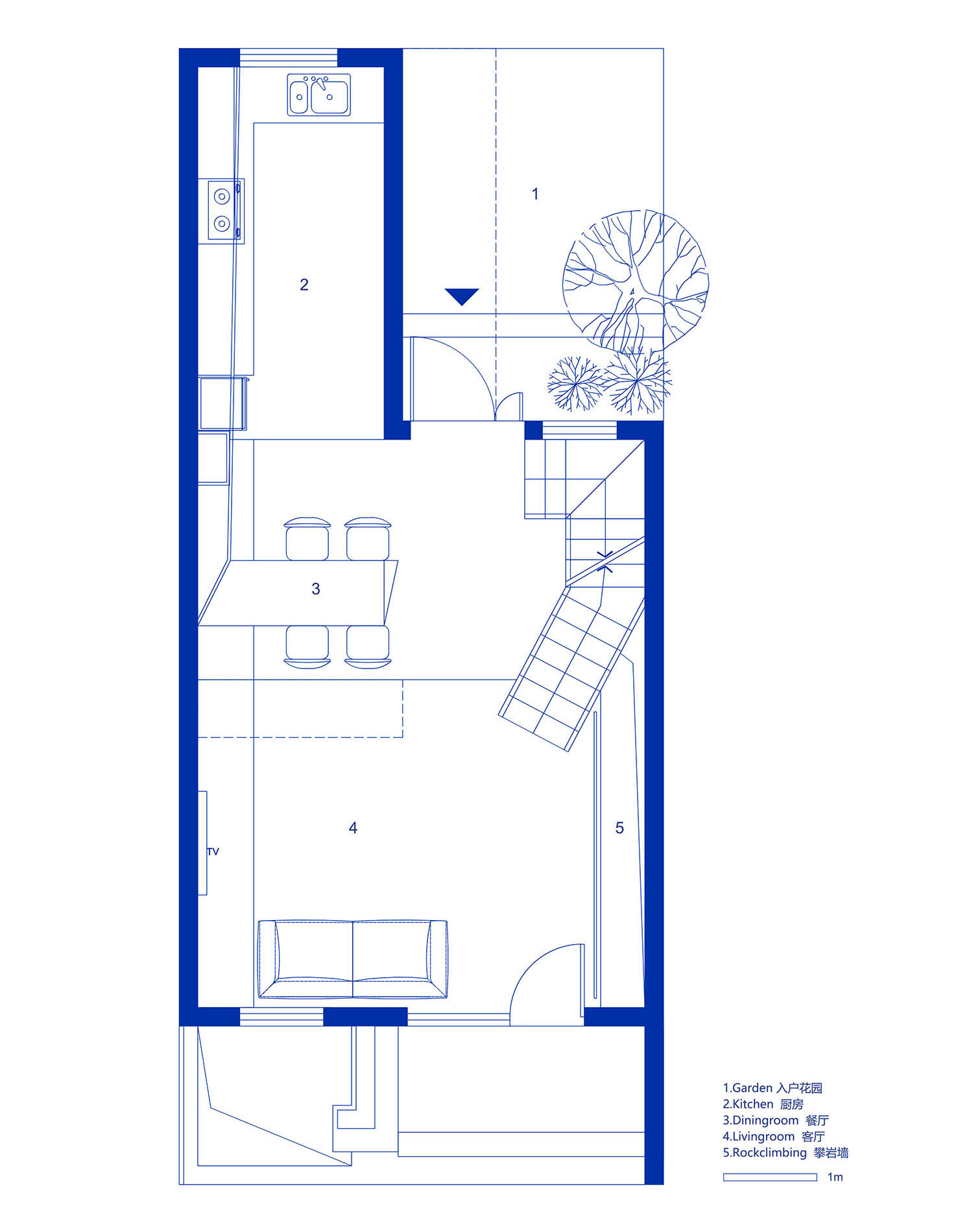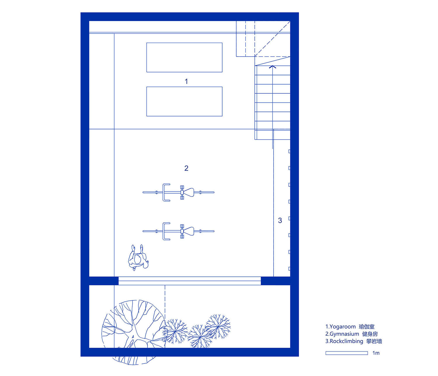 我们将地下室设置成小型健身房,两种色调将空间一分为二,分别对应不同的运动类型。此外,我们还为健身者加入了一种极具挑战性的上楼方式:将一面墙设计成了攀岩墙,去掉一部分楼板让攀岩者可以直接从地下室攀爬至一楼起居空间。而下沉式别院——这一真正意义上的“外”空间,通过自然天光的引入让原本闭塞无奇的地下室变得丰富温暖起来。