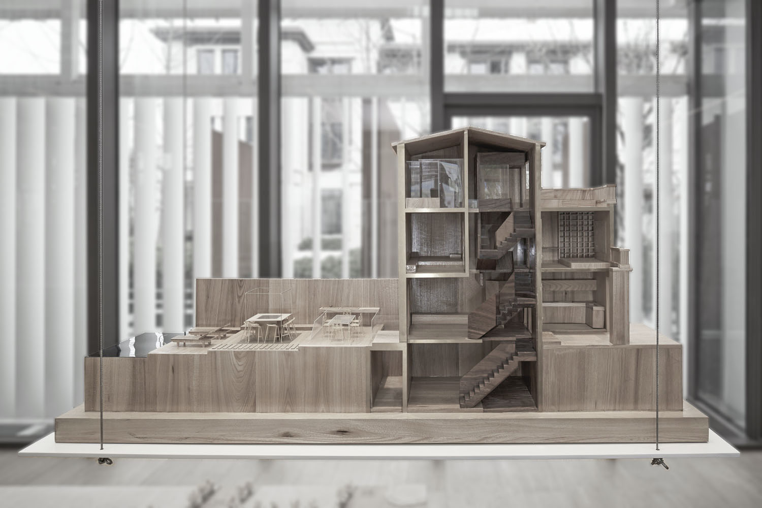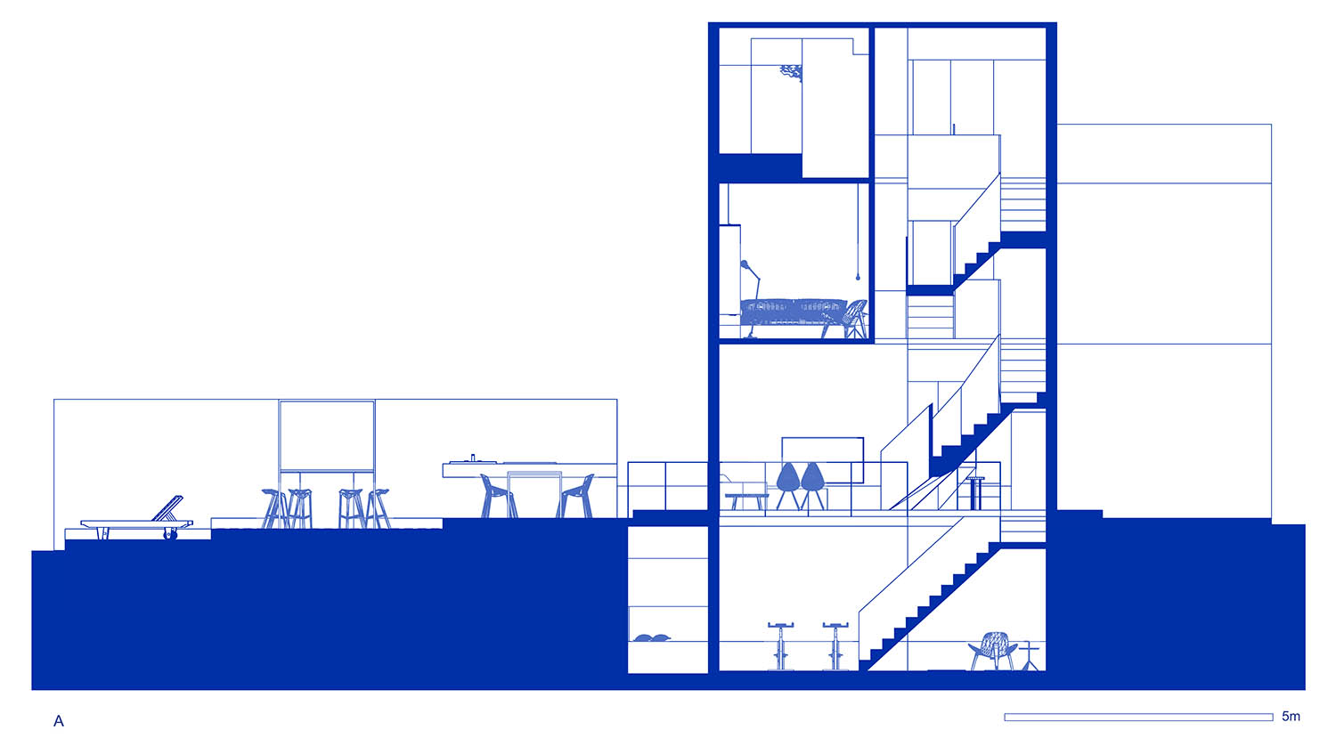 On the section, try to empty small area in each layer, break the partition of each floor, and connect "inside" and "outside" with "bridge". Standing on the "bridge", the line of sight can penetrate up and down three layers. Through the introduction of longitudinal space, it is expected to weaken the relatively narrow space of each layer.