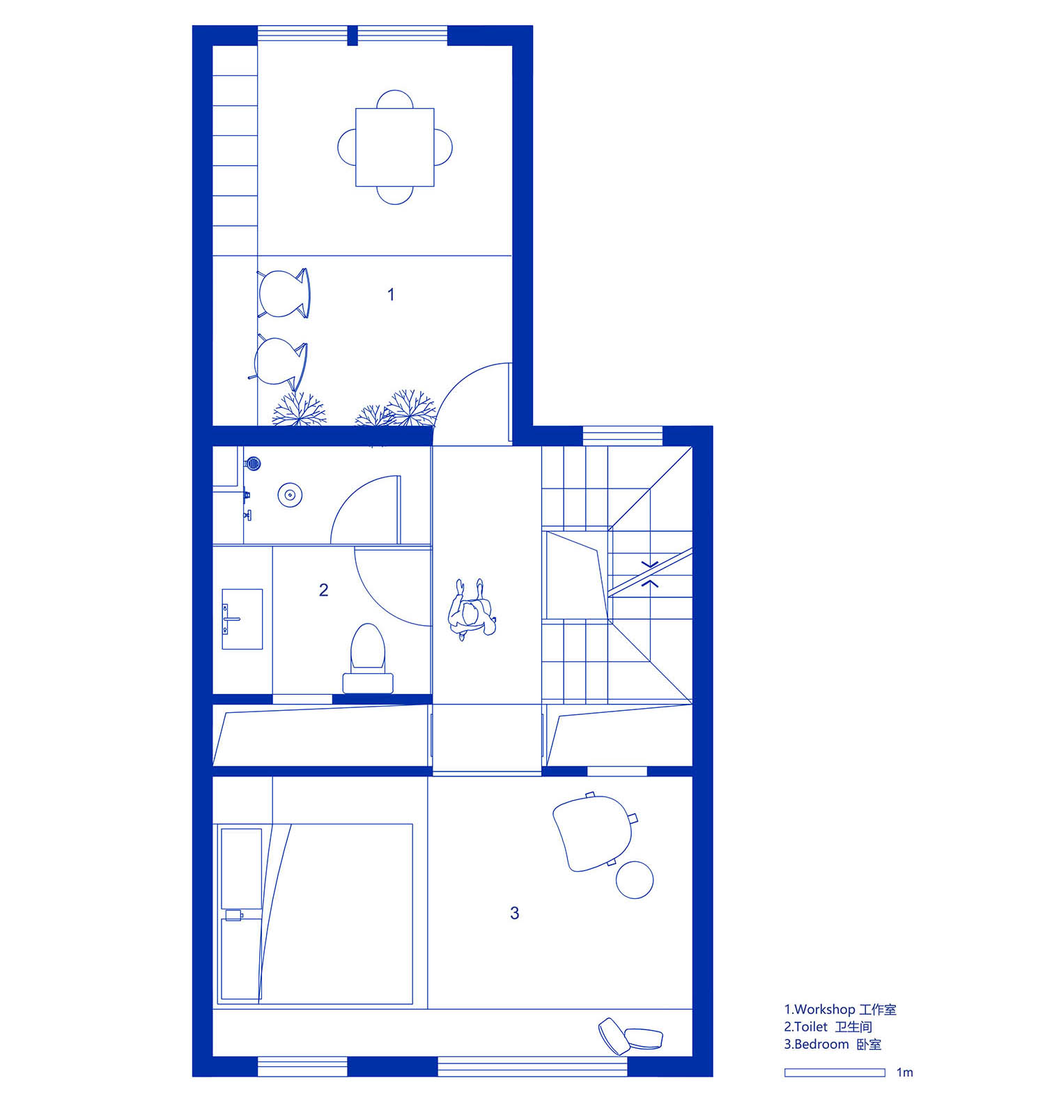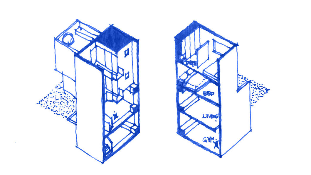剖面上则力图在每层尝试小面积的挑空,打破各层楼面的区隔,将“里”和“外”用“桥”相连。站在“桥”上,视线可以穿透上下三层,期望通过纵向空间的引入,弱化每层空间相对狭小的问题。