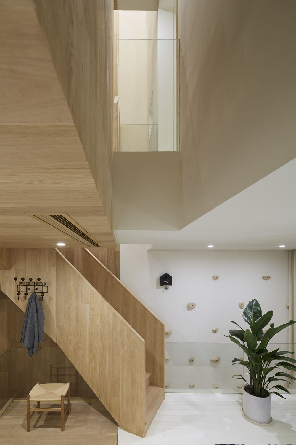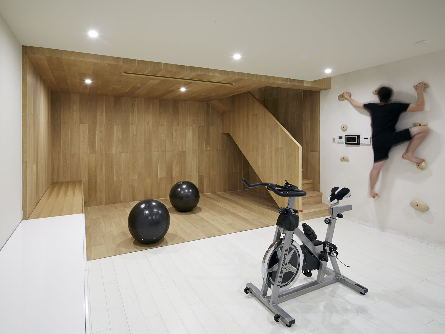 We set up the basement as a small gym, two shades of space divided into two, each corresponding to different types of sports. In addition, we also added a challenging way to get up the stairs for fitness workers: to design a wall as a climbing wall. Remove a portion of the floor so that climbers can climb directly from the basement to the living space on the first floor. Through the introduction of natural celestial light, the confined basement has become rich and warm.