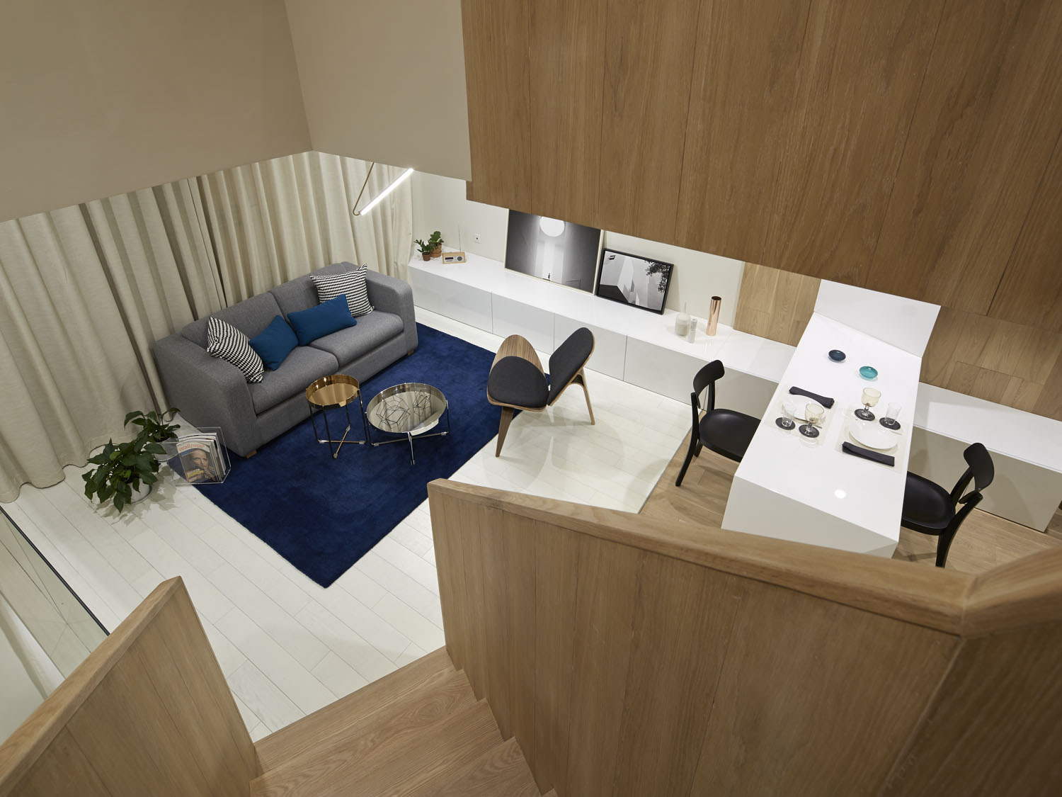 里外之家是一个位于上海朱家角的别墅室内设计的项目。传统的住宅空间总是各个楼层及房间相对独立,但在这样一个只居住夫妇二人、每层仅40平米的小型别墅中,我们想要尽可能的去掉不必要的楼板和门,让所有的空间都是联通的状态,以求塑造出新奇有趣却又丰富糅合的空间层次。