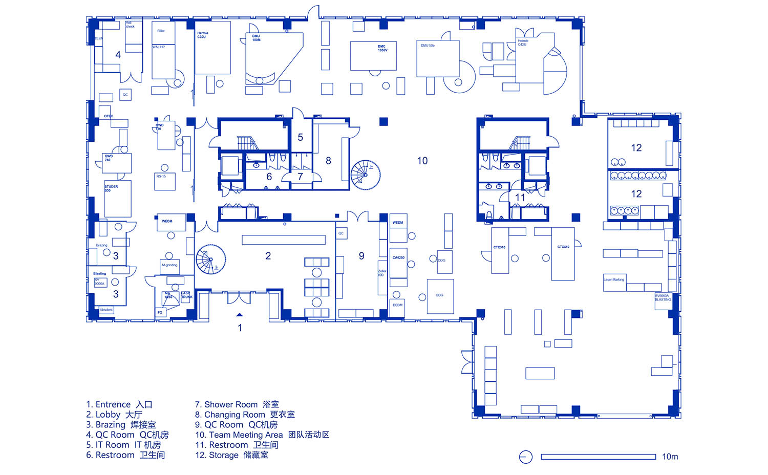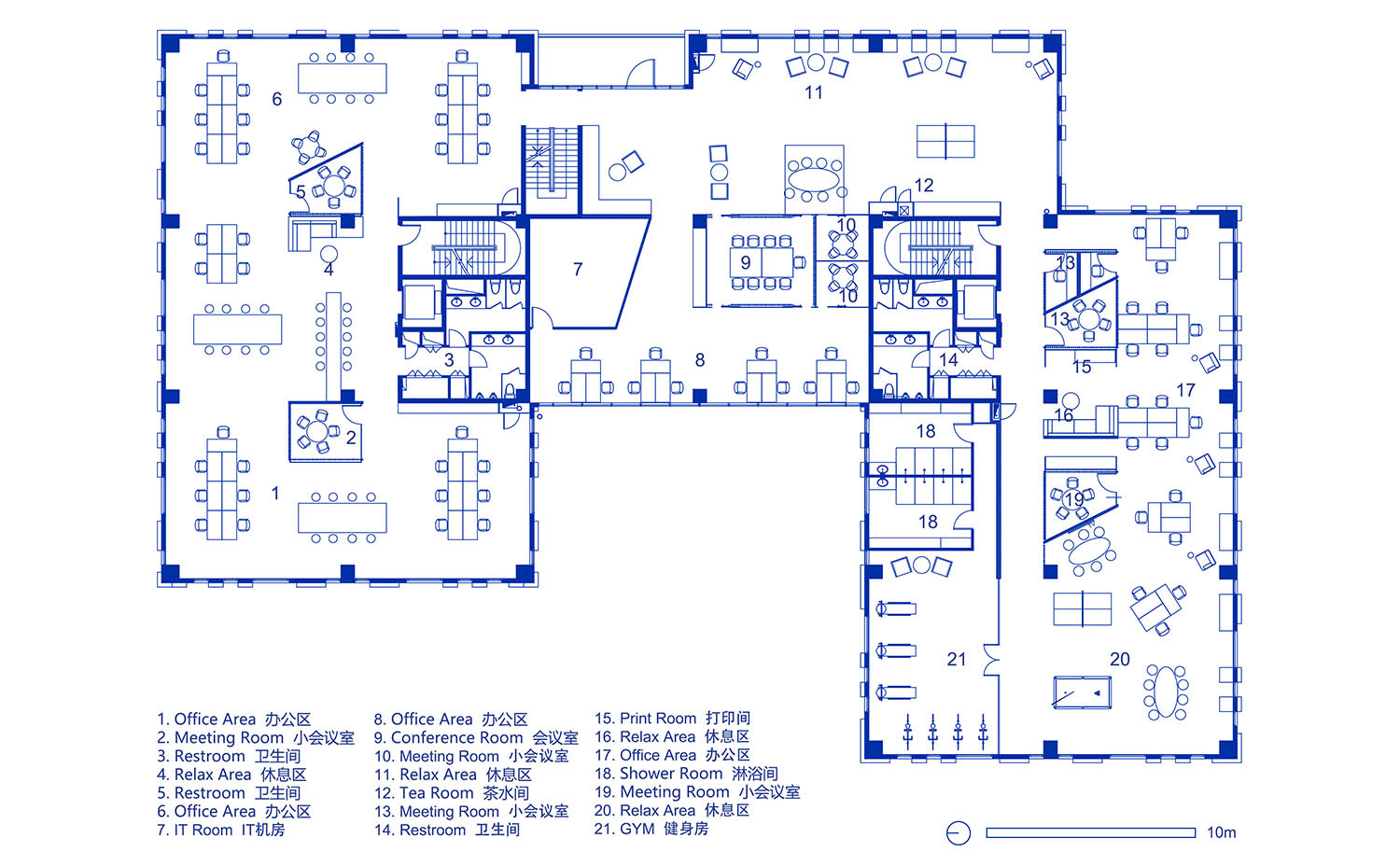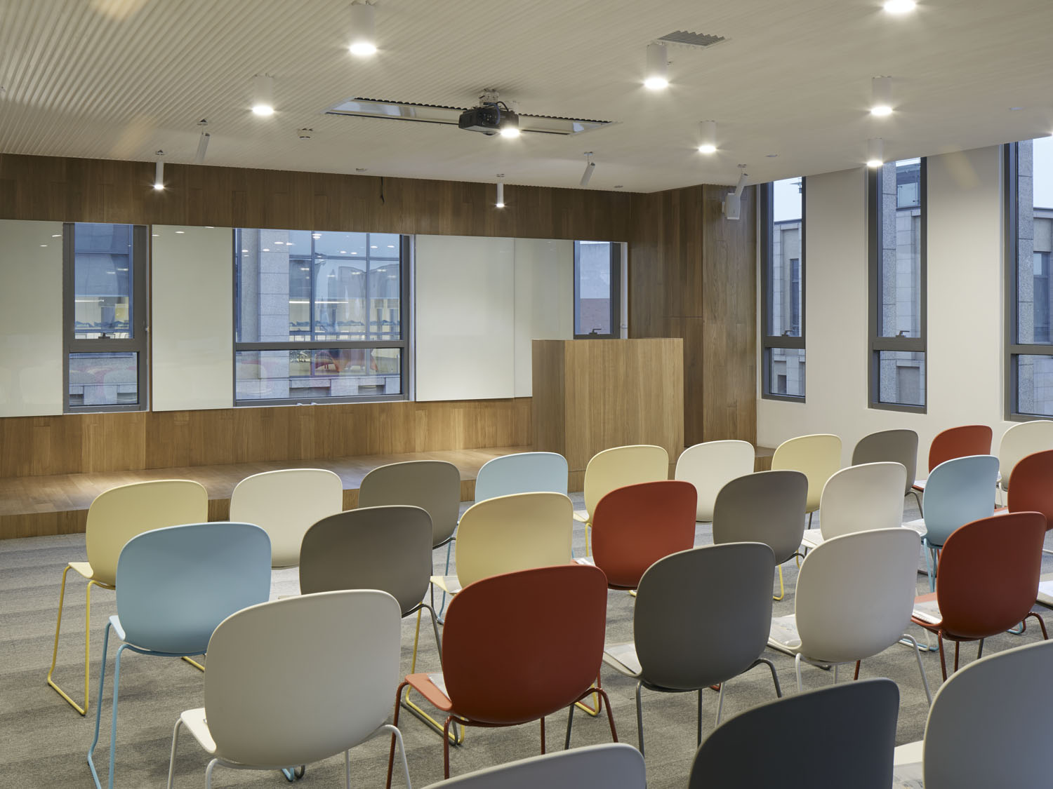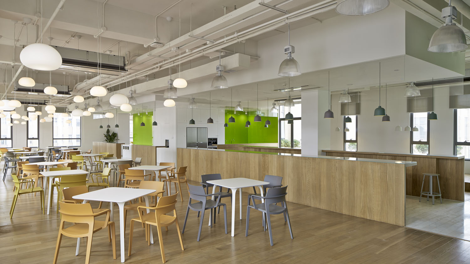The headquarters needs to accommodate 120 people for daily work and enable them to have staff training, medium conference, product demonstration, leisure activity, dining and assembly. The office area specially needs four types, including 28 small and medium-sized meeting rooms. We got stuck at the very beginning of arranging and placing different functional spaces in an orderly manner.