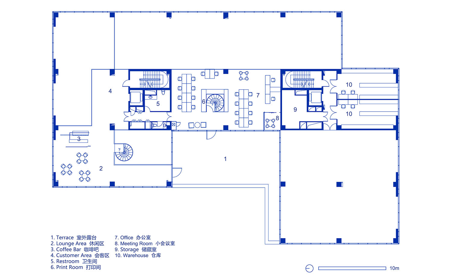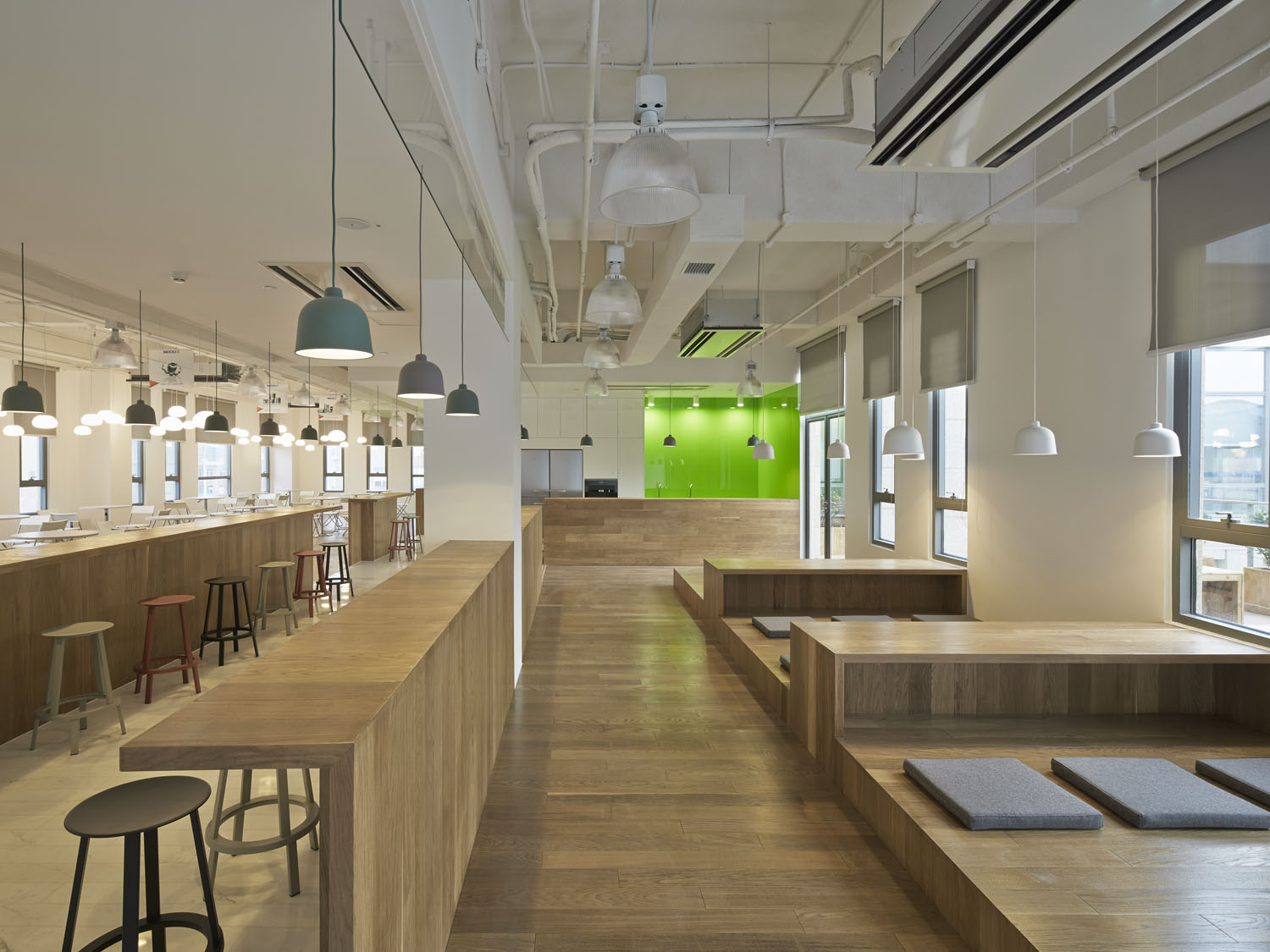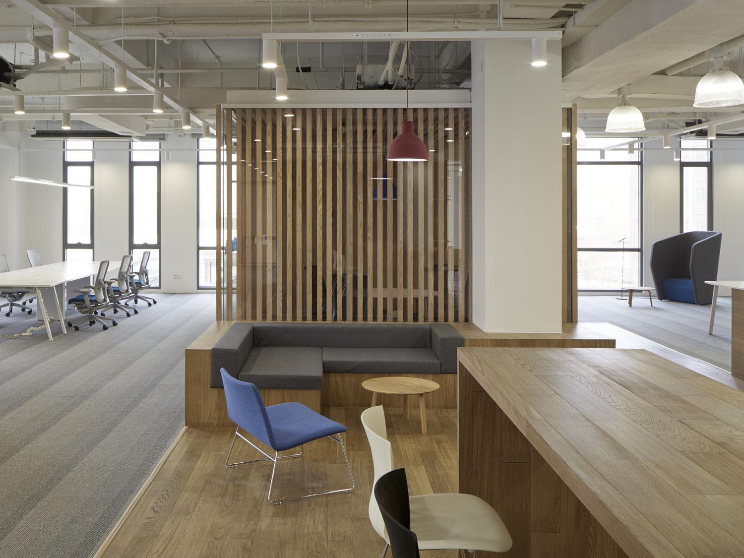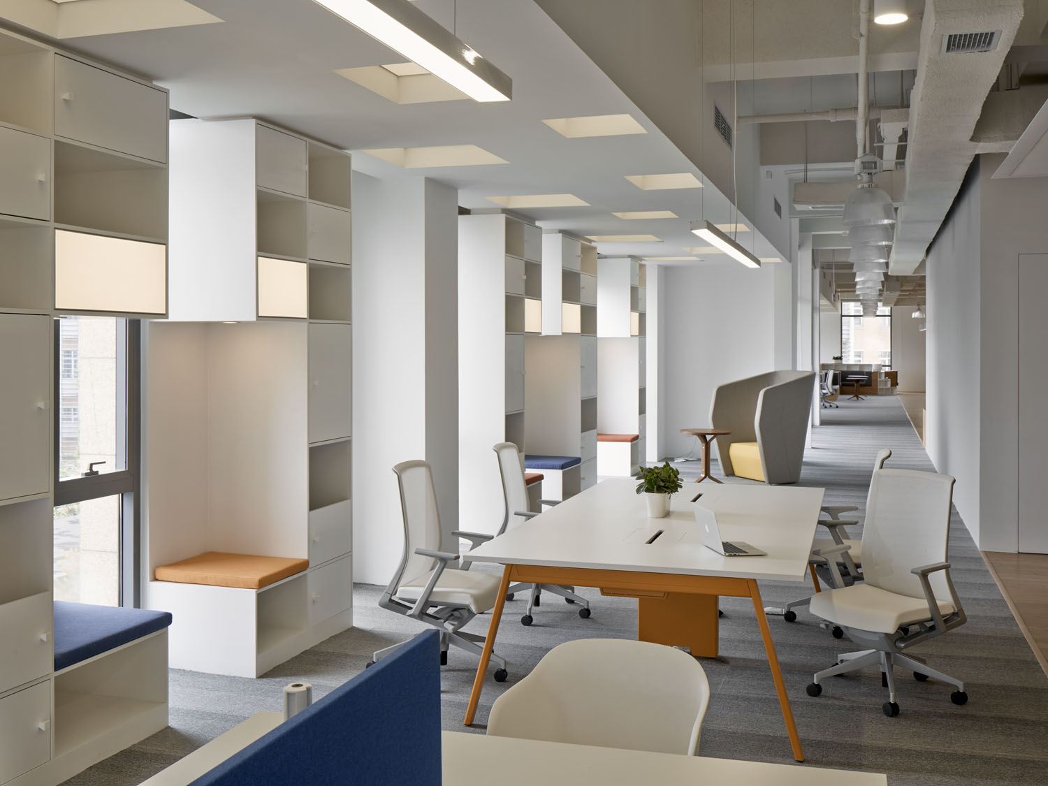 To meet user demand in an open area, we develop existing windows into a multifunctional system integrating storage, green plants, bookshelves, seats, tea tables and soundproof chairs and accommodating the needs of all departments and zones properly. Also, the design of suspended ceiling imitates the corresponding modules, hence upwardly extending the inner space.