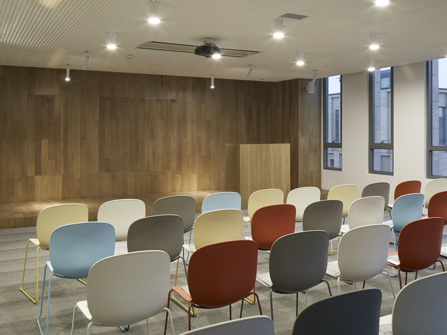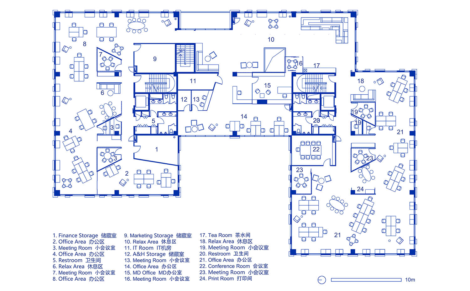 该办公总部在需要容纳超过120人日常办公的同时,还将承载员工培训、中型会议、产品展示、休闲就餐及行业集会等功能。特别是在员工办公区域亦需要安置四种不同类型,总计28个中小型会议空间。如何将数量众多的不同功能空间进行有序的组织与放置是我们在这个项目最开始遇到的难点。