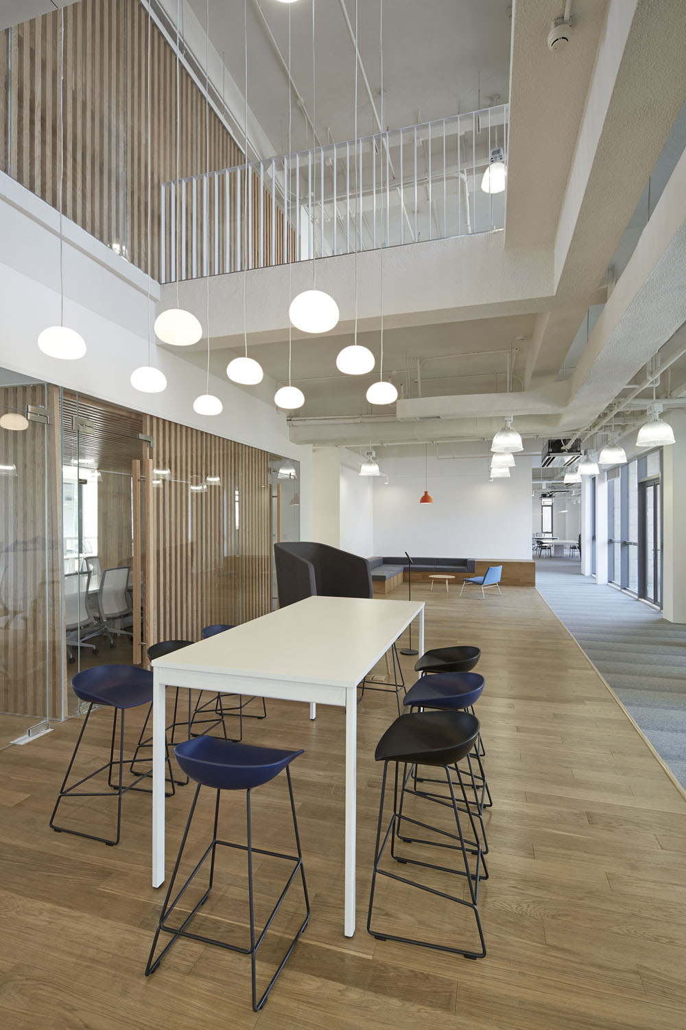 在办公楼层,我们将储物、洗手间及垂直交通等功能放置在中间,用木材为主要材料的实体“盒子”将其与外部空间进行区隔。同时将员工办公区域设置在楼层内的外围有窗空间,以获得最佳的采光,整个工位区接近全部开敞,符合业主的日常办公习惯。