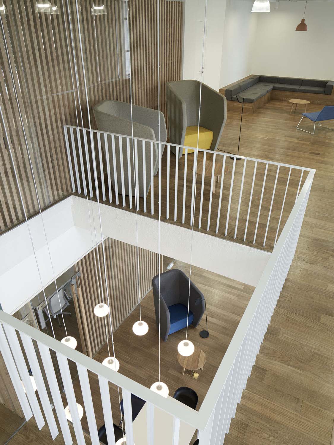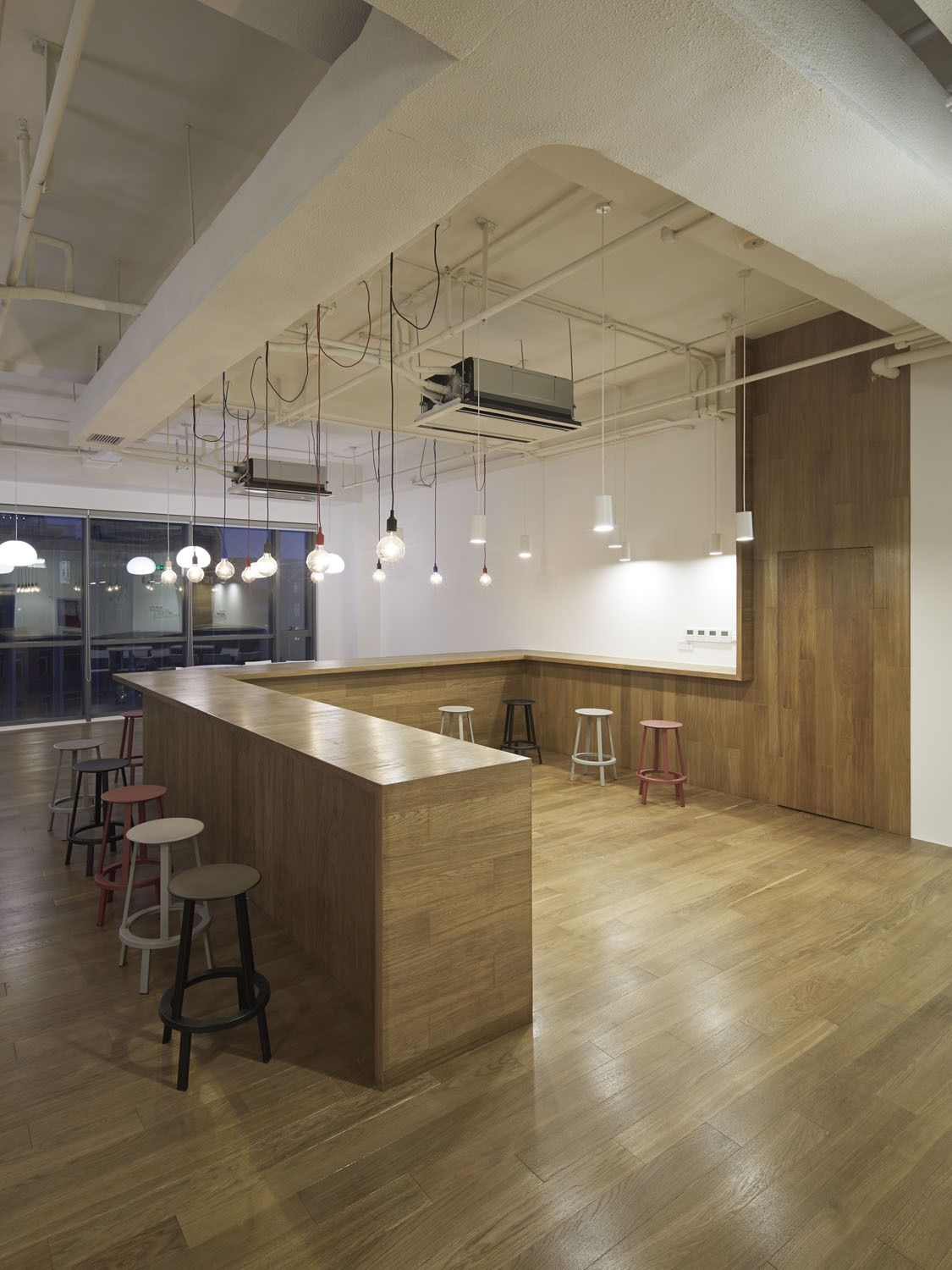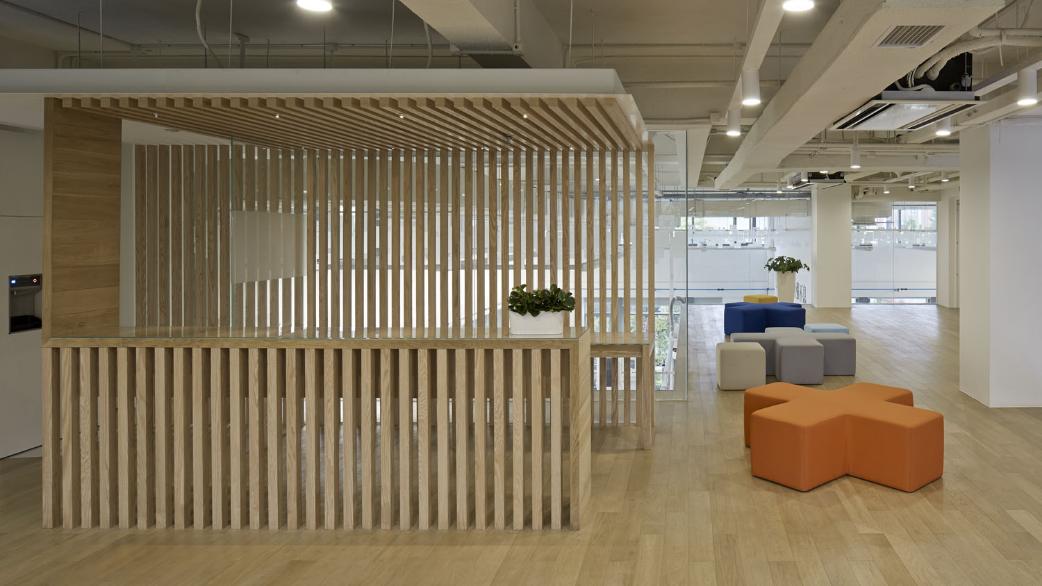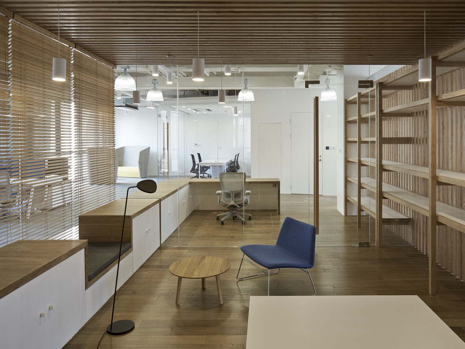 As wooden fences and glass partitions divide several separate and continuous void rooms for meetings and private exchanges among open zones and boxes, complicated sectors are fitted into place to ensure good mobility to each other by designing three spaces.