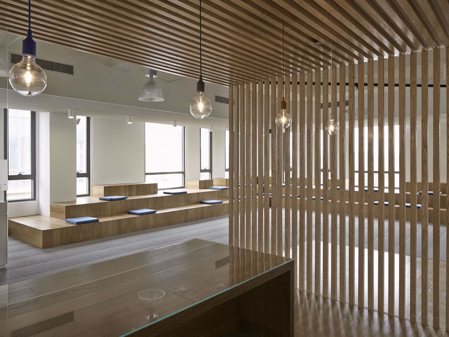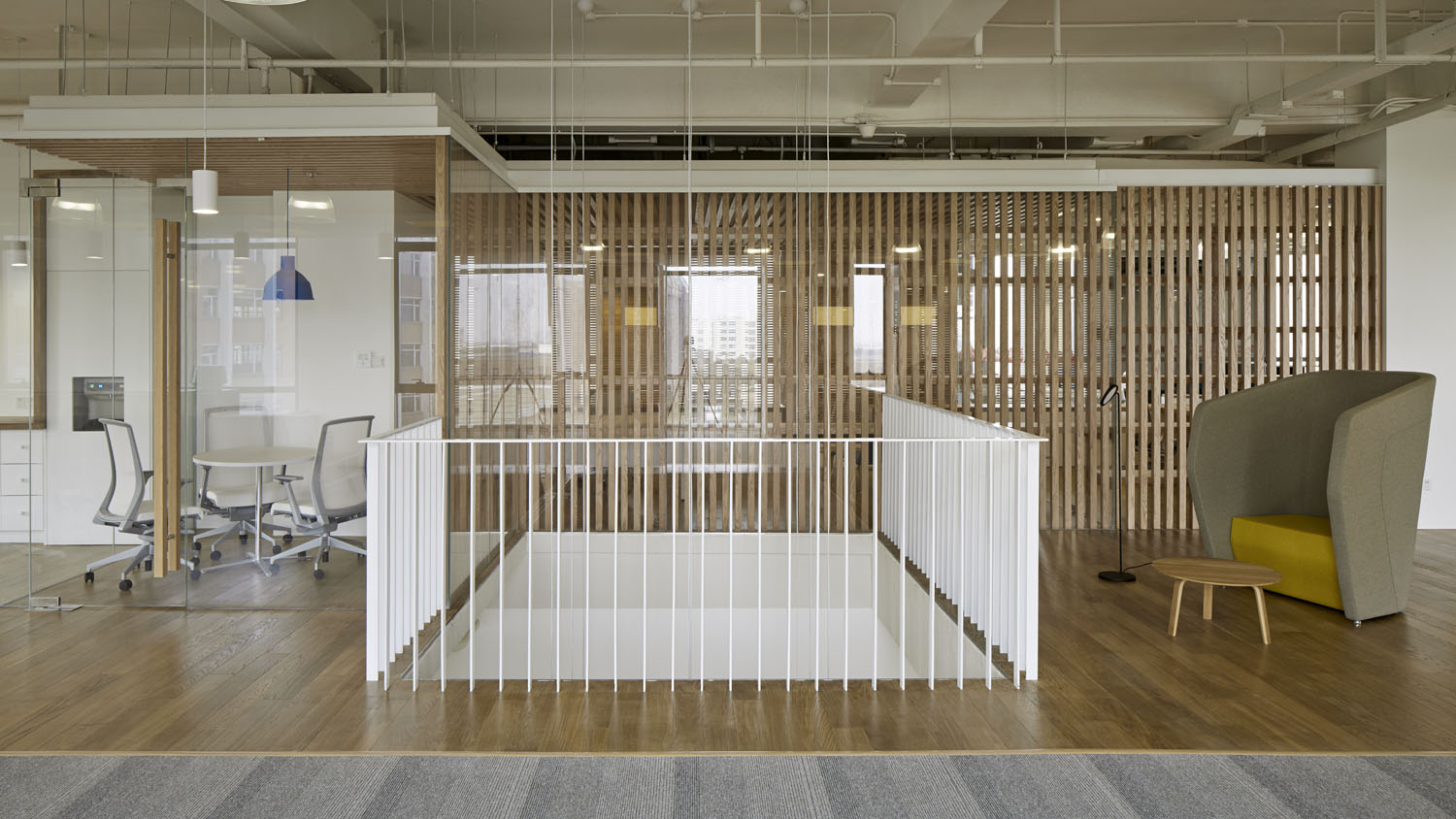 而在开敞区域与实体盒子之间,我们用木隔栅和玻璃做为主要材质,形成了多个隔而不断的虚空间,作为会议与交流的半私密区域。我们通过这三个区域的设计,将繁杂的功能空间进行了有效的梳理和归类,同时也很好的保证了各个空间之间的流通性。