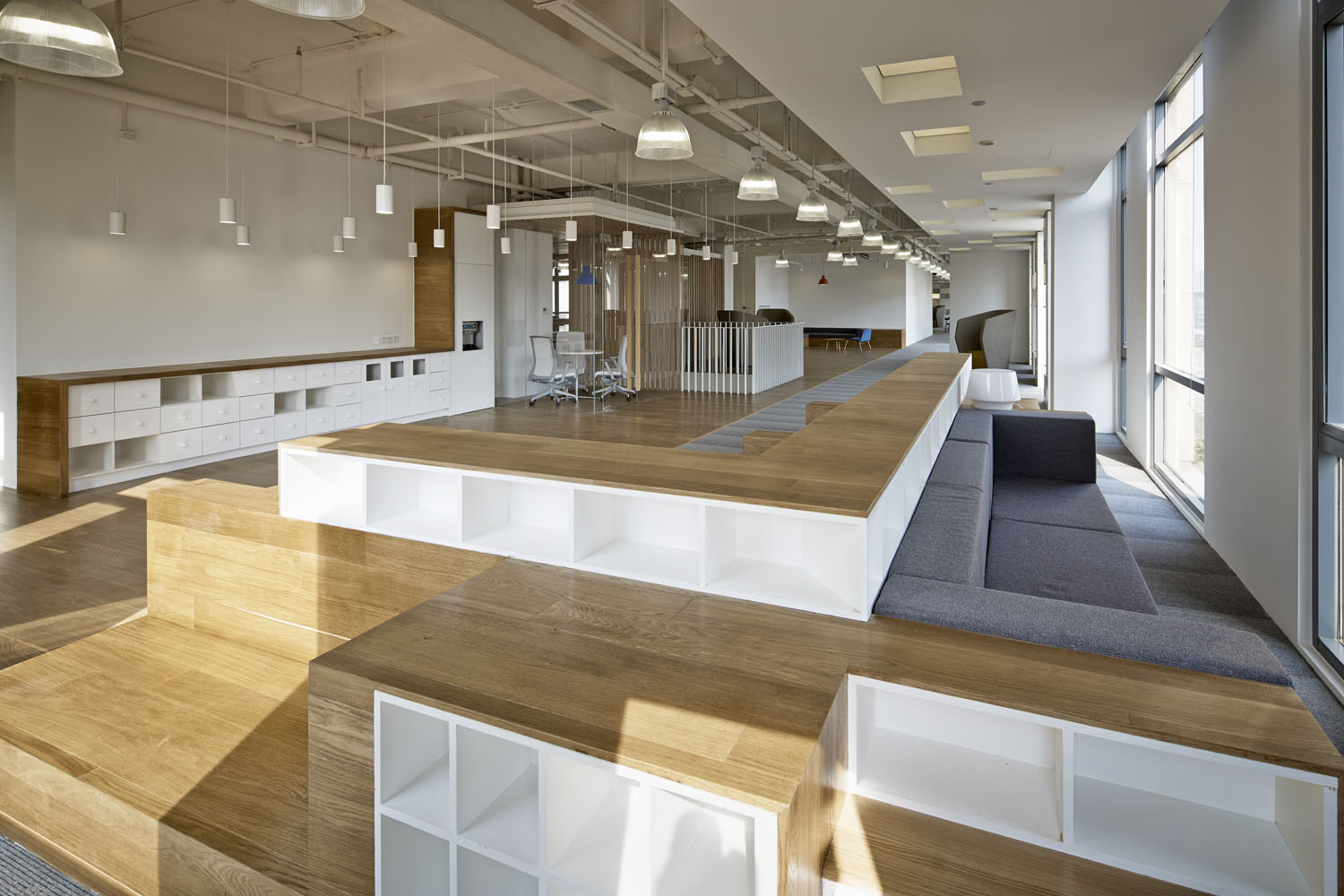 In the office building center, the functional zones of storage room, restroom and vertical channel separate them from the external space by placing tangible wooden "boxes". Meanwhile, these spaces are surrounded by an office area with windows letting enough sunshine in. The whole zone is nearly unrestricted to meet the users' daily working habits.
