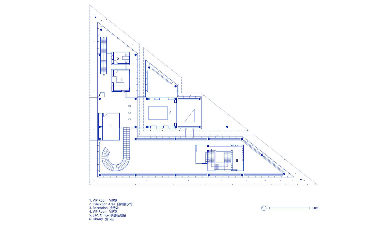 在直线构成的空间中,设计师巧妙地设置了一个旋转楼梯,经过钢结构精确的计算,运用了非柱支撑的结构连接于两层间。游客可以通过此旋转楼梯到达二楼的贵宾室和办公室,透过具有框景效果房间窗户向外望出,看到室内各部的同时亦可以观赏周边风景。