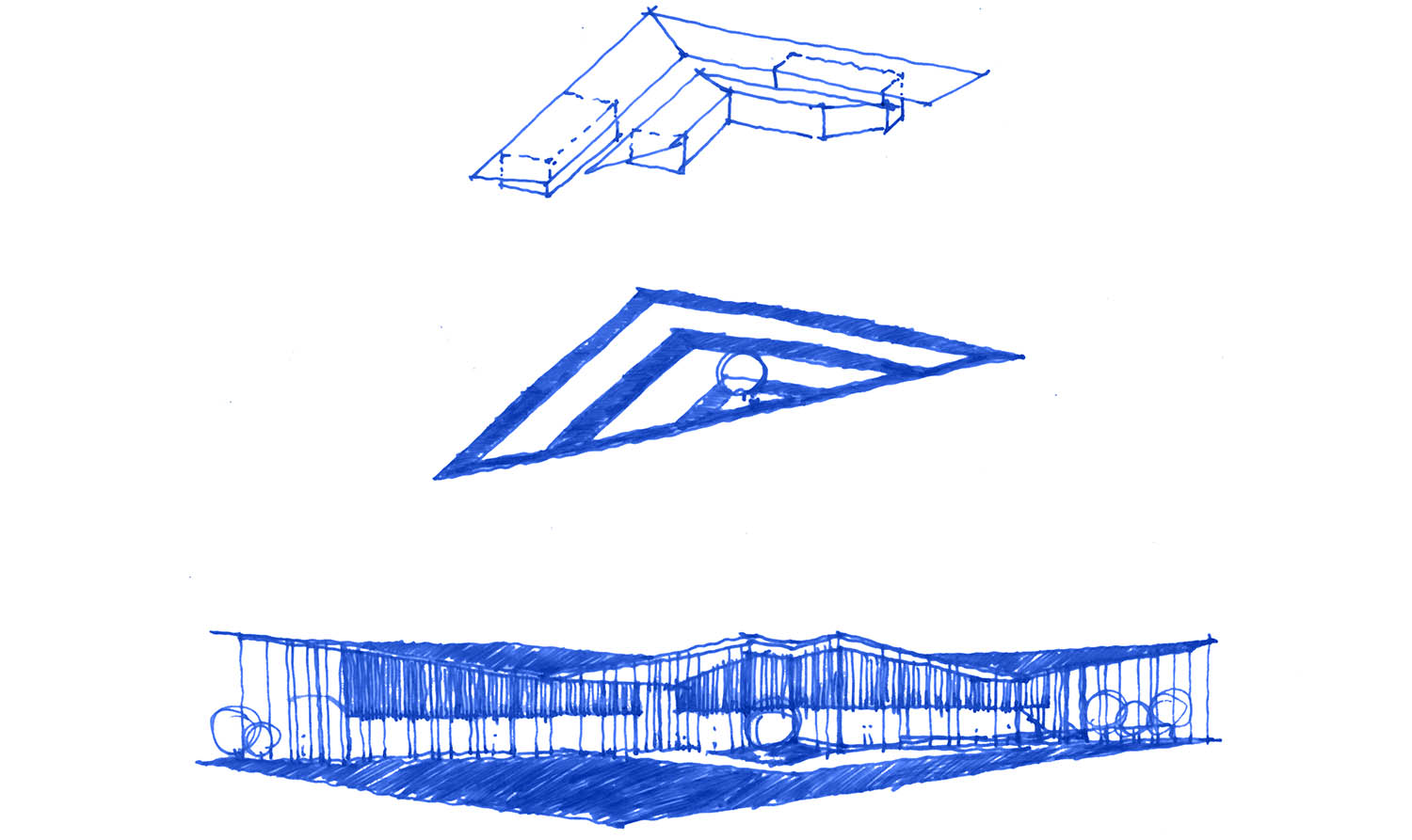 “Wei Long Wu” (Round Dragon Housing), also named “Long Wu”, is a variation of Hakka architecture, mostly spread around Guangdong Province and is a common form of traditional clan housing. Wei Long Wu uses rammed earth as the outer wall to enclose inner housing which forms multiple concentric semi-circular structures, which have distinct functional zoning. In this project, the design adopts a contemporary composition to break the traditional Hakka architecture's layout. The geometric space is transformed from multiple concentric semicircles into similar triangles. The frames repetition, the plane and the overall scheme emphasizes the depth of field. The resulting configuration creates a visual sensation of layers while maintaining an open space.
