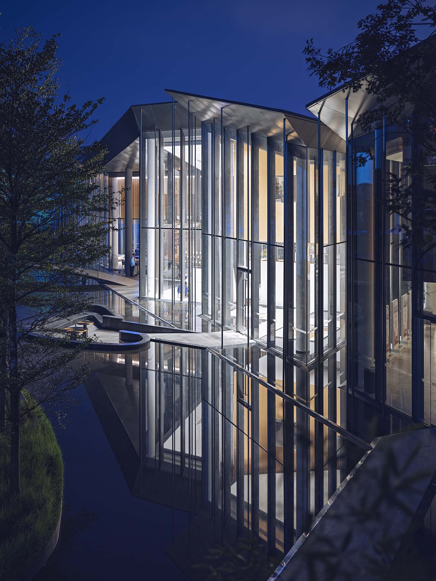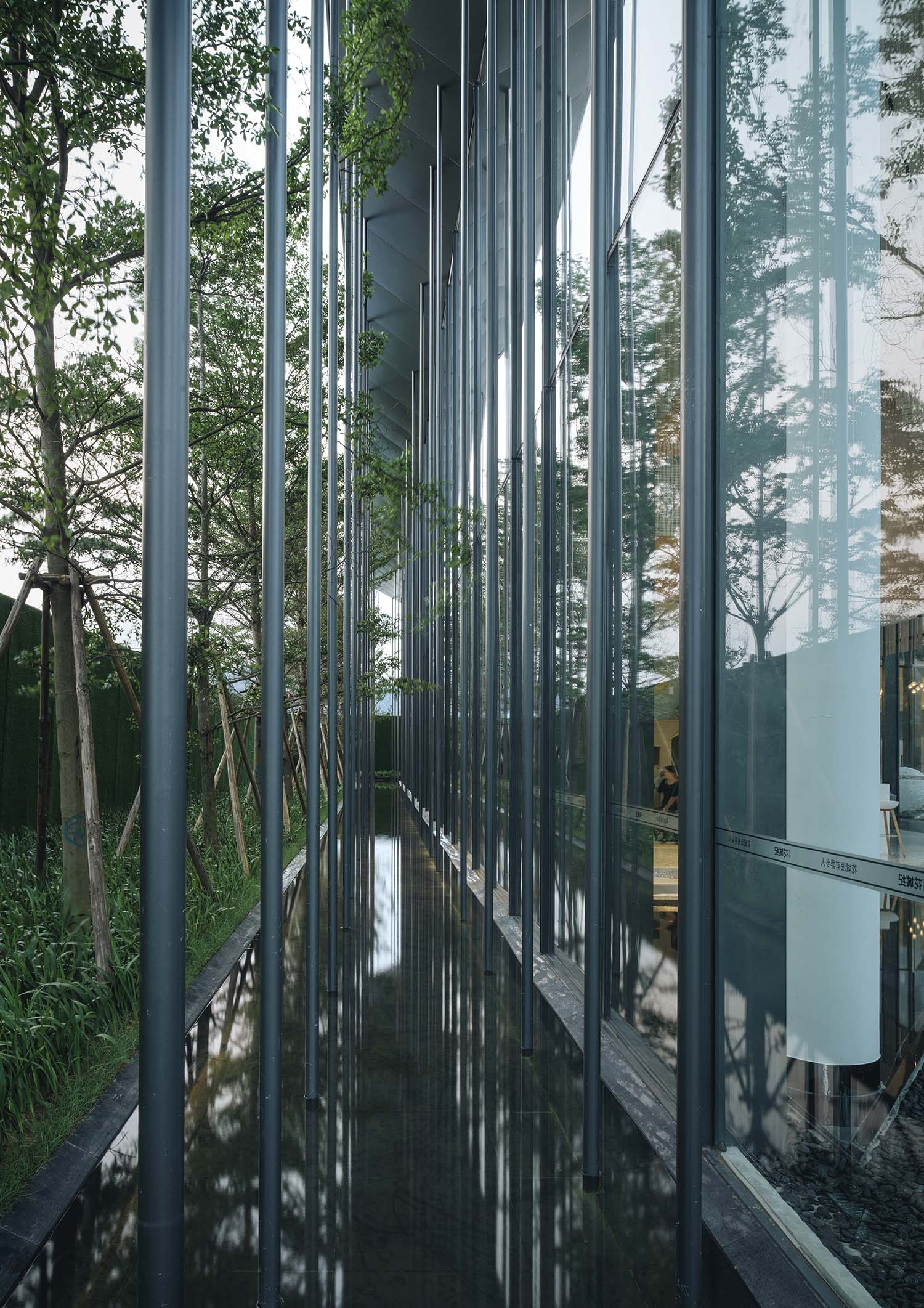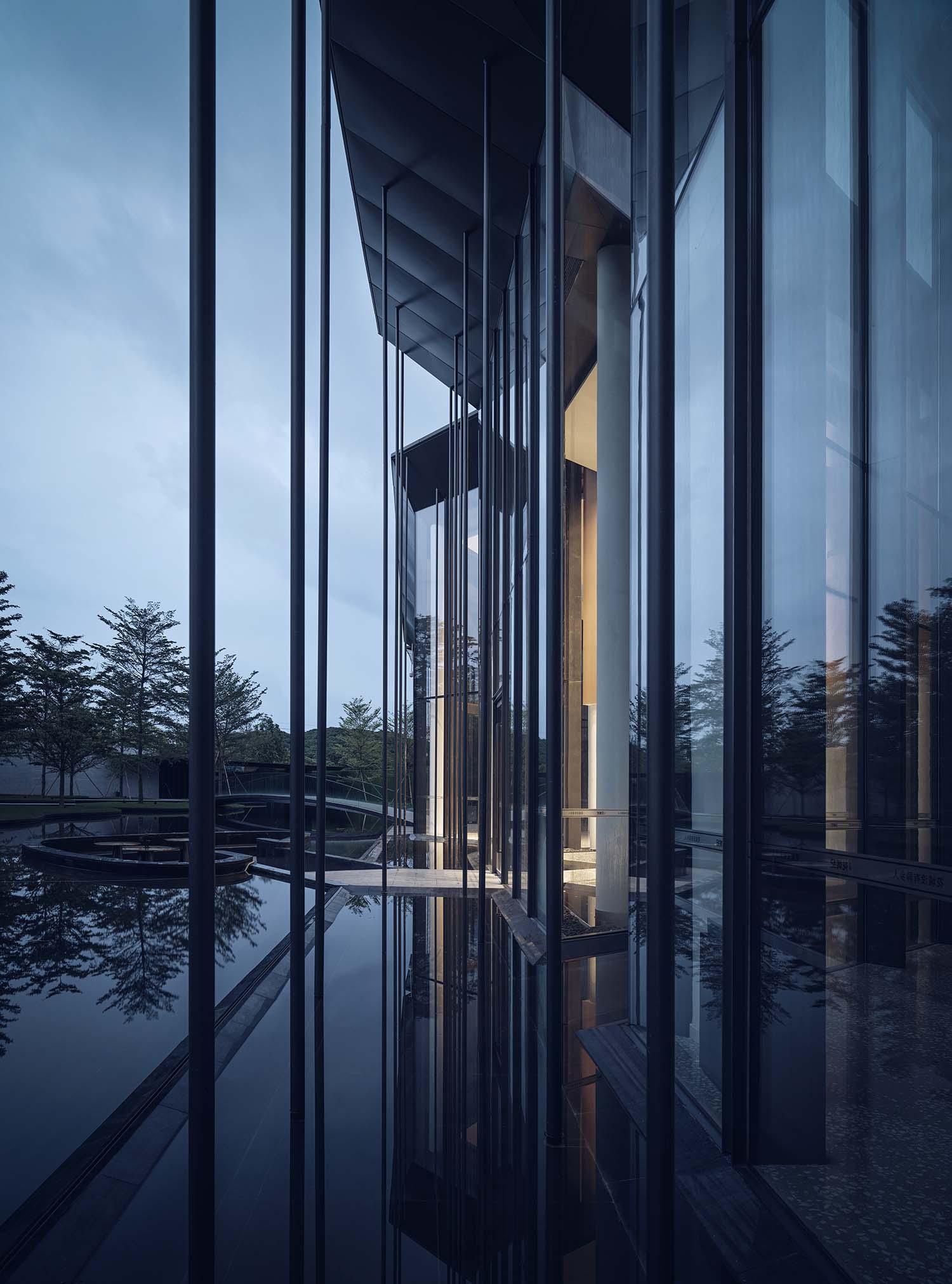 如同客家建筑大多坐落于山水树林间,这座双层建筑与周围自然景观也保持着亲密联系。剪影式的三角形顶棚如同山的影子般遮盖着地面;而支撑着整个三角屋顶的金属柱廊宛若茂密的树林,与户外的树木连成一片;环绕场地的水景弱化了由刚性的几何平面带来的疏离感,大面积的玻璃的应用,引入周围绿色景观,重新定义了建筑与周边的环境关系。庄重但不厚重的顶棚,高耸错落的柱廊,通透的落地玻璃,山与树与水。
