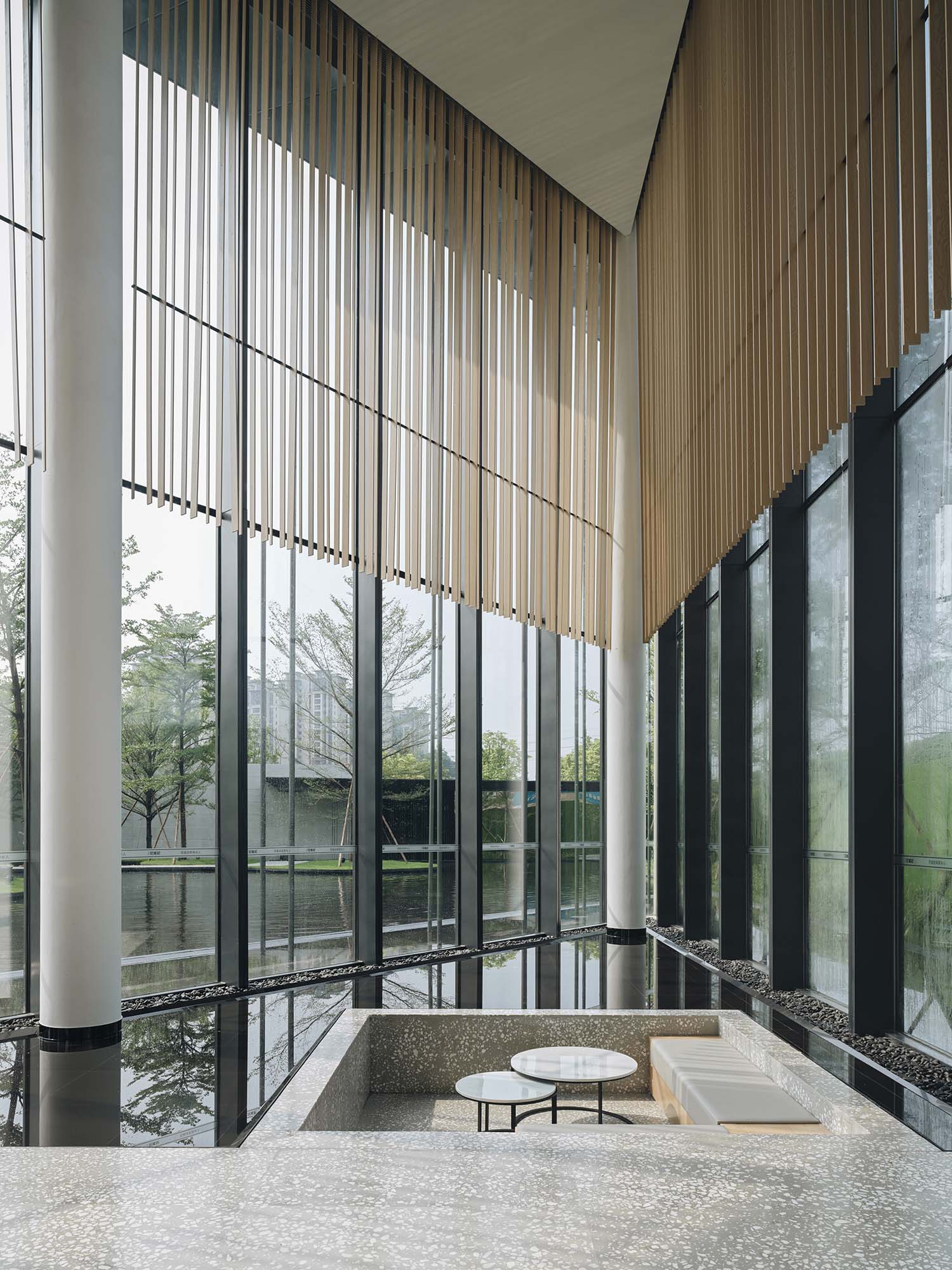 下沉式休息区由外部渗透进来的水体环绕包围,似客家建筑中的天井,收集储蓄疏通雨水,浅水镜面不仅倒映出光影的变化,也将窗外的枝繁叶茂引入室内,营造出人与自然融于一体的环境。