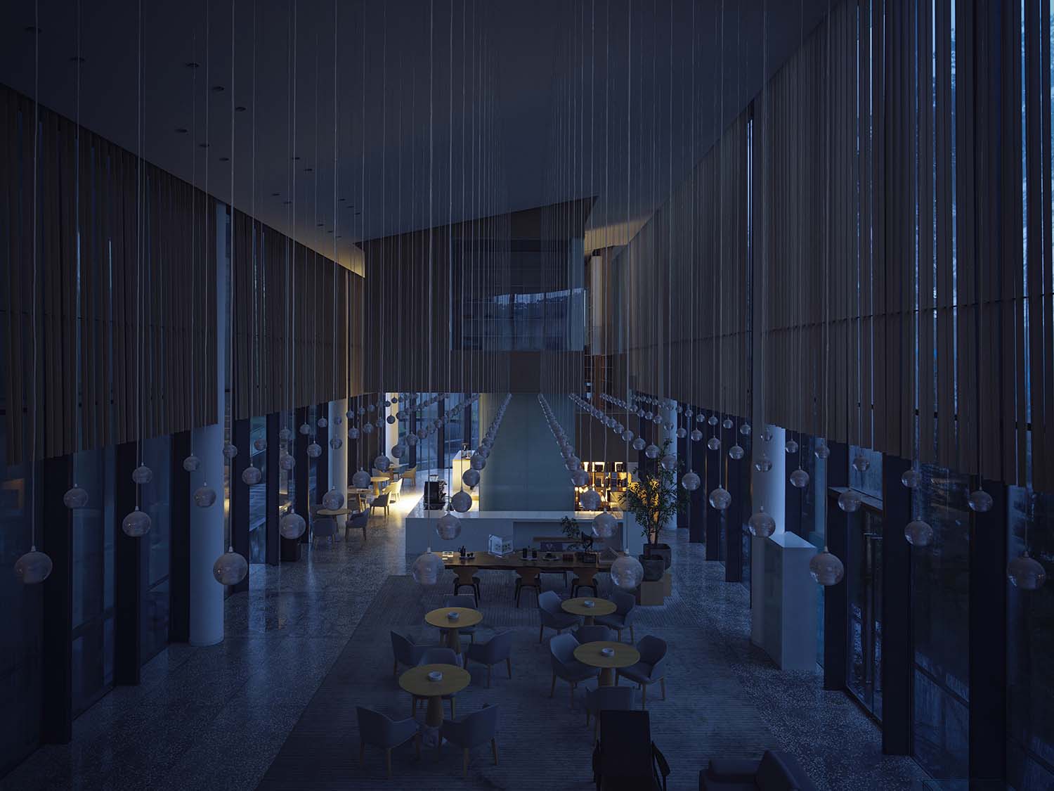 主要的休闲洽谈区域通过强调垂直上的纵深感和透明度,营造出一种平稳而开放的空间氛围。与洽谈区相邻的咖啡吧坐落于一个巨大的木质书架旁,书架随着木饰楼梯一直延伸至二层,继而连接起相对僻静私密的阅读空间。