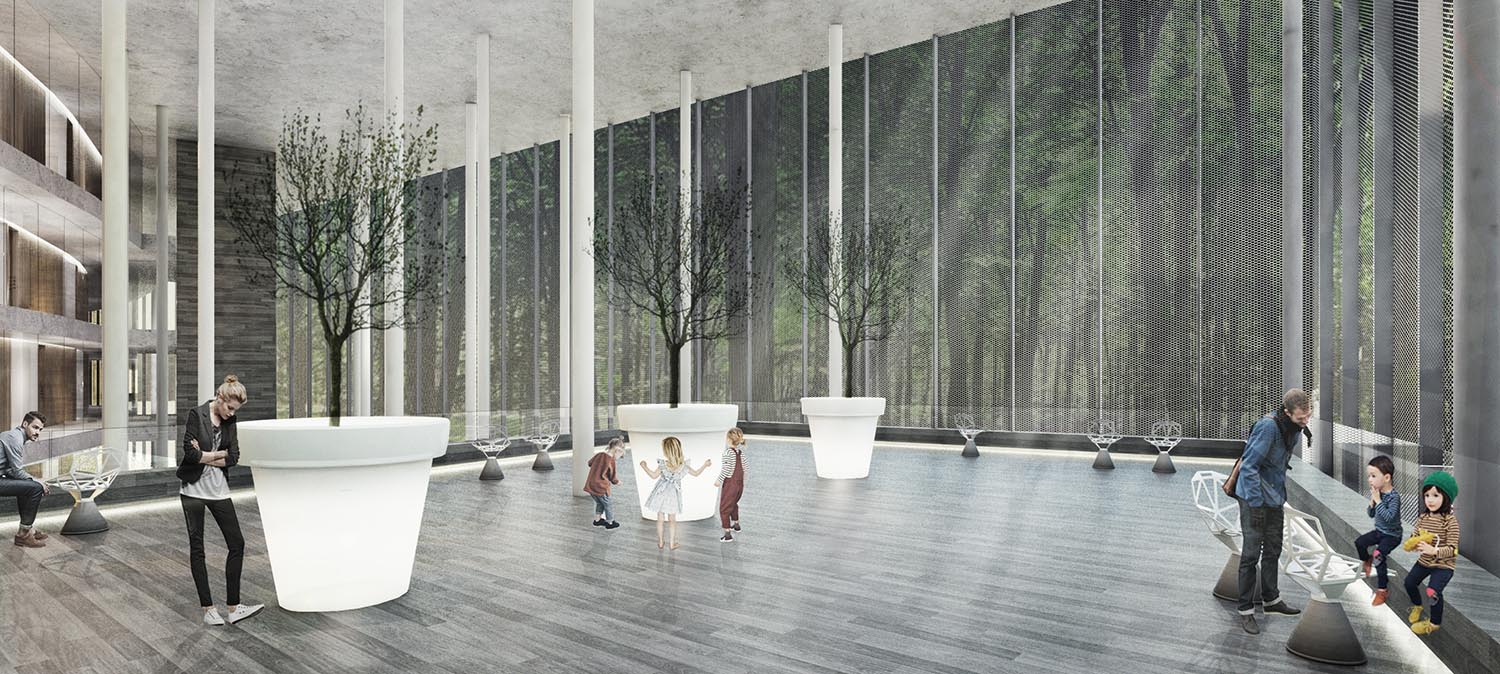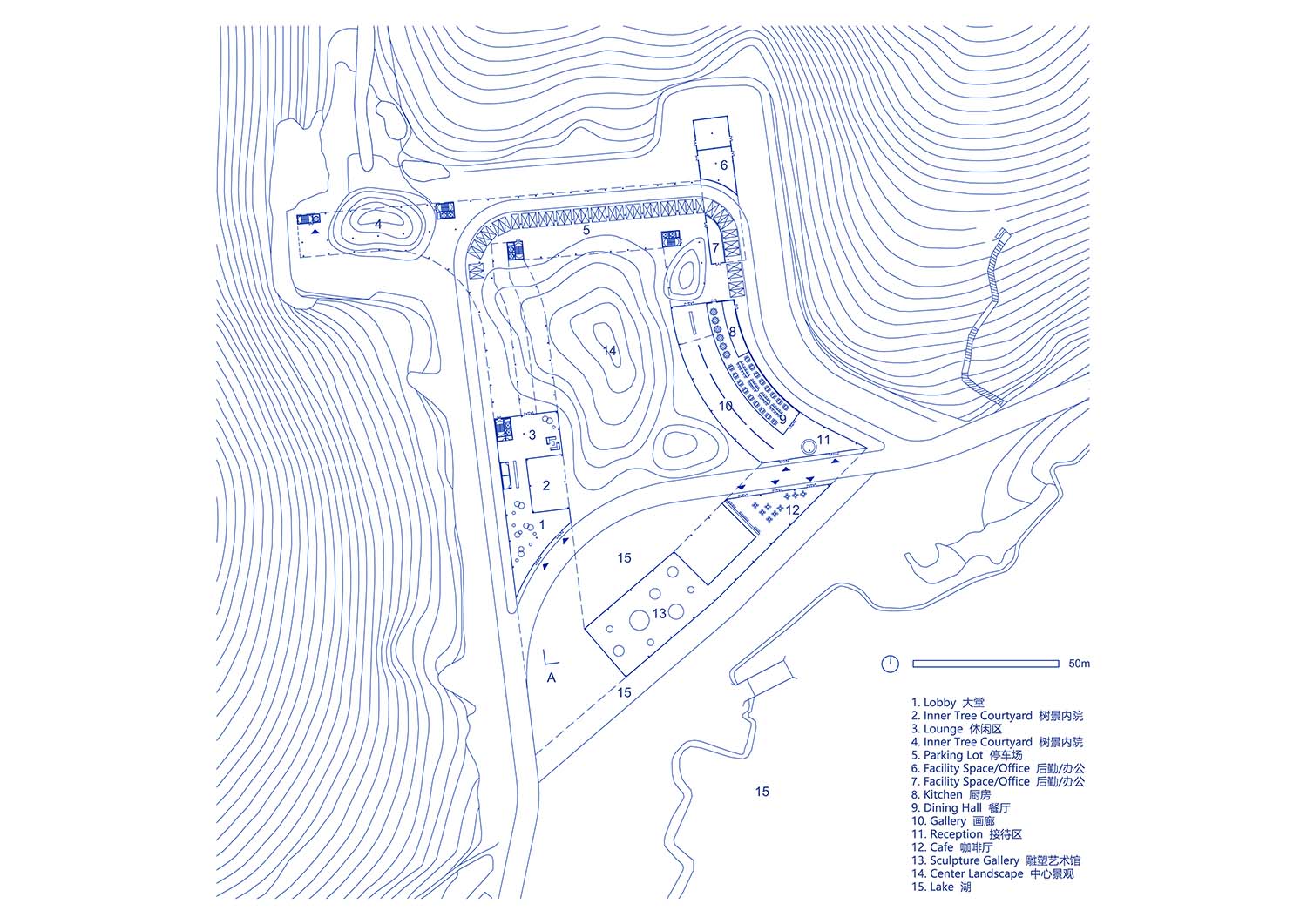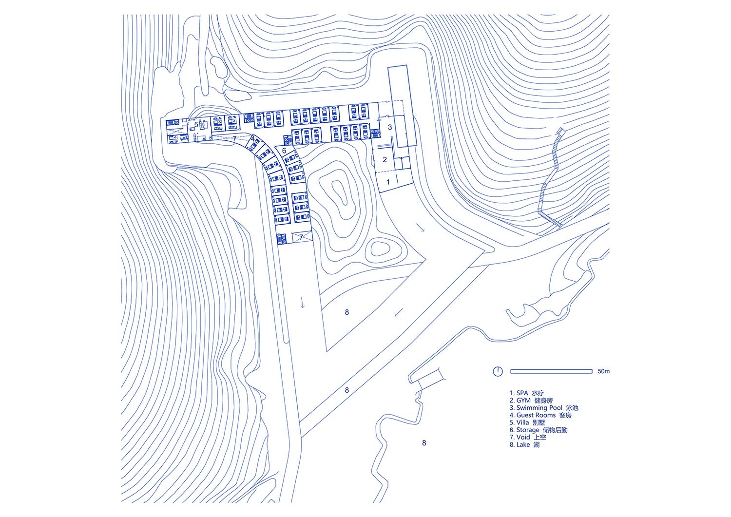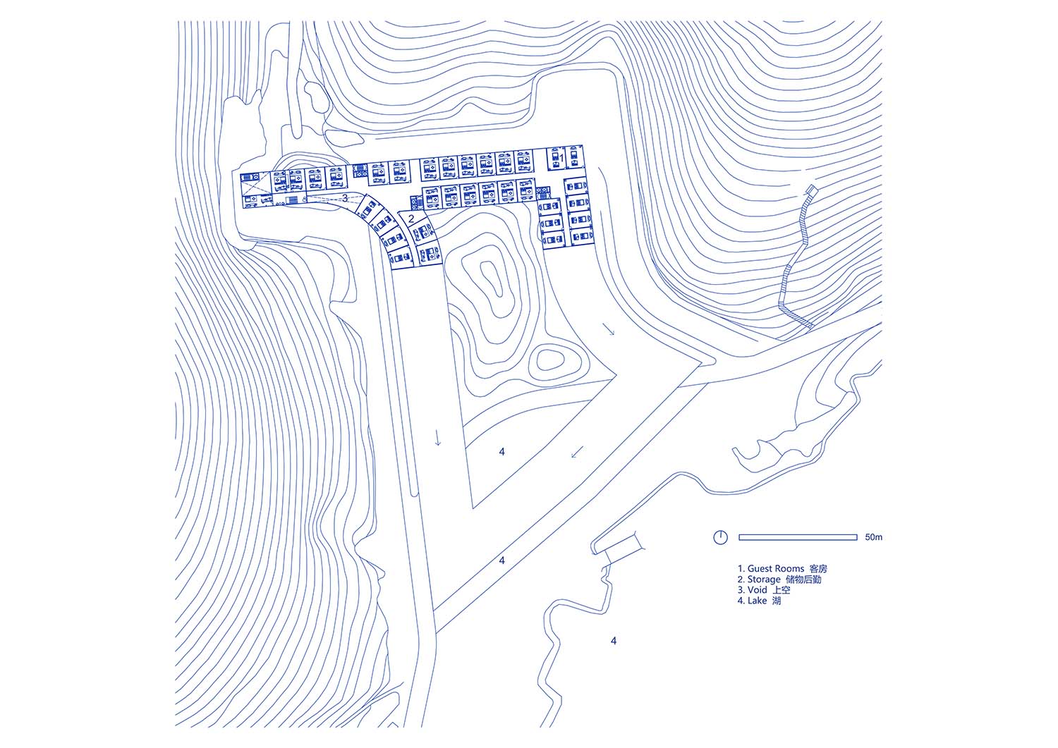 We found out that the original buildings of the site were demolished when we first visited the site, and a huge mining field-like ruin was left. An image of the original state of the site came in mind, in this image, the mountain flows towards the reservoir, and all we can hear is the sound of the tree, water and birds. As a result, our intention is to recreate some of the landscape and enclose it by the new hotel, so that the building could merge into the landscape. In addition, to ensure the best scenery towards the reservoir is shared by the hotel rooms, art spaces and other public area, we carefully form the shape of the hotel according to the context and program requirements, which resulted in a lower part at the front of the hotel, and as the roof gently rise up, more floors are introduced. Last but not least, the landscape in the site is carefully planned and designed according to the program and layout of the building to form a better relationship between the natural surroundings, the inner courtyard and the hotel.