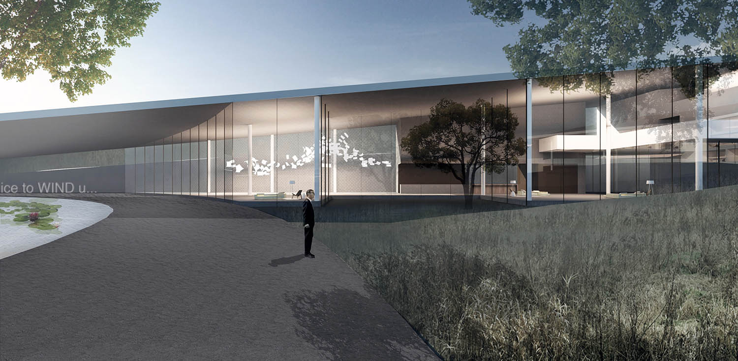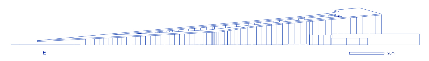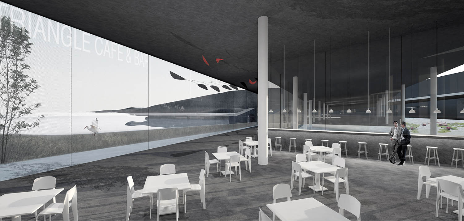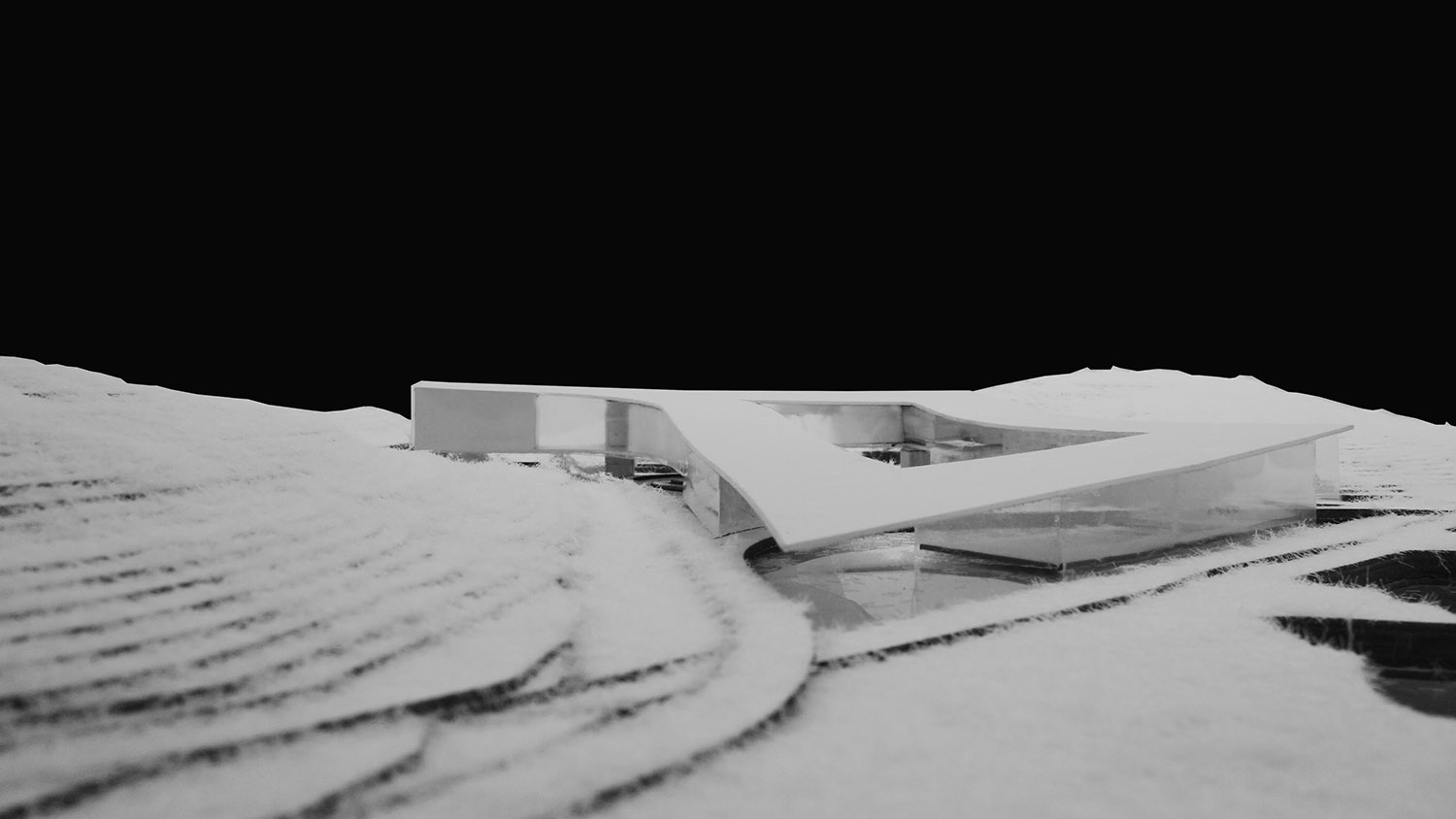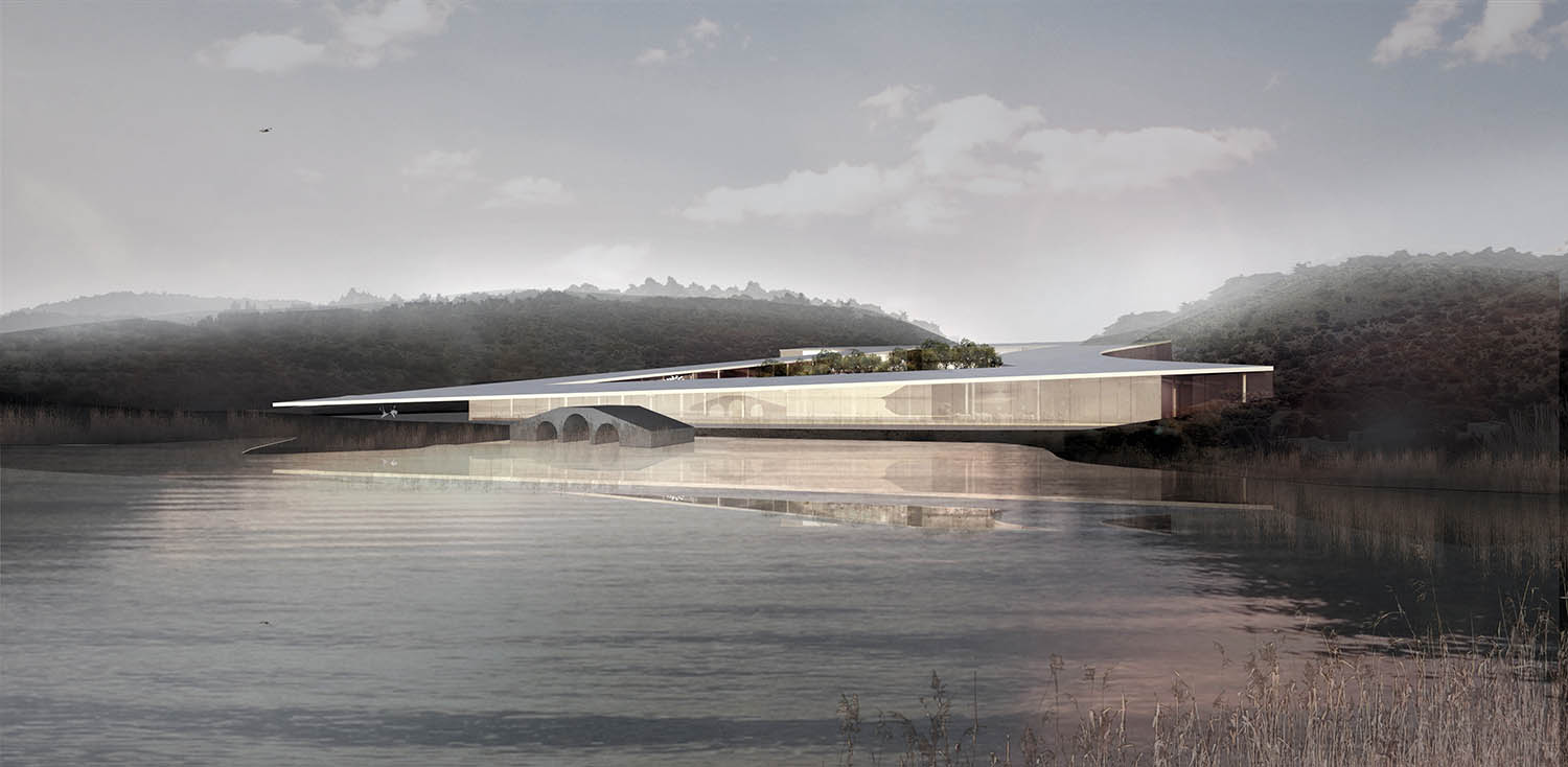 The sculpture gallery has a direct view to the reservoir; the cantilevered roof is designed to be low to form a long and narrow window that frames the landscape of the reservoir as an ancient Chinese scroll painting, as a result the landscape also becomes part of the artwork.