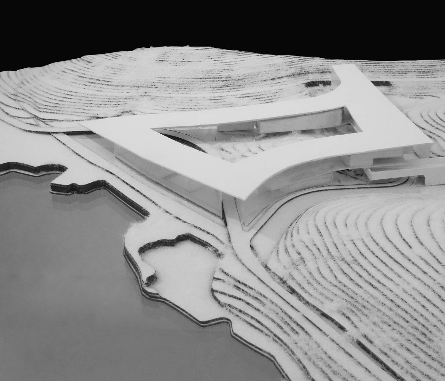 我们在初次进行基地考察的时候,发现由于原有的建筑拆除,使得基地出现了一个景观的缺口。我们在脑中想象了天然景观原有饱满的状态,并希望新的建筑可以跟自然结合的更为紧密一些,于是我们想要在设计酒店建筑的同时,填补了一部分已缺失的自然景观,使之成为建筑的一部分。