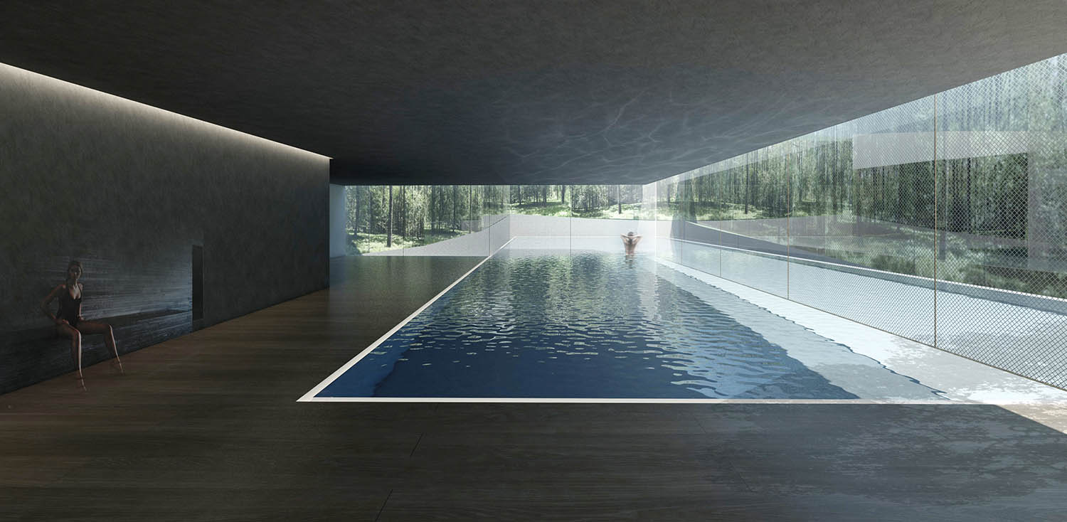 SPA、泳池部分置于建筑最为静谧的一角,并且部分“探入”自然二层的高度使得该空间完全被树木环绕,犹如在林中享受水疗的过程,以期让人能够在一进入该空间便能感受到来自大自然的善意和愉悦。