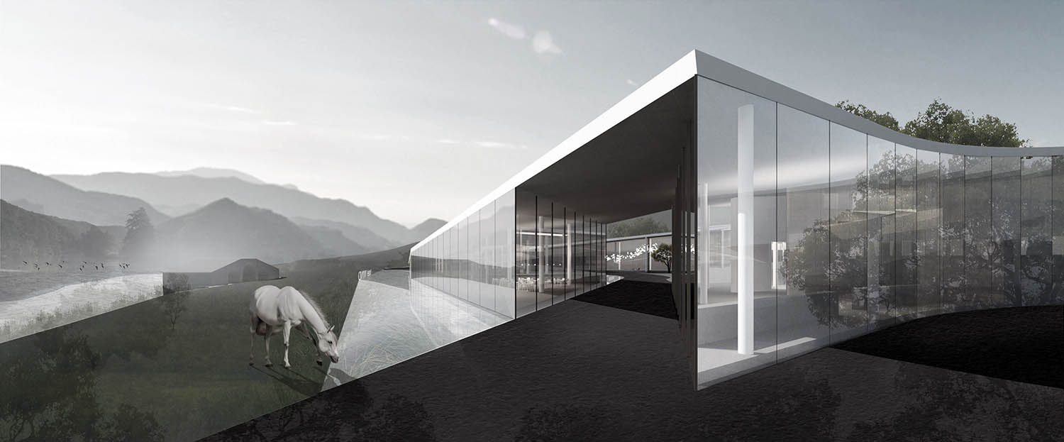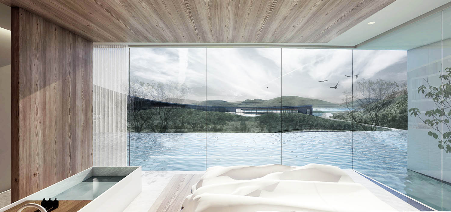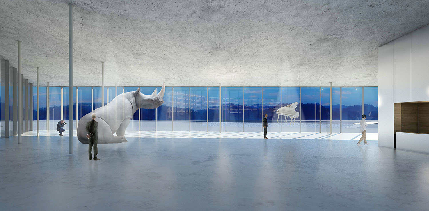 The “We Space” art gallery is the core of the hotel as we wanted to do something that is beyond the ordinary art themed hotel, and to literally create an art gallery with hotel rooms. The art gallery is divided into an enclosed exhibition space and a semi outdoor space. The curved, transparent curtain wall strengthens the relationship between the art work and the natural landscape, with the sacred atmosphere in this double-height space, visitors will have the chance to not only embrace the artwork, but also to meditate.