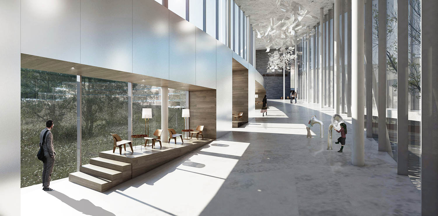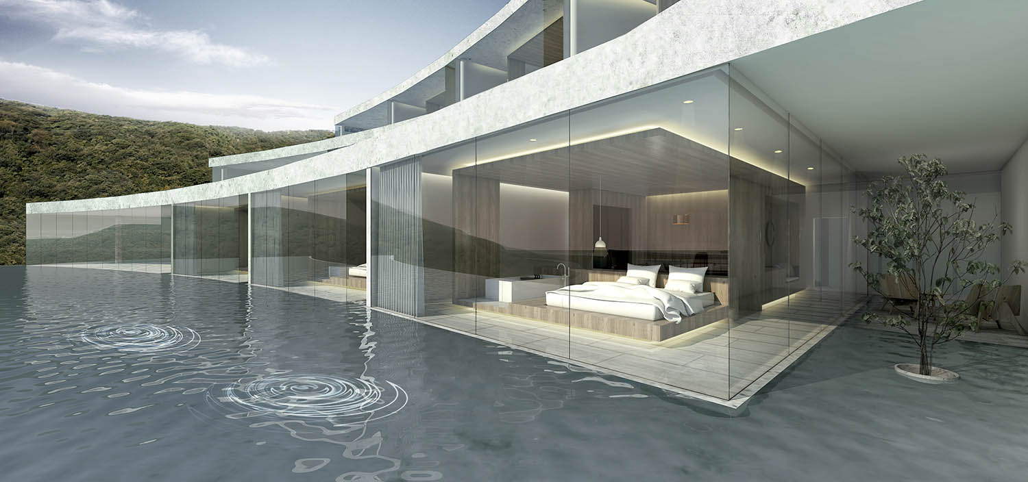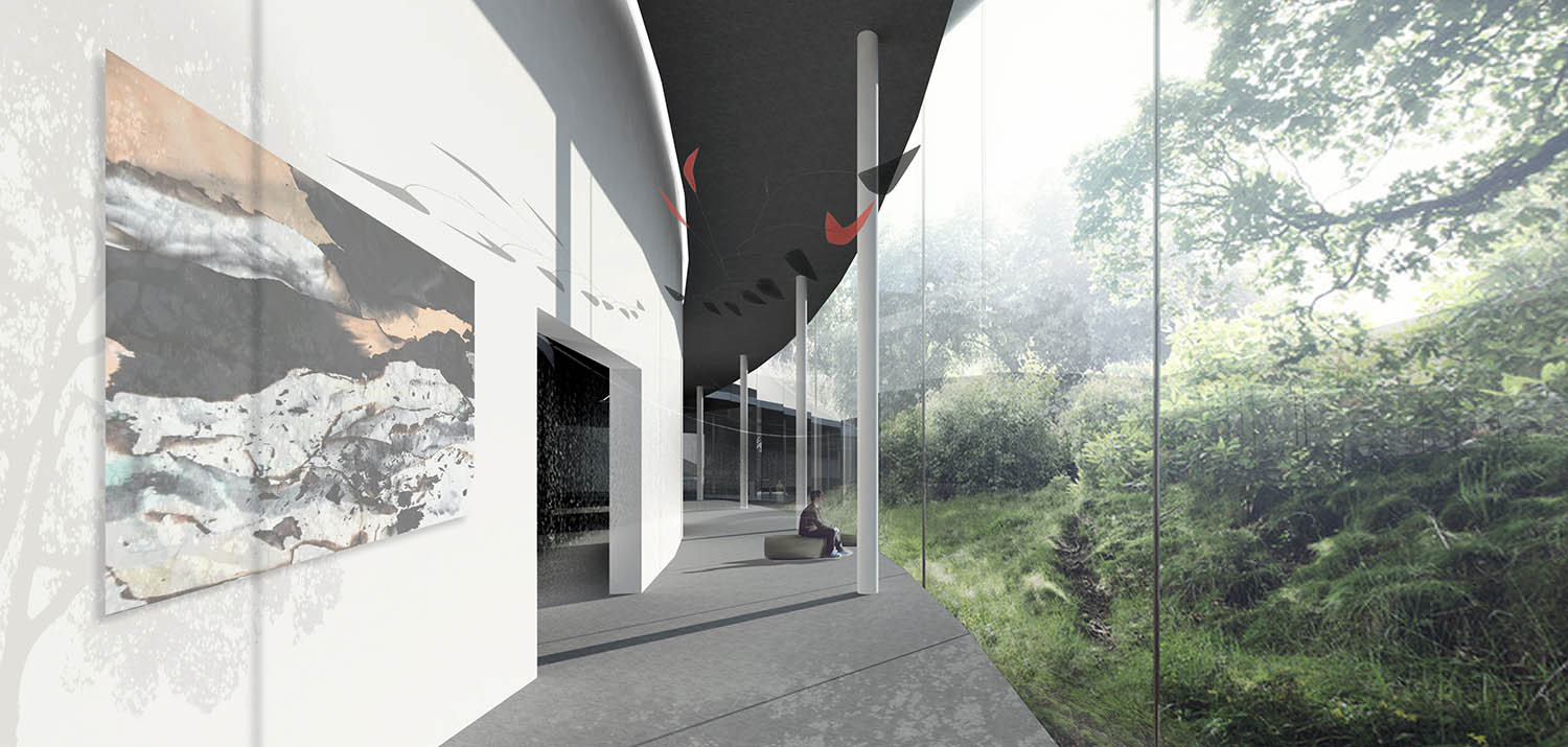 The “We Space” art gallery is the core of the hotel as we wanted to do something that is beyond the ordinary art themed hotel, and to literally create an art gallery with hotel rooms. The art gallery is divided into an enclosed exhibition space and a semi outdoor space. The curved, transparent curtain wall strengthens the relationship between the art work and the natural landscape, with the sacred atmosphere in this double-height space, visitors will have the chance to not only embrace the artwork, but also to meditate.