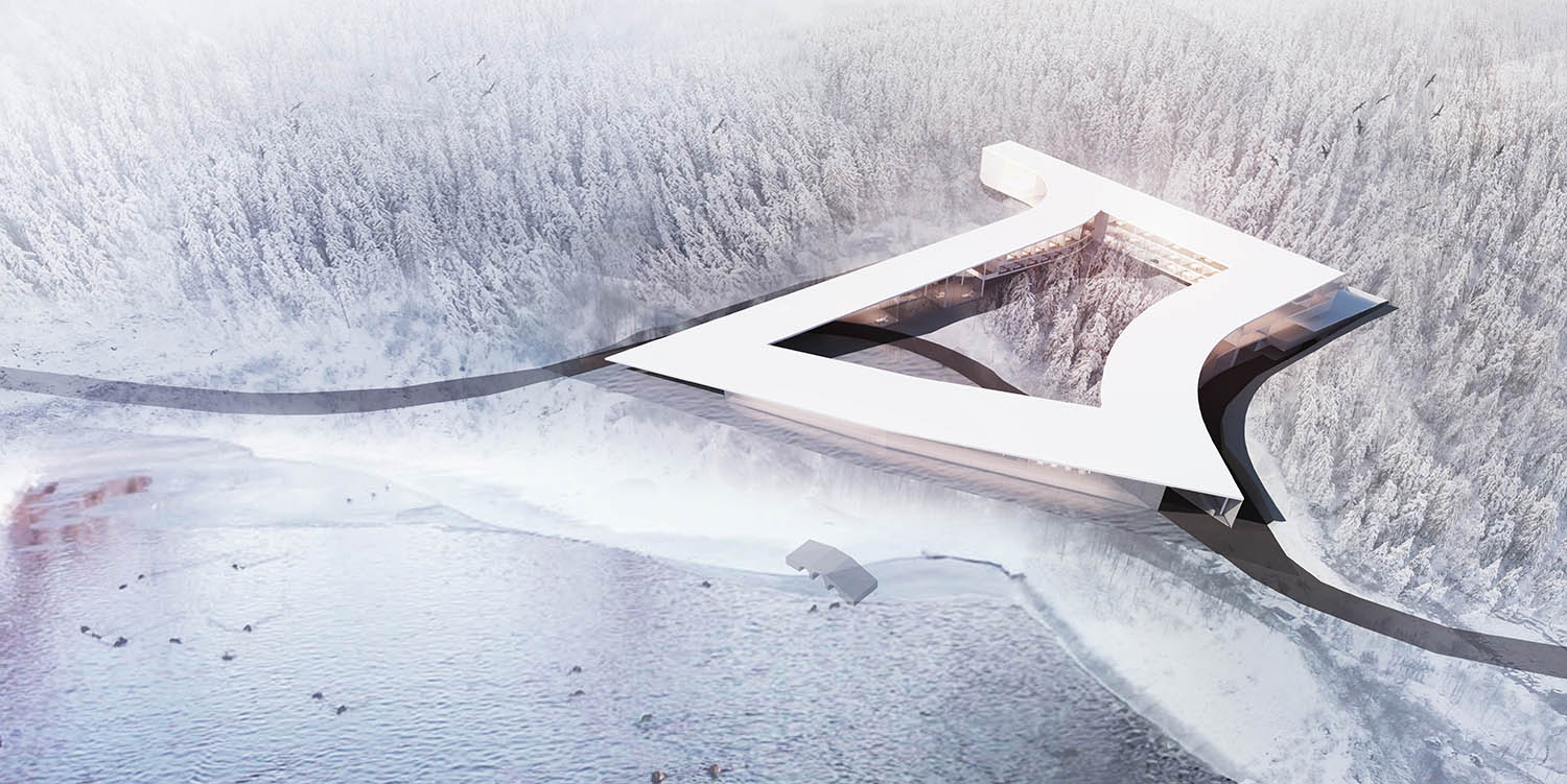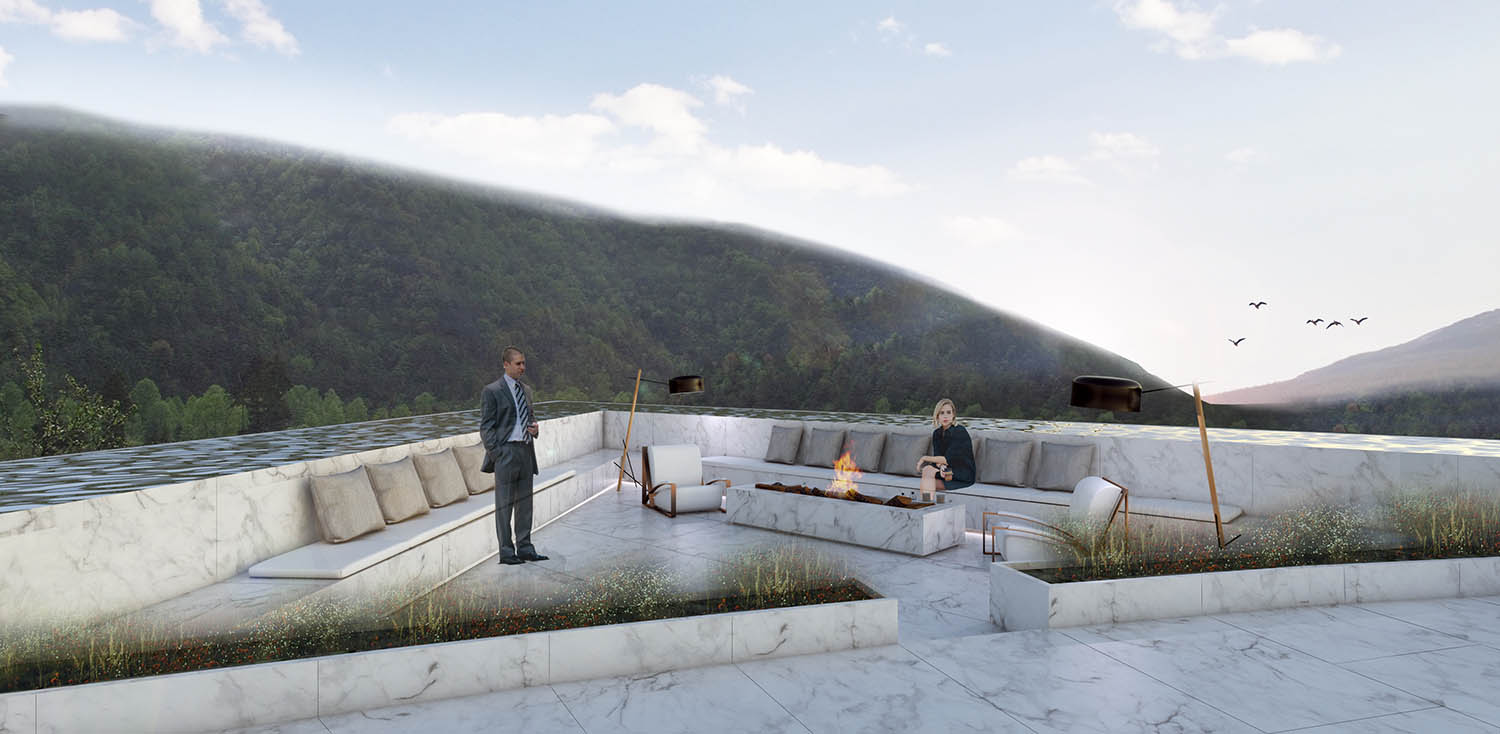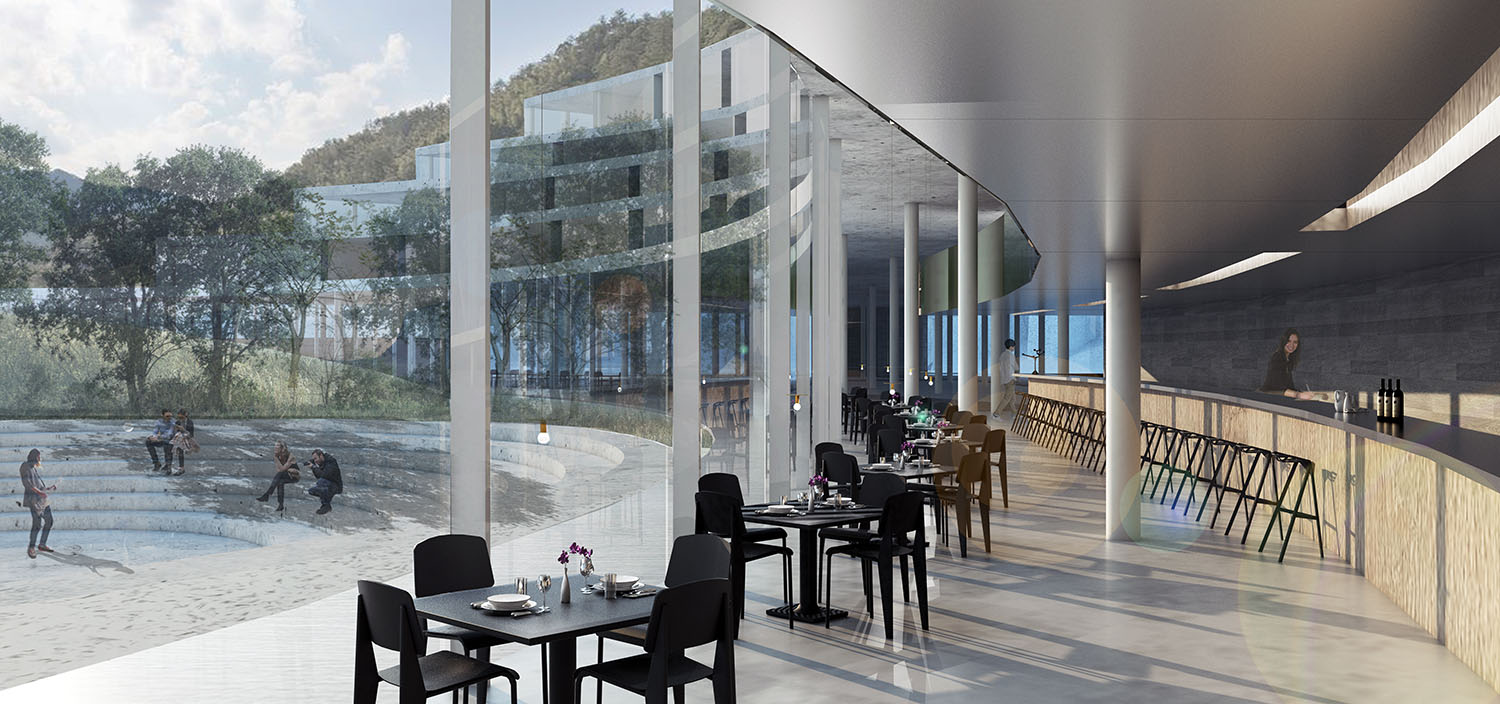 The current driveway is a two-way lane that is not quite suitable for future use for the hotel as it is too narrow. In order to attract people from the existing road to the art spaces in the hotel, the main road is widened, and was introduced into the perimeter of the hotel; drop-off area is covered thanks to this layout. In addition, guests will have the opportunity to wander in the inner courtyard of the hotel, as the pavement is surrounded by both mountain and water landscape. The service circulation is totally independent from the guest circulation.
