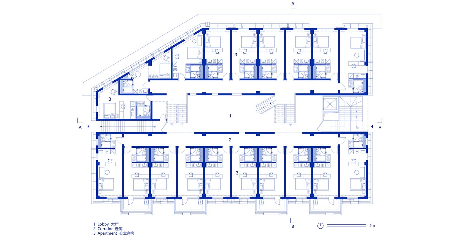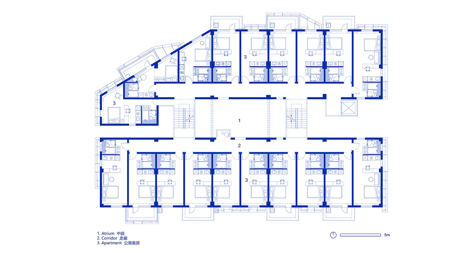 因此建筑内部改建的重心放在了院内的公共空间部分,同时重新划分房型的合理性也是我们着重下功夫的设计点。