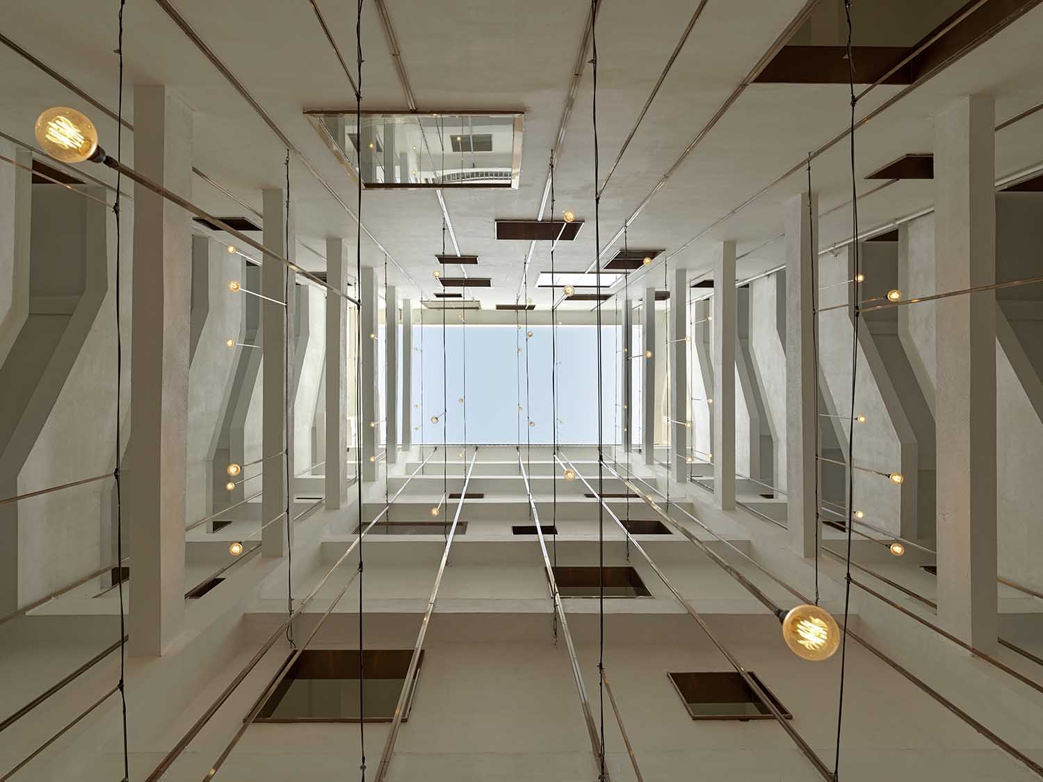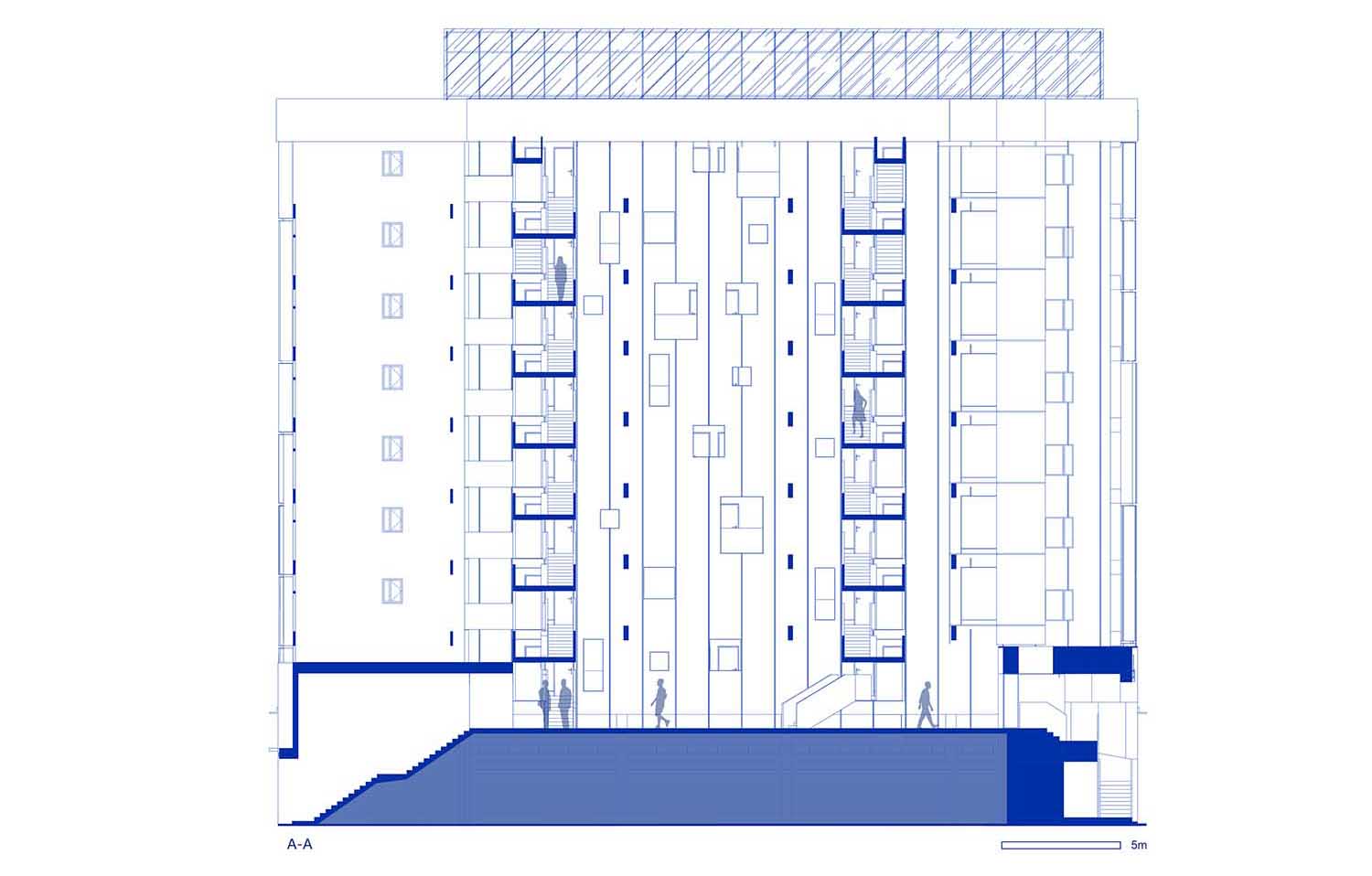 The design should keep the original structure of the building as much as possible and retain the three spatial levels from the private to the public areas in the original buildings, namely the connection of different house types at each floor, the three-dimensional enclosure of the staggered floor corridor and the staircase in front of houses, and convergence at the central courtyard. The interlayer between the skirt buildings along the street and the residents is filled with the gym, audio-visual rooms and other public spaces and the top terrace is set with sightseeing, drying and other recreational areas. At the entrance, the sightseeing elevator is added to reach each floor conveniently.
