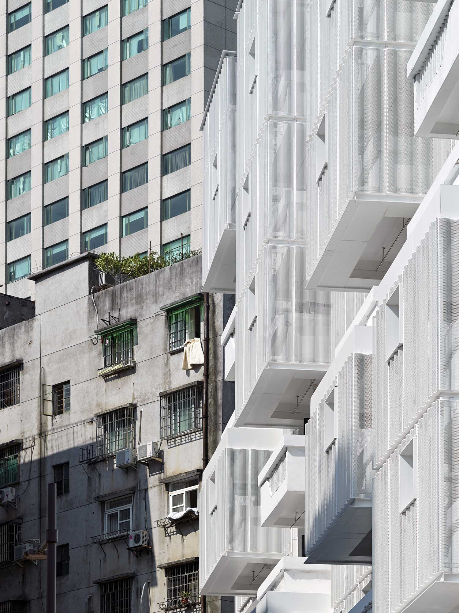 而背后与城中村内原有建筑的“对话”也突出了新与旧语言的对比,与周边大小建筑共生的状态强调了城市立面肌理层次的“拼贴”感。