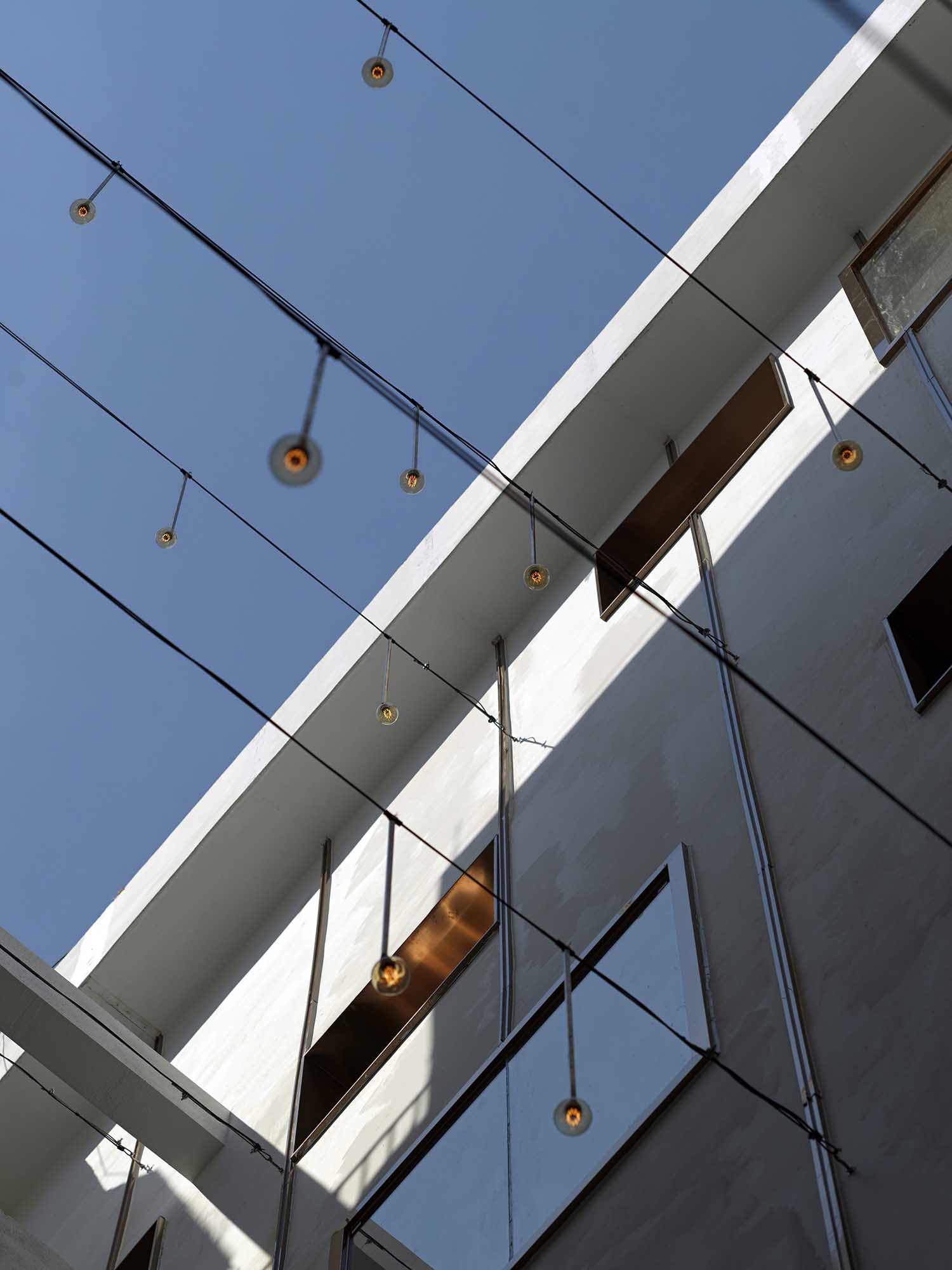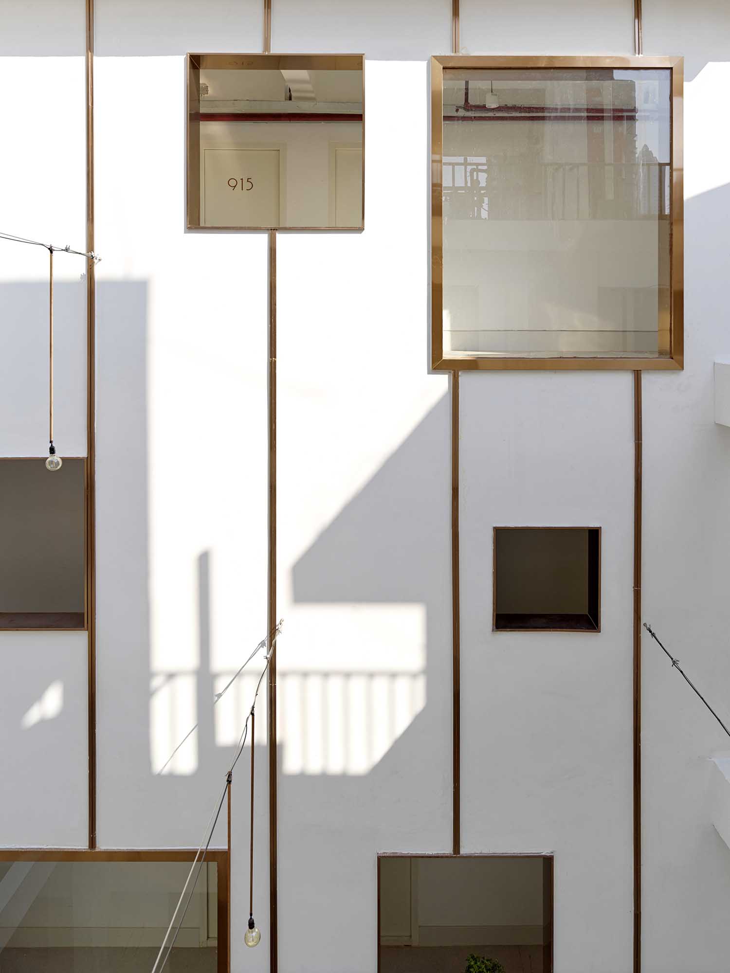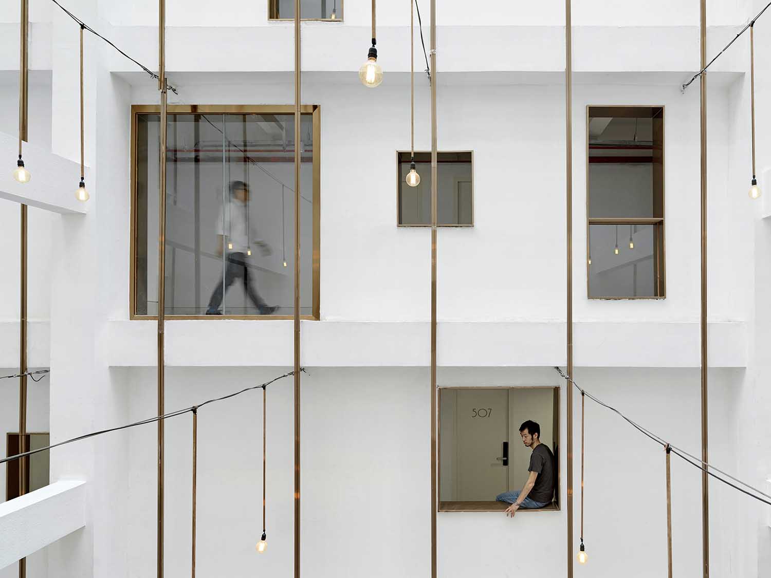 本次设计首先从中庭入手,清理院内的原有搭建,并整理空调和各类线管,以保证庭院的开敞度和舒适性。因地制宜,充分利用原建筑主要立体动线围合成的公共空间,通过视觉上内立面的趣味性营造,保证新住户在中庭及错层通廊的驻留度。