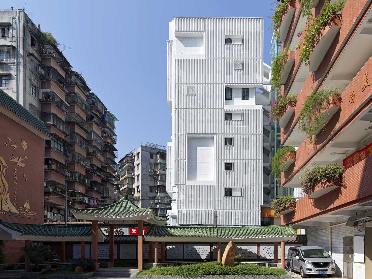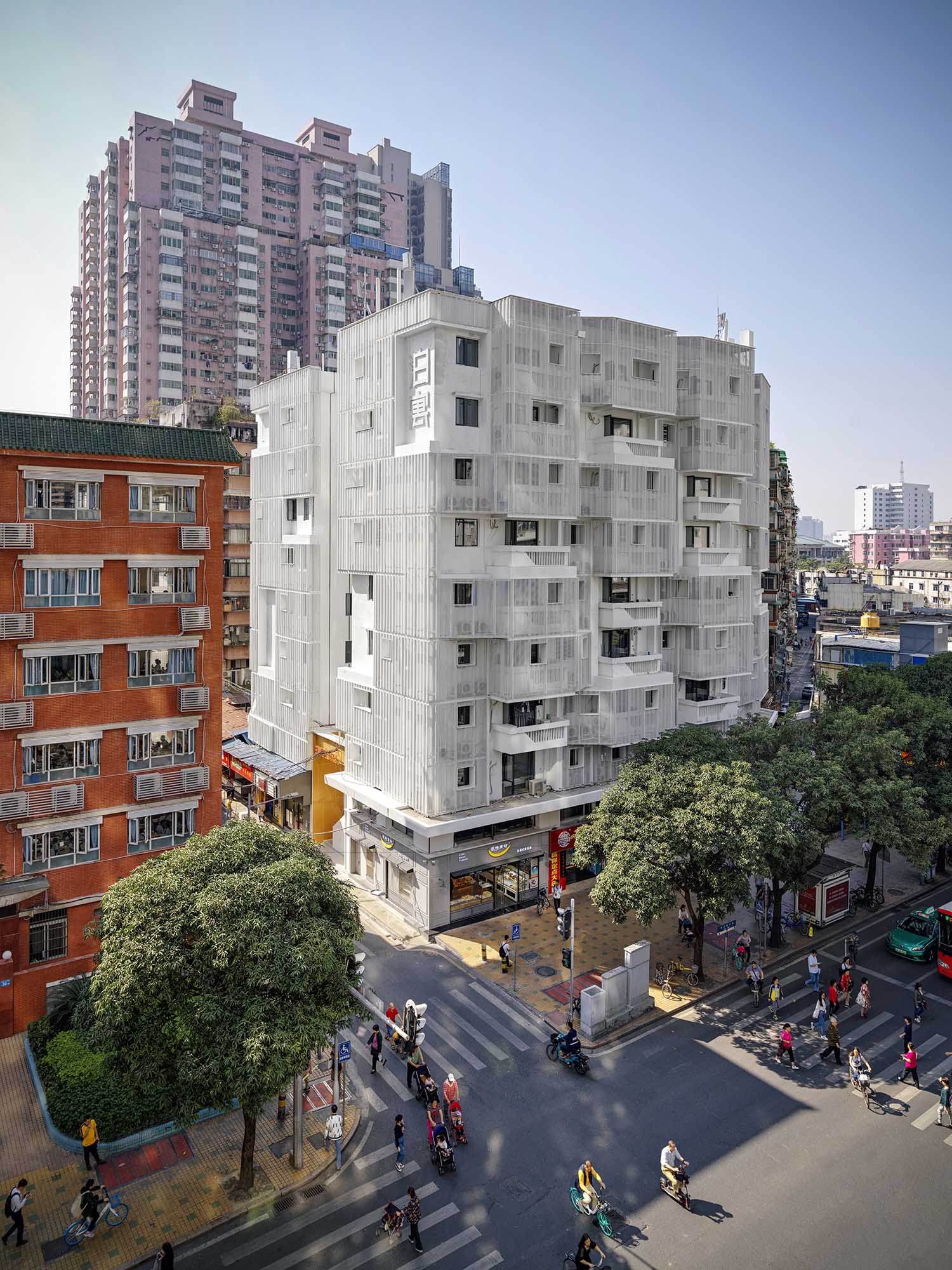 The "dialogue" with the original buildings in the urban village behind also highlighted the contrast between the new and old languages, and the symbiosis with the surrounding buildings of big and small sizes emphasized the sense of "collage" of the texture level of the city facade.