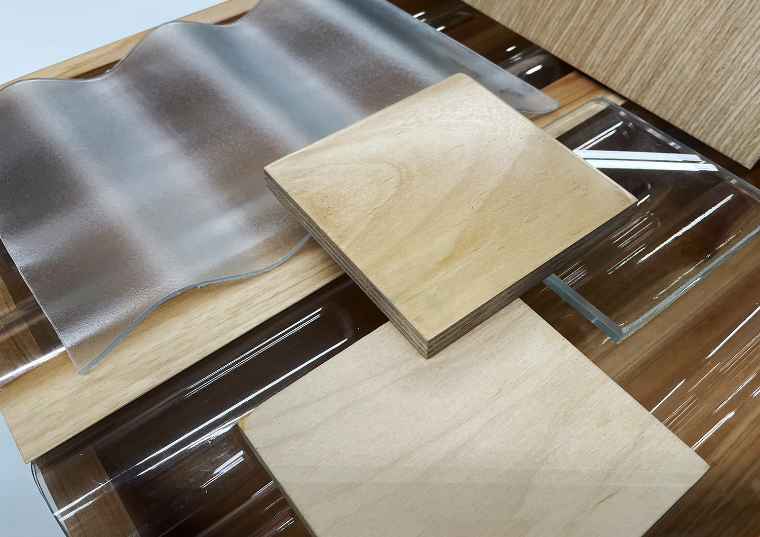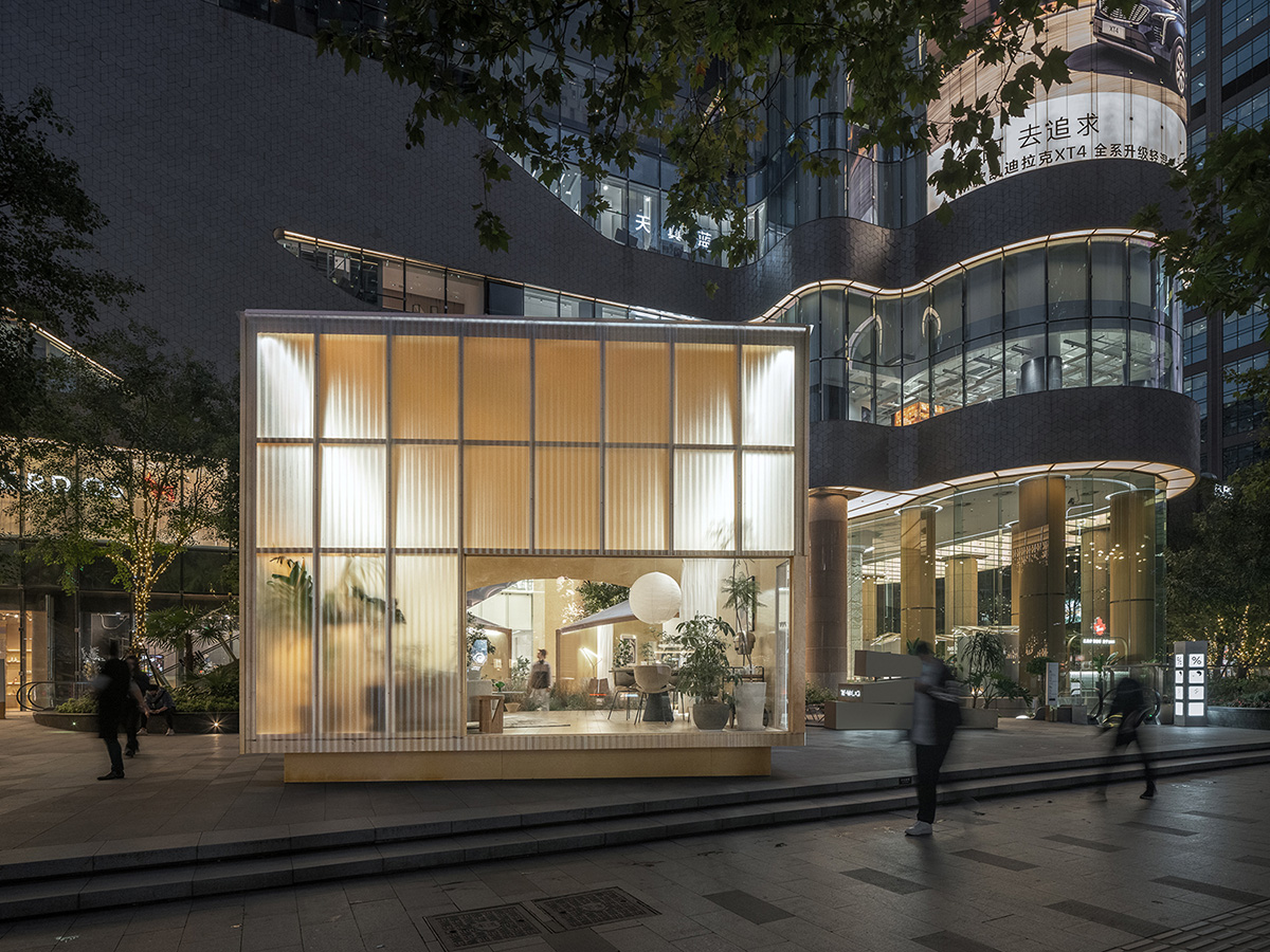 Plywood and the frosted corrugated panels give the installation facade a contrast and a fusion of inside and outside, real and virtual, between the two planes. By reversing the structural design to expose the keel, the interior facade is tidied up, while the vertical keel reflects the vertical growth pattern of the trees around the base. In addition, the three rooms have additional window openings at certain points on the facade to enhance the feeling of permeability and bring more natural light inside. Several coherent visual bands are formed between each group of window openings. The atmosphere of "home" is released and overlaps with plants and urban scenes that arouse curiosity and imagination of passing "spectators".