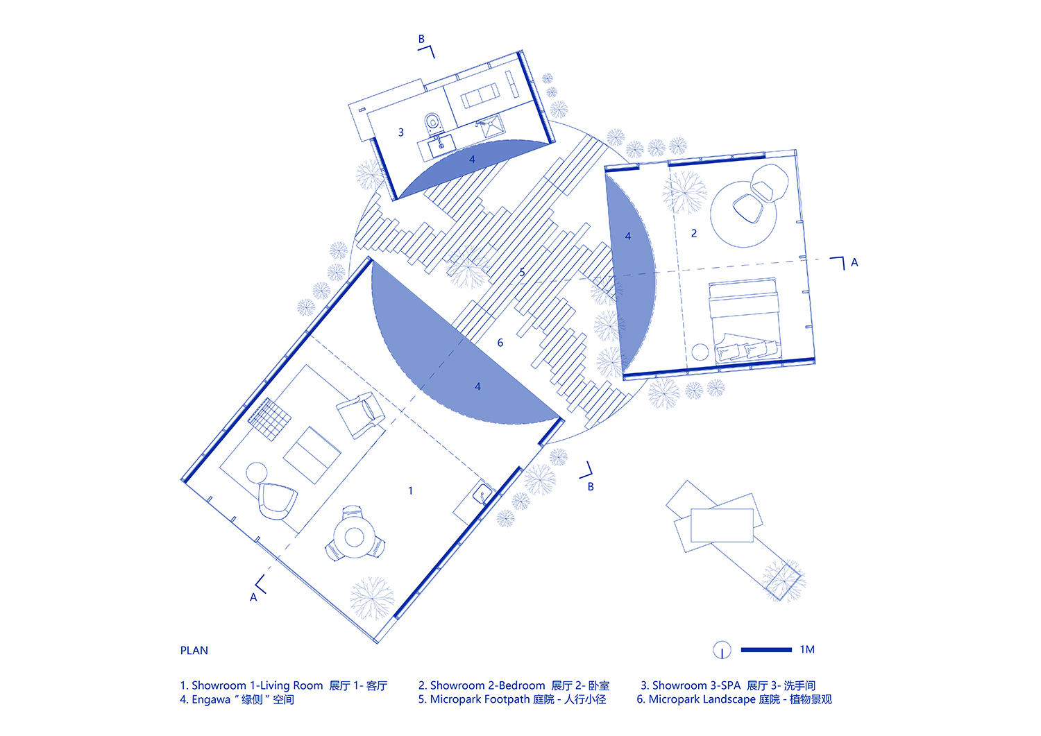 另一方面,如何营造私密与公共的关系,是一个相当吸引并值得思考的问题。日本传统住宅内的“缘侧”给了我们启发。建筑师黑川纪章曾讲到:“缘侧作为室内与室外之间的插入空间,是介乎内与外的第三域。它既不割裂内外,又不独立于内外,而是内与外的一个媒介结合区域。”设计首先将各空间抬高了0.45米,其次借3.5米半径圆切割出三道弧顶,形成了覆有顶盖却相对开敞的檐廊空间。自然与家在檐廊下相互捕捉、相互渗透,维持了良好的平衡关系。