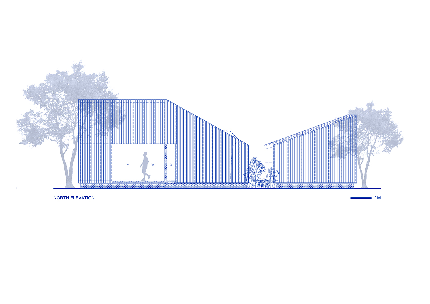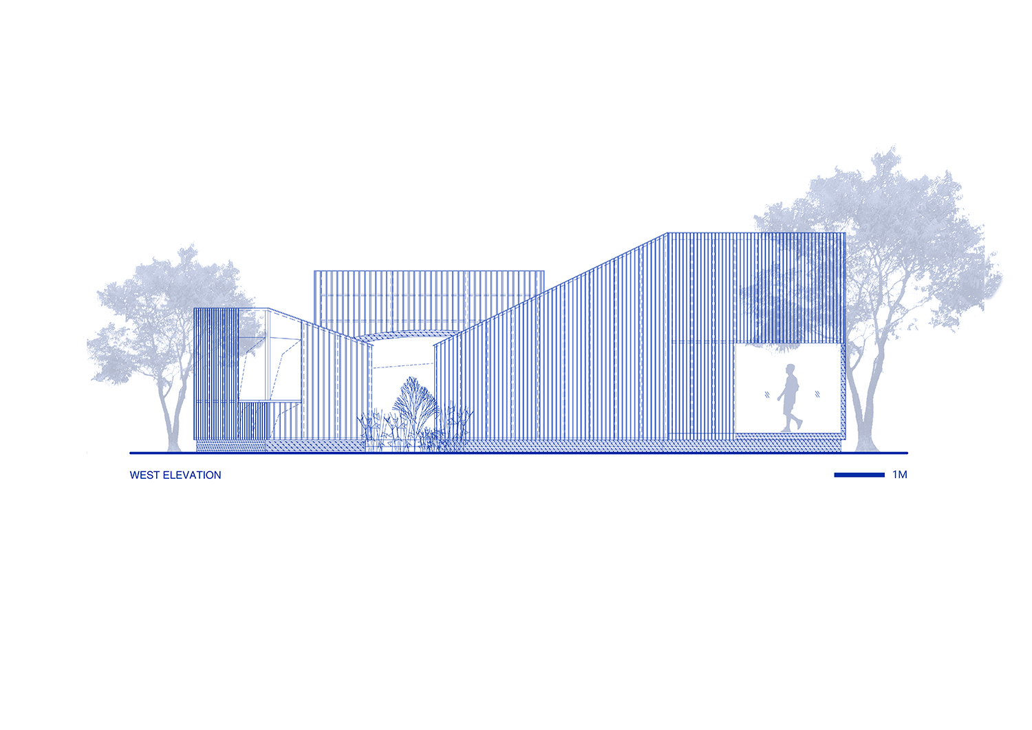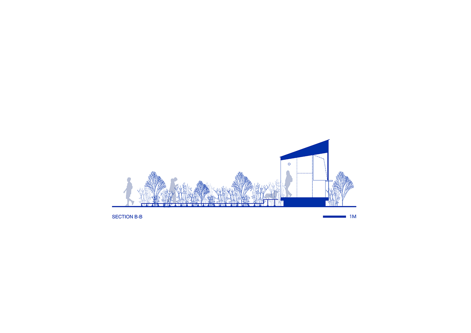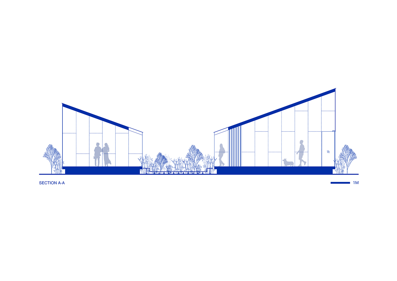 由于基地内原本就有着多条相互交叉的人行路径,建筑师便将既有动线作为切割空间的手段,划分出三个相对围合的初始体量。我们将解构后的“家”的三个基本空间:厅、室、卫分别置入其中进行重构,并随功能的不同,在面积上生出了小、中、大的差异。继而依照环境旋转角度,使其兼顾动线与沿街立面的视觉穿透性。另一方面,设计考量了人体对厅、室、卫的不同体感与私密性要求,使各空间产生相应的高差变化。在限高条件下,层高最高点为5米,最低为2.45米,三个坡屋面不仅形成了“家”的向心性,且满足了将雨水汇集至绿植内院的功能。“家”的各部分与三个主要出入口无硬性阻拦,人群环绕或进出,在装置内外留下交错的足迹。