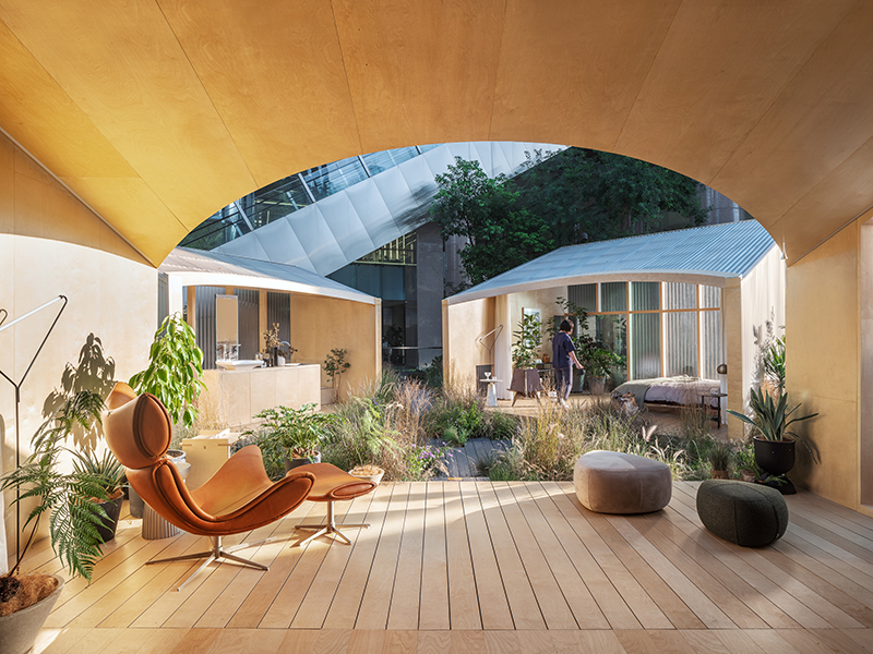 As people move from "home" to "home", nature flows thanks to the blurred boundary of the installation between inside and outside. A variety of small shrubs and trees thrive in a controlled manner under the eaves, providing a sense of "pro-life" enjoyment. The interior reduces the decorative language to a minimum and lets light, plants and furniture elements be the protagonists of the space. When the design erases the fourth wall of the house, the translucency of the installation brings in daylight during the day and blurred shadows of light at nightfall. In this way, the different depths of the living room, bedroom and bathroom can be interpreted and experienced several times. With the help of the calm and warm atmosphere, the "PARKLIFE" can reinforce people's idea of a home and a way of living, and experience the "infinite" life in a limited space.