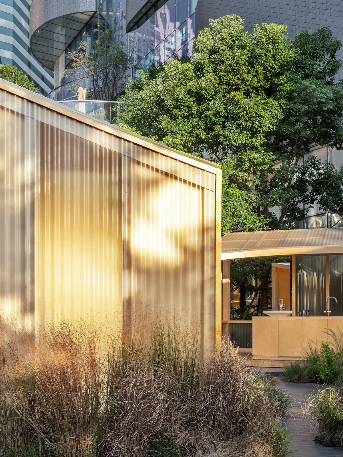 The shape of PARKLIFE is surrounding but not closing, which helps to reduce the noise of the outside world. When you sit down in Engawa space, the wind chimes ring in your ears, and the flowers and plants of the garden are simply at people's feet. Viewed from above, the various parts of the "house" are closely connected to the micro-park through the colonnade, as if "embracing" each other and giving comfort to the people.