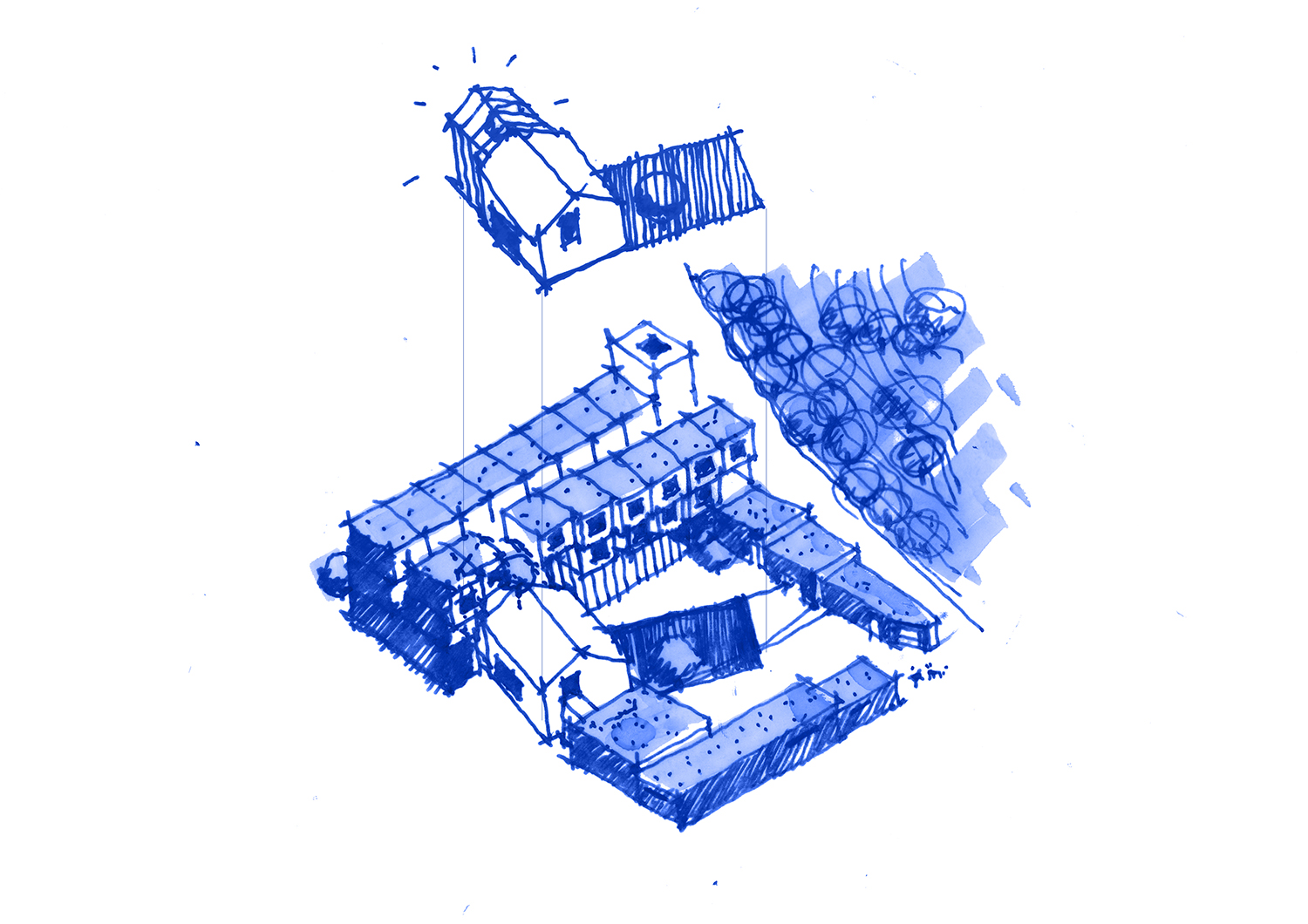 原本三层主建筑为红色瓷砖外墙,其余几栋为白色涂料,旧建筑并未与自然很好地衔接,甚至几栋建筑之间都存在着对立感。若想改造后的建筑融于环境,可以通过更换外立面材质和颜色来实现,但这样的表达过于直白,甚至有些无趣。由此我们想到了甲方提出的"真实的空间"这个要求,所谓融入是否也可以是由使用习惯为核心来形成呢?