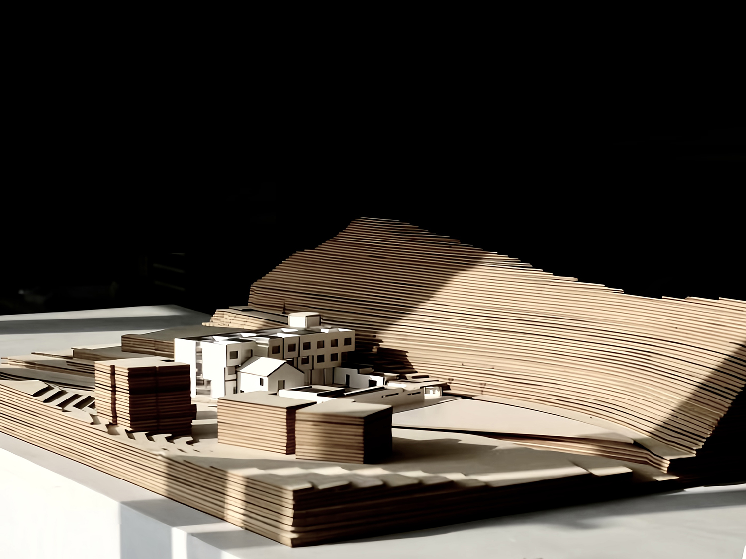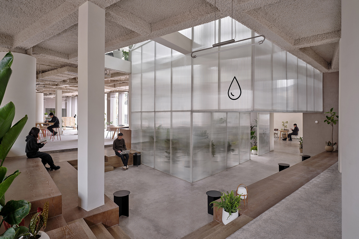 The project's initial structure is a three-story half-frame building with an attached double-sloped roof chamber and a few single-story podiums. The enclosed factory buildings are connected to each other and have roof heights that decrease from east to west. Originally, this spatial arrangement was meant to accommodate the water plant's production and transportation lines while also being in keeping with the topography in the area. The site's north side has a creek that gurgles during the time of abundance, and its south side is near to a mountain with a varied range of biological species. The owner has assigned a simple design challenge. There are just two requirements in addition to fulfilling the space's numerous functions: the desire to blend in with the surroundings and the desire to create "real space".