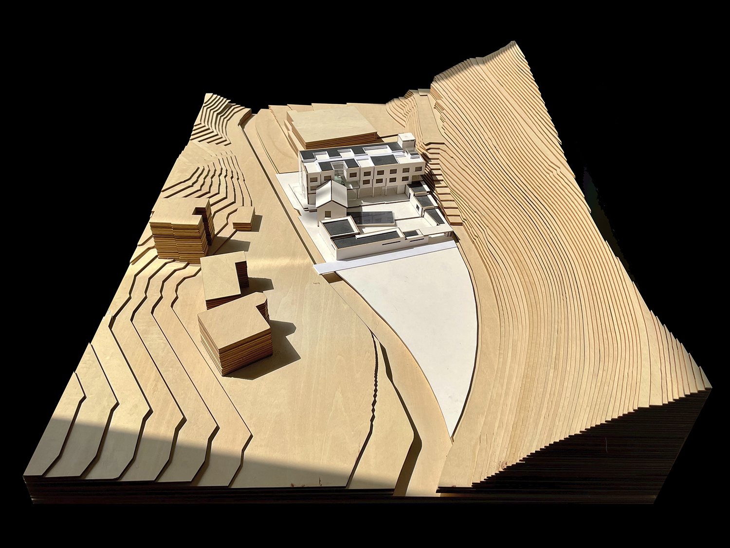 业主希望在主楼中放置一个以"水"为主题的展览空间,且其中的展品形式是多元的。受周边环境启发,我们以植物来表达水这个概念。设计将双坡屋顶房进行等比缩放后"生长"入主楼,筑出一间高约7米的温室,贯通三层,容纳植物并作为展厅。充足的自然光透过天窗照射至阳光板构筑的温室上,形成折射与散射,在一天当中呈现不同的色调与氛围,保证了植物耐活性的同时,也使温室作为整个项目的"内核"更为通透醒目。同时,设计将主楼西侧立面解构为11个单元,以温室为焦点形成向内层叠延伸的墙面构成,看似被"温室"的生长动势所挤压,也呼应了整体建筑的"梯田"形态。