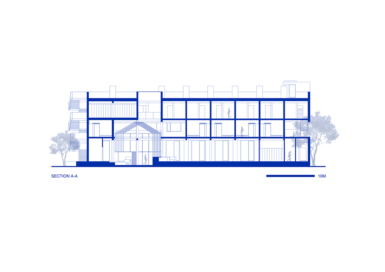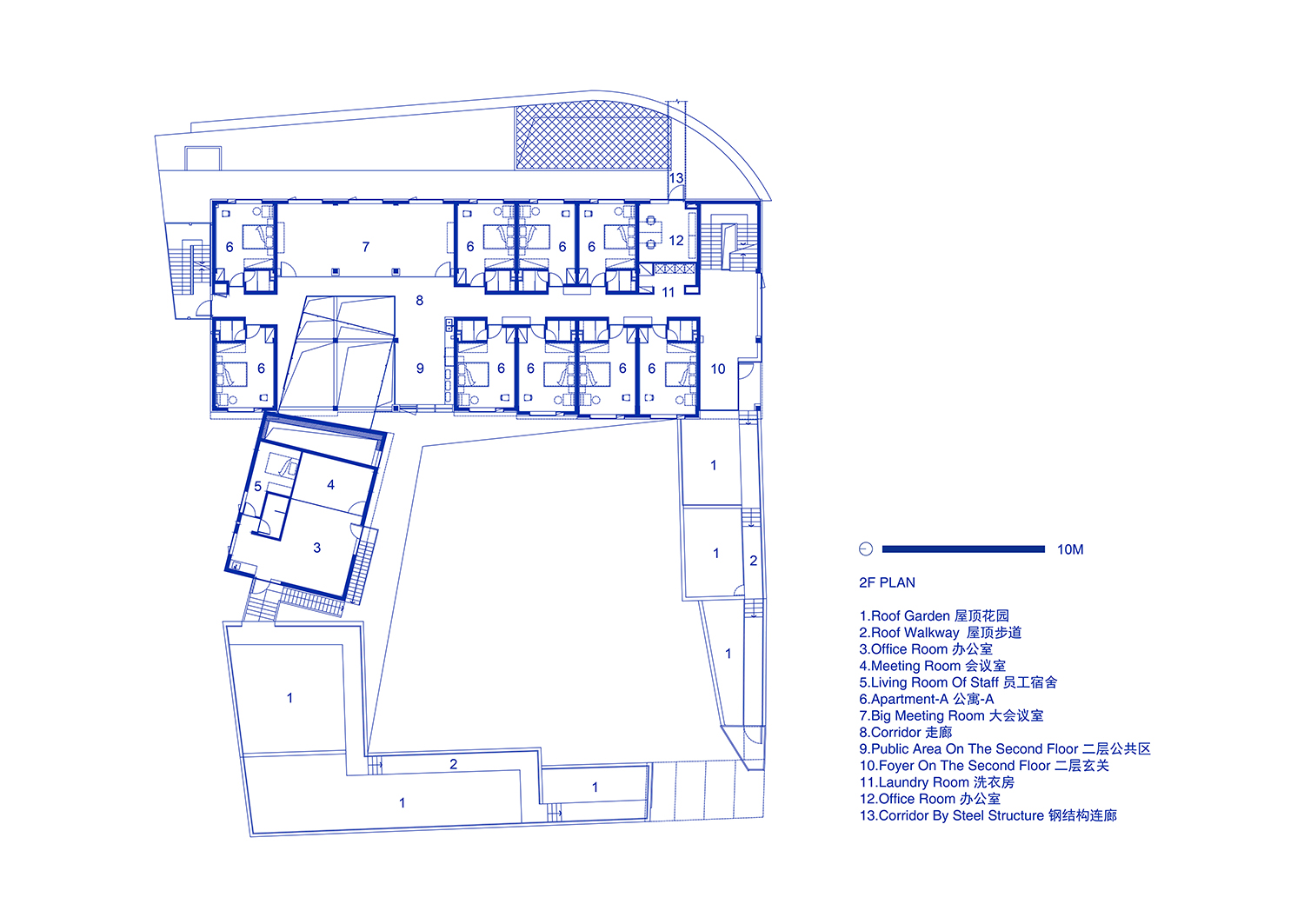 在这个面积两千平米,却承载了多种功能的场所中,如果将进入建筑的人群按目的分类,可能会有:办公、就餐、参观、集会、烹饪、工作坊、长租、短住等若干种。通过空间划分和动线归置也许可以让几股人流尽量互不打扰,但却一定程度上破坏了这个随机社群的共有性,违背了"真实的空间"的设计初衷。