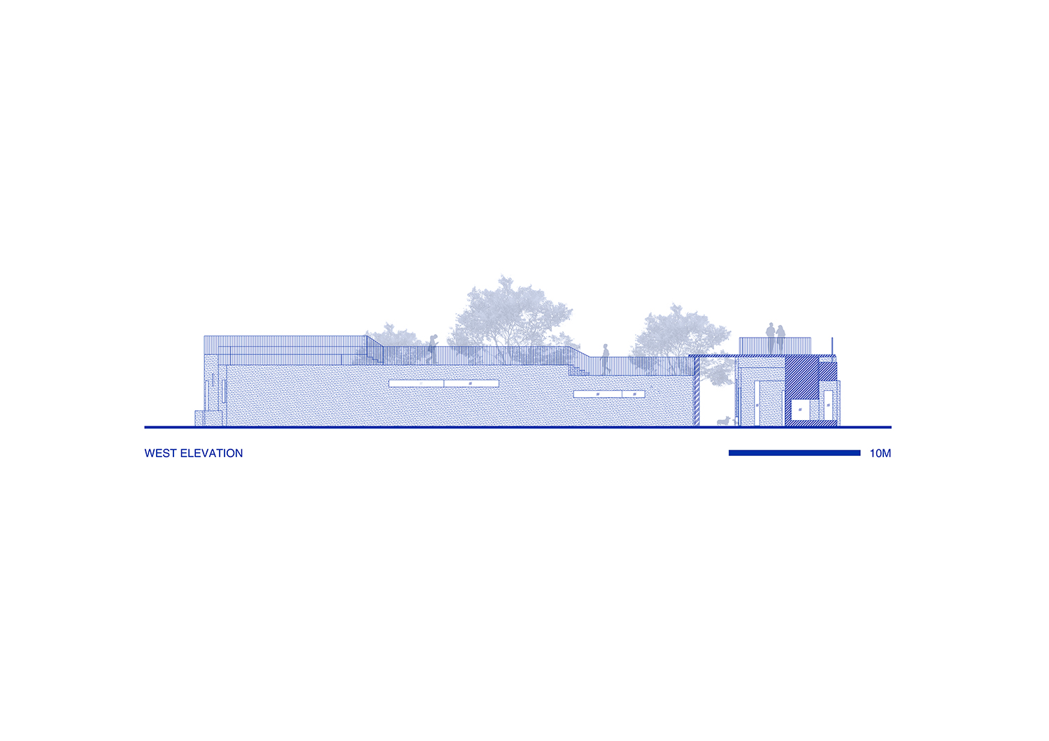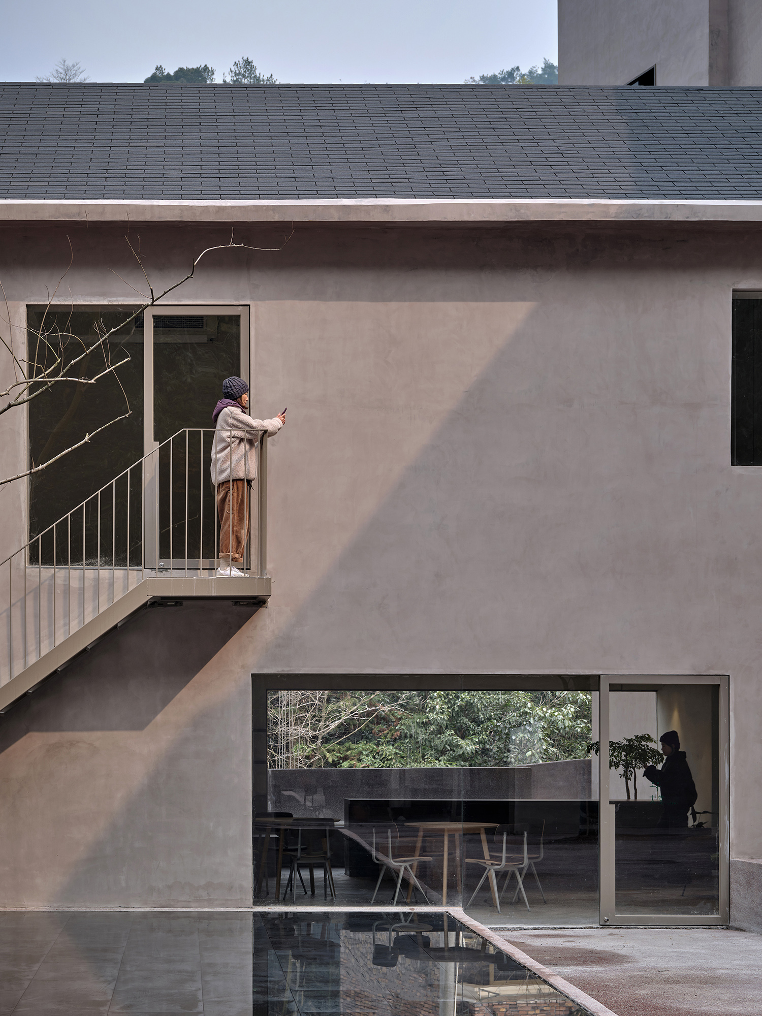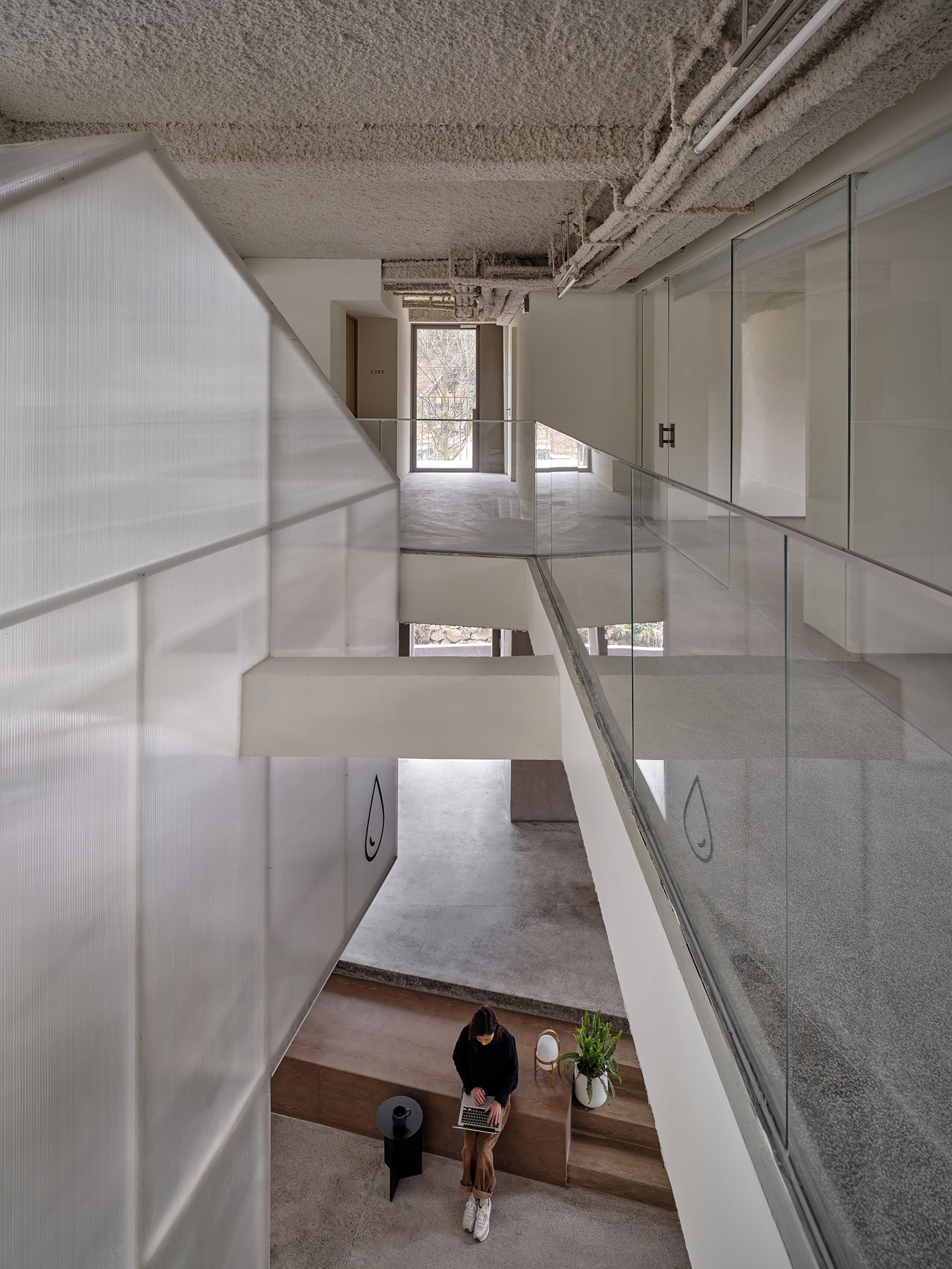 The client hopes to place an exhibition space with the theme of "water" in the main building, and the exhibits in it will be diverse. Inspired by the surrounding environment, we take advantage of plants to represent the idea of water. The design scales the double-slope roof house proportionally and "grows" it into the main building, creating a greenhouse about 7 meters high that runs through three floors to accommodate plants and serve as an exhibition hall. Sufficient natural light penetrates through the skylight onto the greenhouse constructed of polycarbonate sheets, causing refraction and dispersion, which creates a variety of tones and atmospheres throughout the day. This ensures that the plants are resistant to activity and also makes the greenhouse as the "core" of the entire project more attractive and transparent. At the same time, the design deconstructs the west facade of the main building into 11 units, with the greenhouse as the focus to form a wall composition that cascades and extends inward. It seems to be squeezed by the growth momentum of the "greenhouse", echoing the overall "terraced" form of the building.