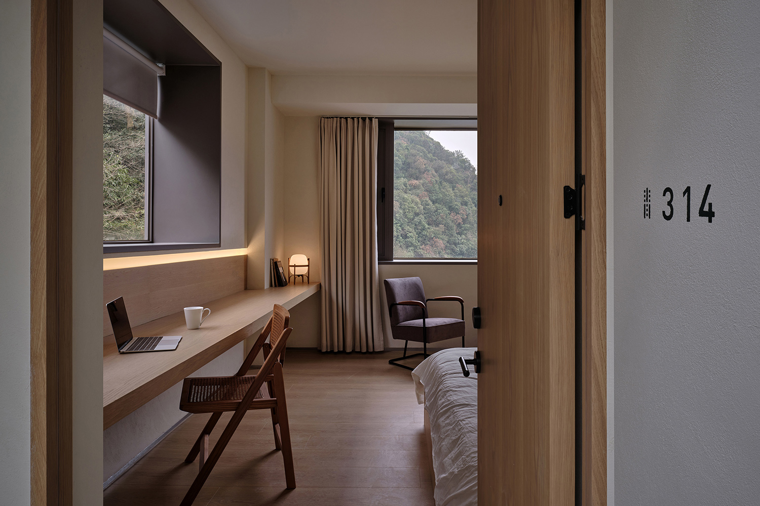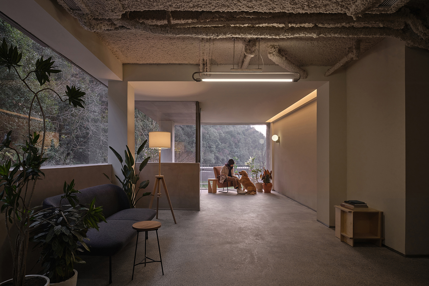 The first floor serves as a shared office space, it provides as many glass curtain walls as possible on the east and west sides to replace the original walls. More variations in light and shadow may take place in this area, and convection and ventilation are able to produce a spatial environment that connects the inside and the outside. On the second and third floors, two leisure spaces close to nature are created at the end of the guest room corridor by opening the wall and ceiling on the south side.
