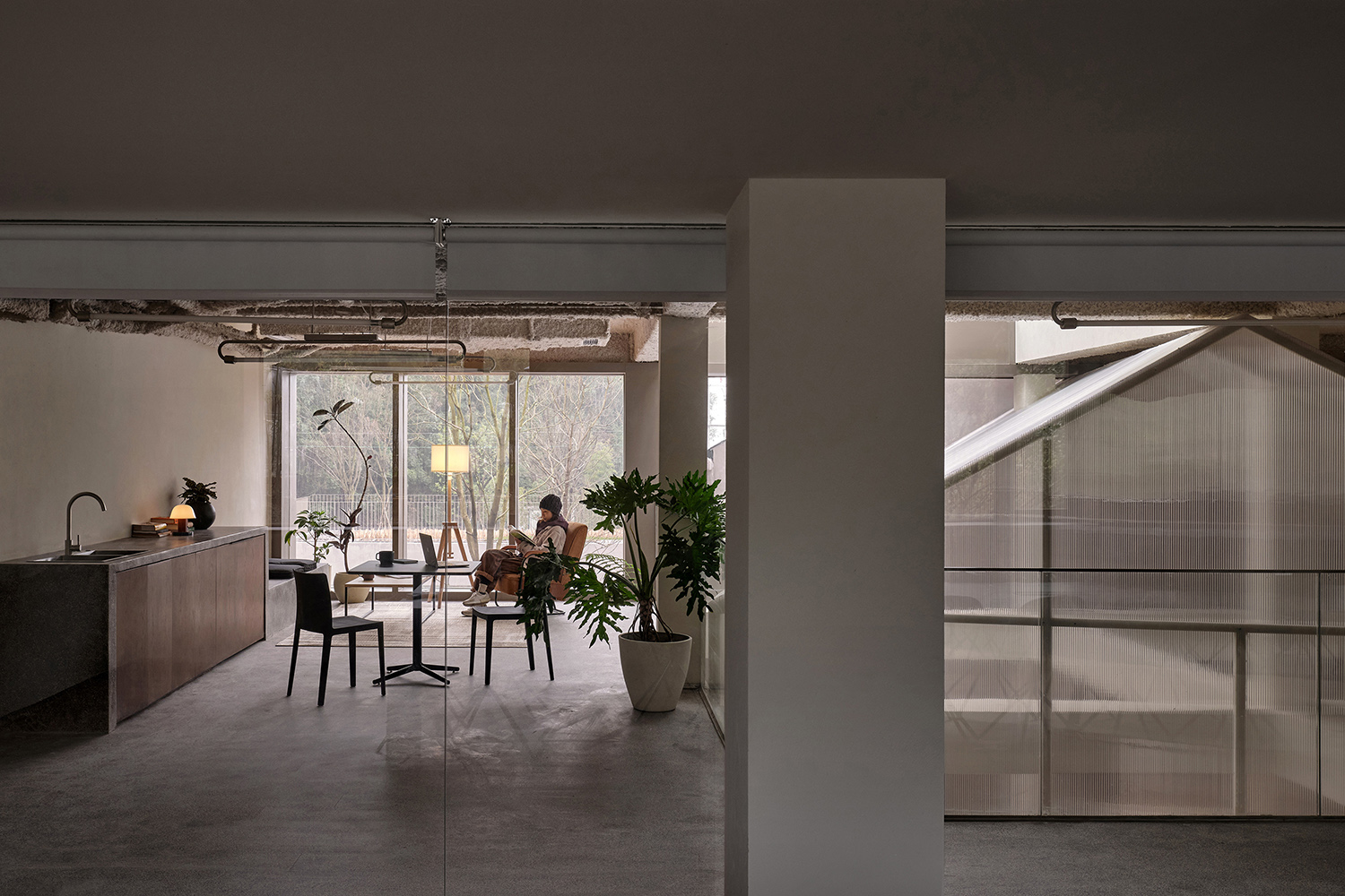 我们将人群按照对私密性的要求等级进行了排列,除等级最高的主楼二、三层23间客房外,各公共空间都相应给予了一定的自由度。如主楼一层,既有刷卡进入的共享办公区,也有对外开放的展厅阅览区,但两个空间视线上却是联通的,仅以绿植做阻隔。而整个共享办公区,除两间会议室之外,皆为开敞的连续空间,只通过地面的抬高与下沉划分场地,且对每个区域的具体功能不做约束,使用者甚至可以自行改变格局。