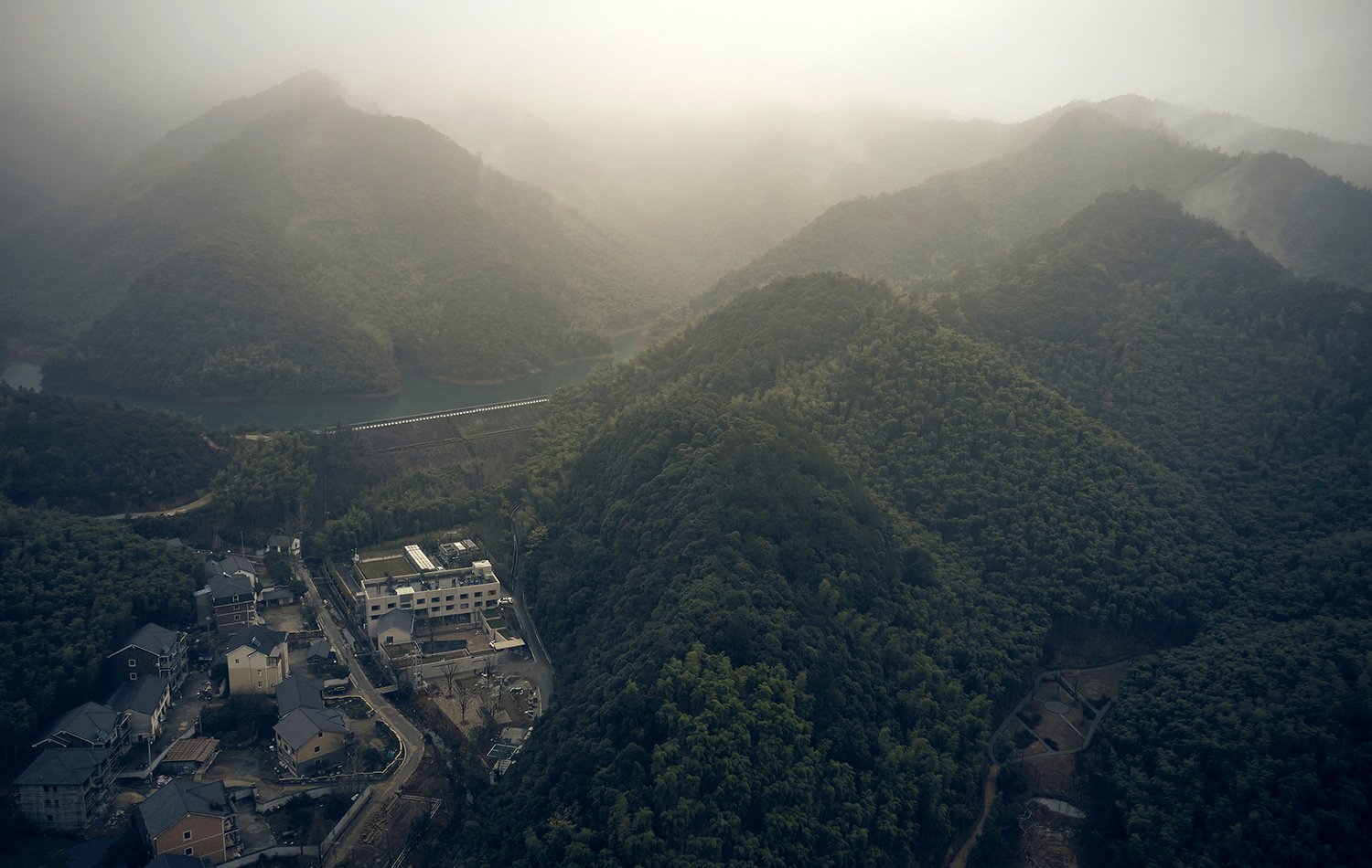 虽然村内已几乎看不到传统乡村建筑,但依水而聚的自然村落肌理却被很好的保留了下来。沿着水系逆流而上,几个自然聚落的农田、房屋交替经过,遂见竹林掩映、道路渐窄。行至山腹处是村内最为重要的水源地:龙坞水库,而水库前的最后几栋建筑便是青年社的项目基地。
